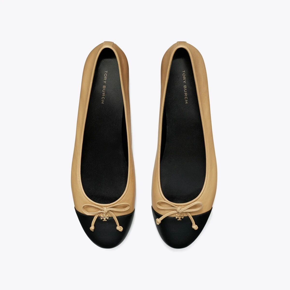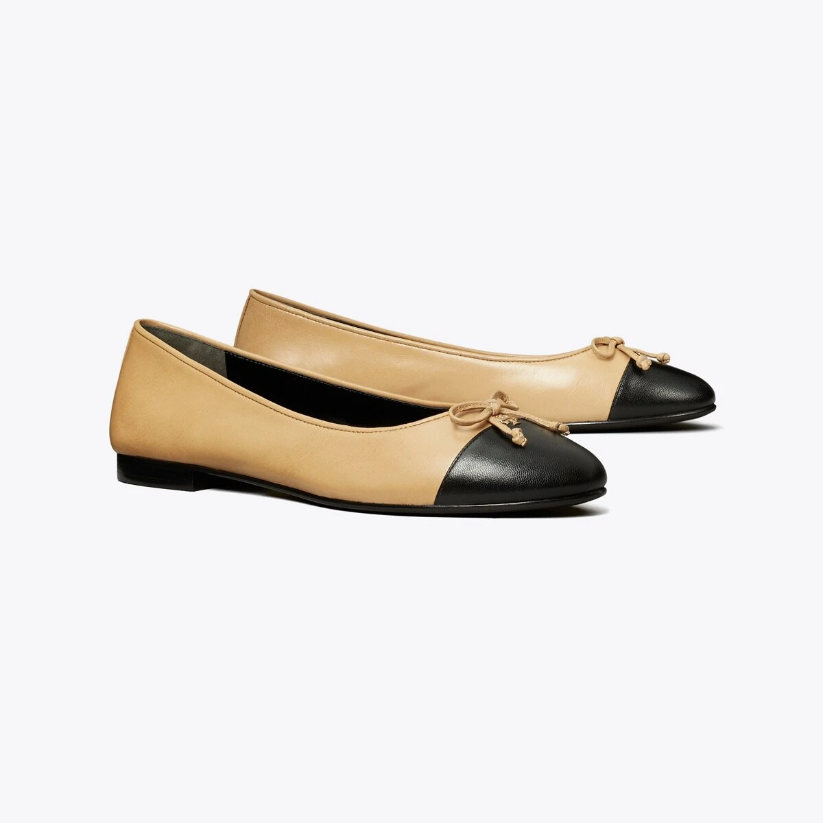 A classic ballet flat crafted in fine leather is finished with a contrast cap-toe and embellished with a bow. A subtle Double T initiates the elegant style as a new brand signature.