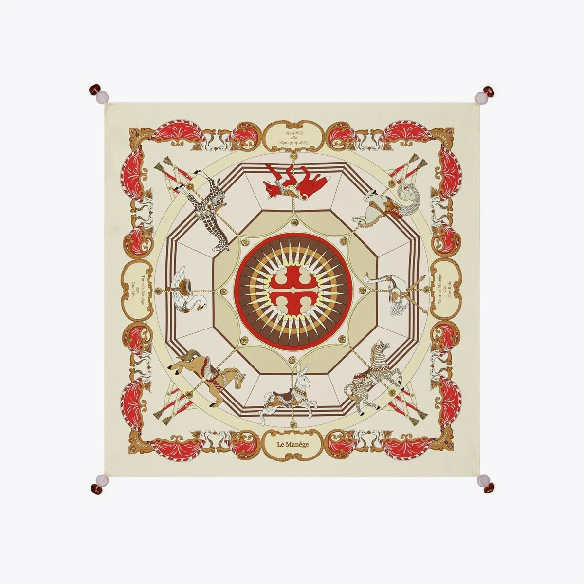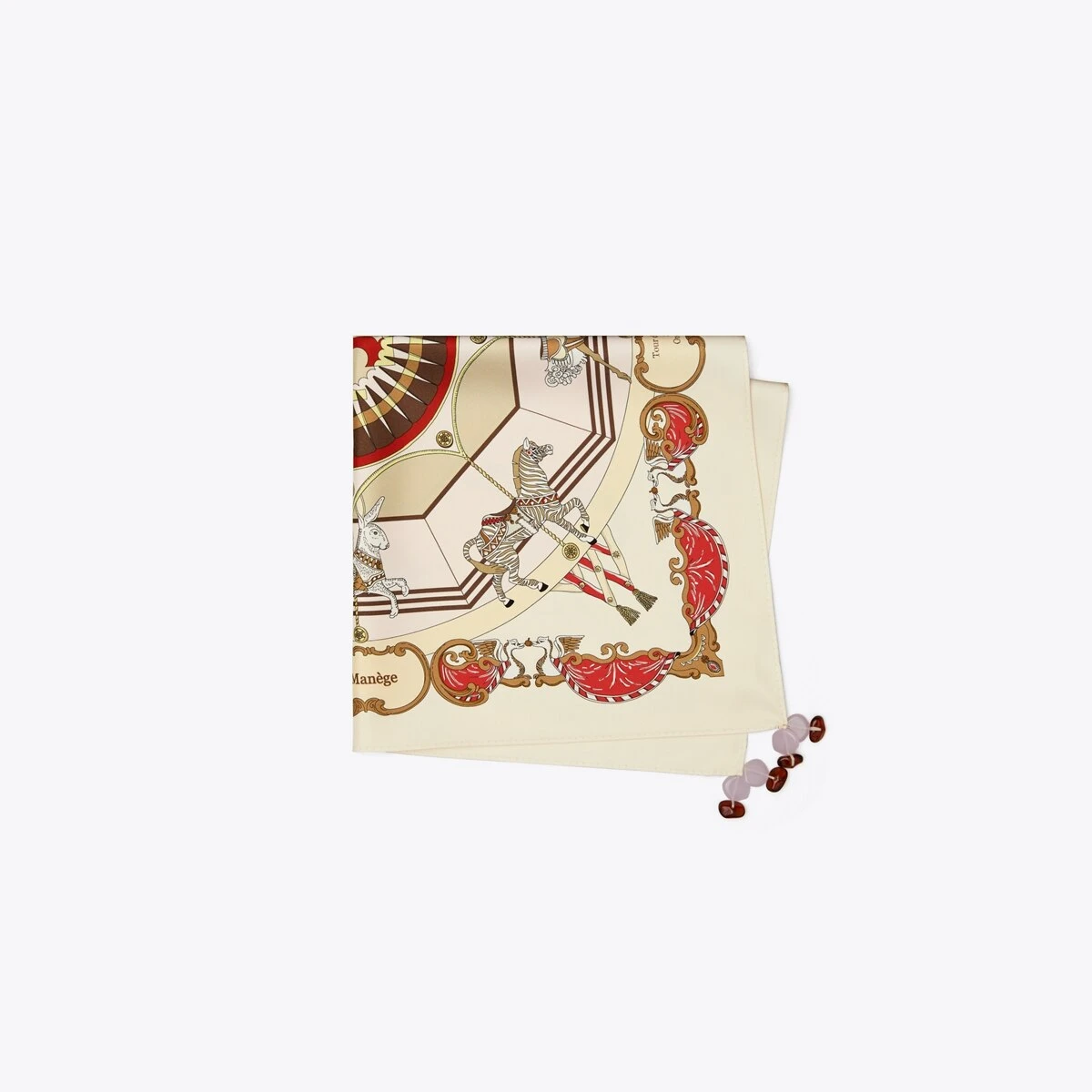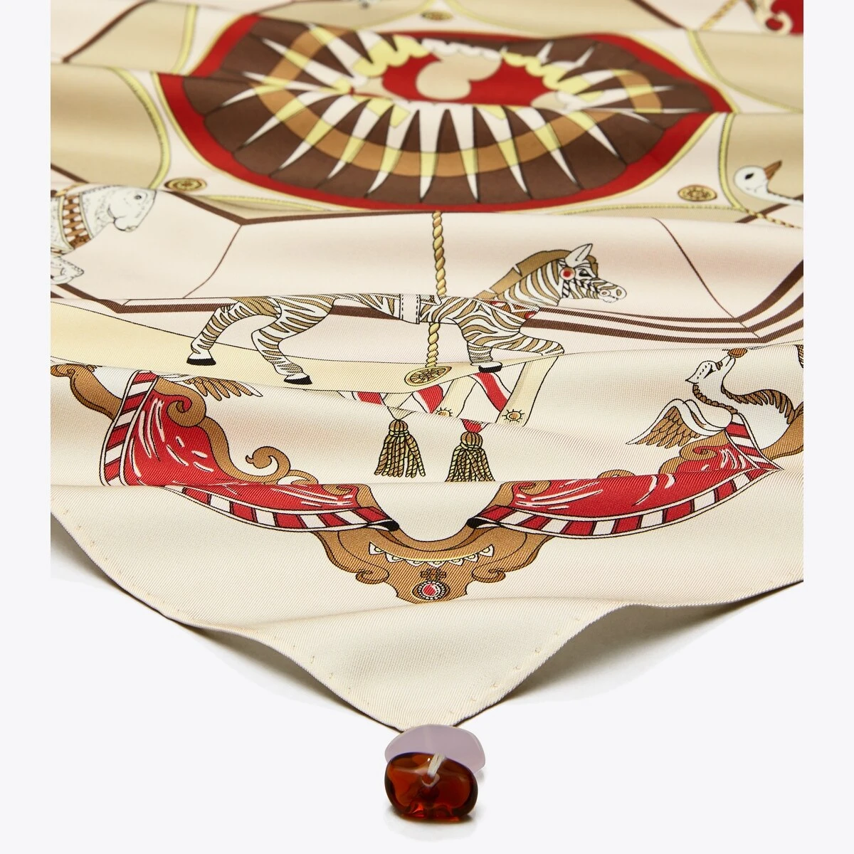 Our reversible neckerchief is crafted in silk twill. The colorful aerial scene is inspired by vintage carousels, with our Double T at the center. Wear it as a wrist tie, a headband or tie it to the handle of a favorite handbag.