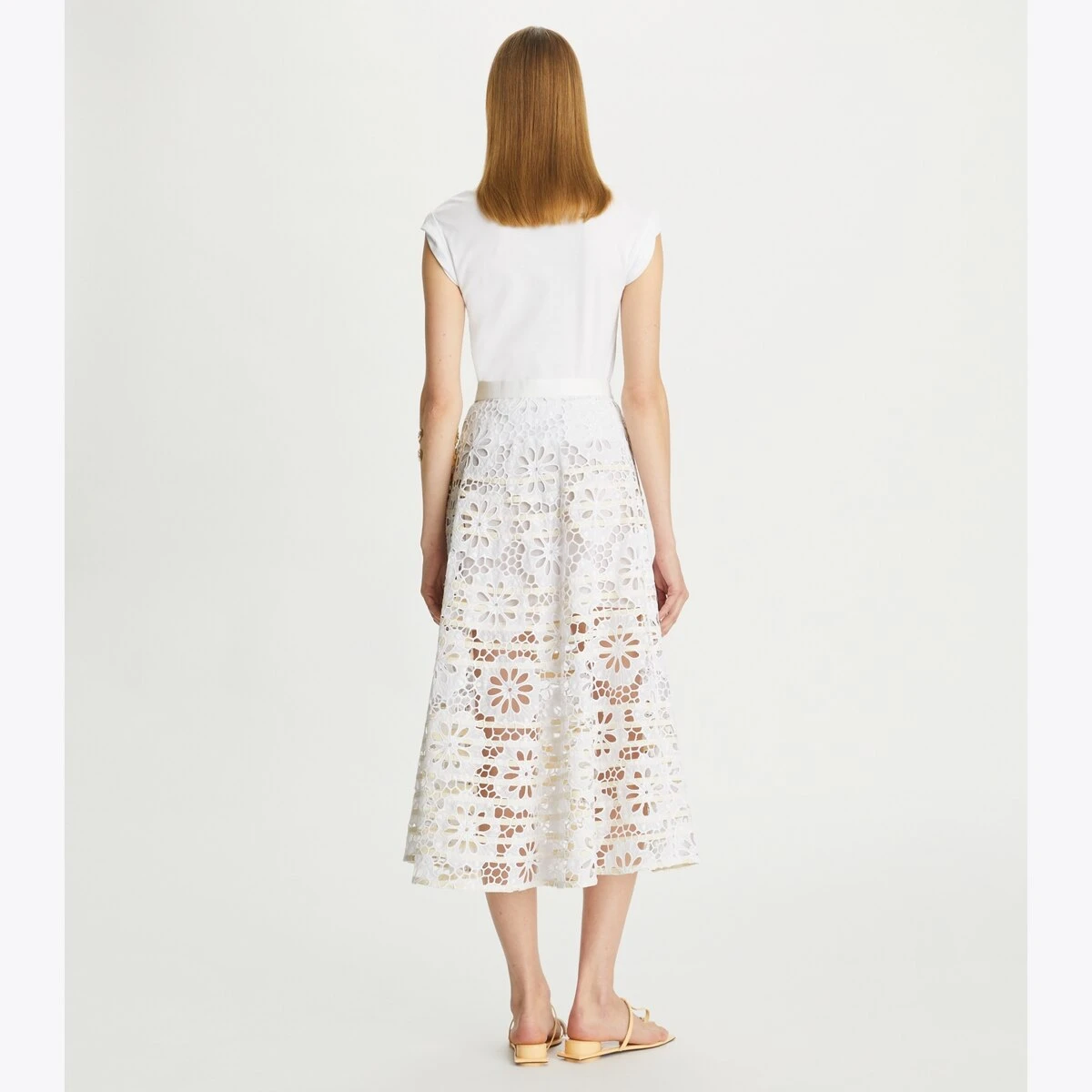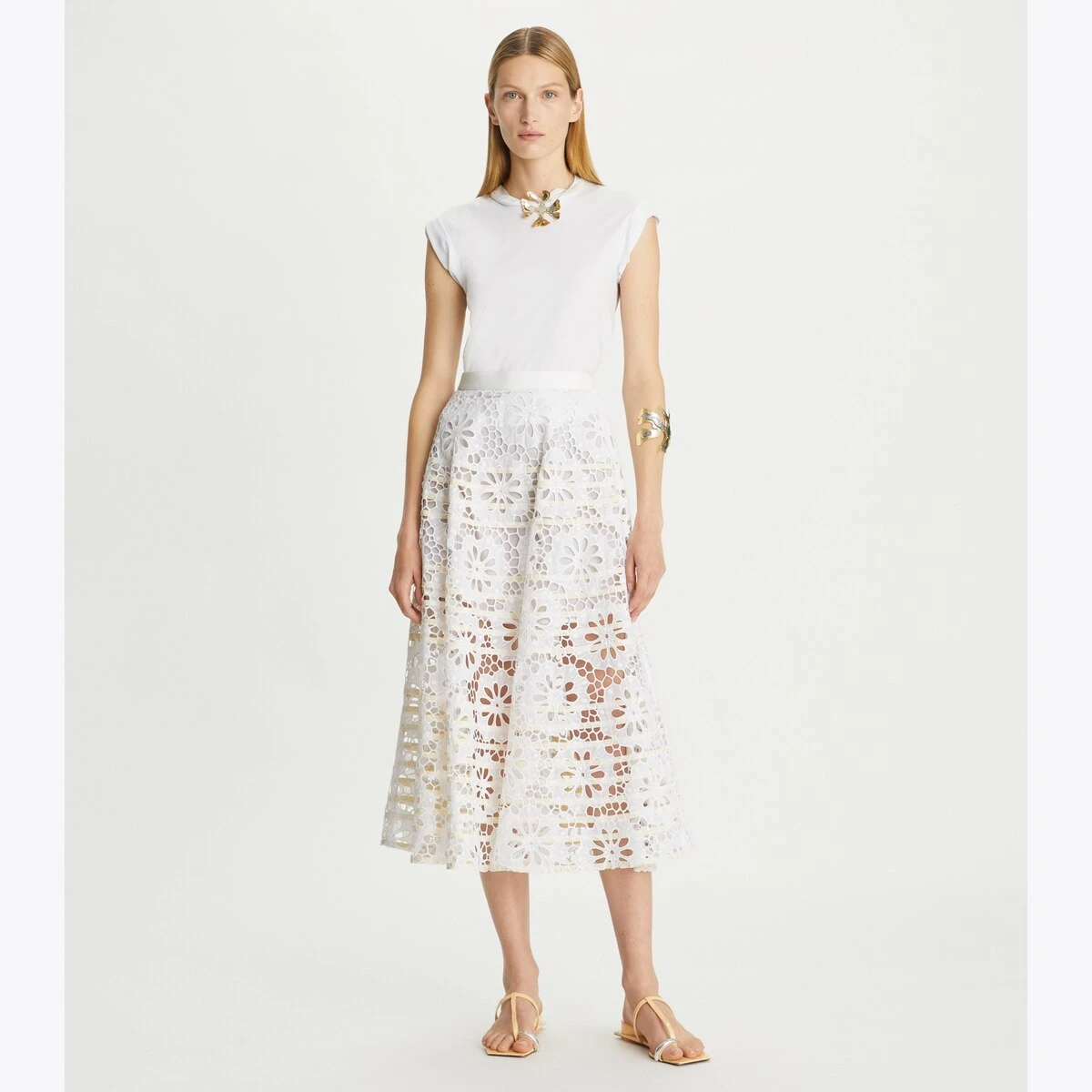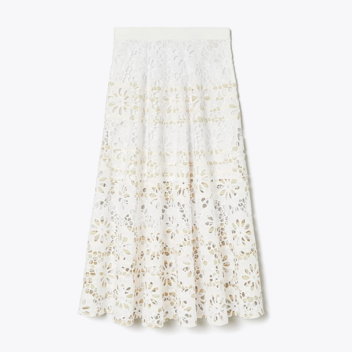 The new collection looks forward by reflecting on the past, experimenting with transparency and form to evolve classic styles. Chic and comfortable, our cotton eyelet skirt is cut from delicate broderie anglaise. Gentle pleats add volume and move beautifully. Wear it with strappy sandals now and heels and a cardigan later.
