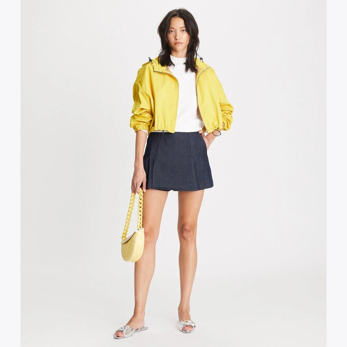 The Spring/Summer 2023 collection revisits signature pieces with a modern perspective. Our Denim Skort is a revival of a sporty Sixties design and combines the coverage of a short with the clean lines of a mini skirt. Cut from soft cotton, the dark workwear-inspired wash is balanced with feminine pleats and tonal topstitching.