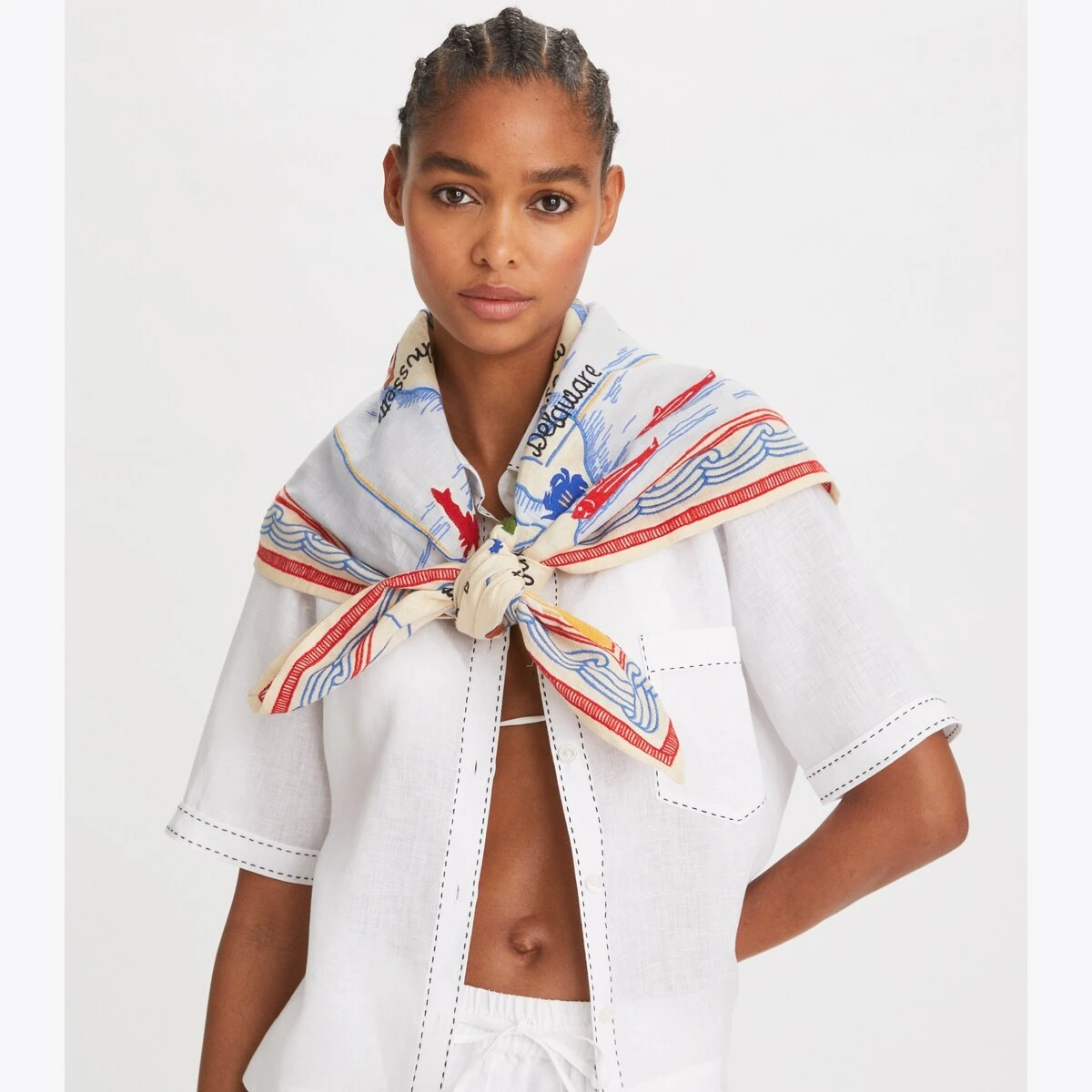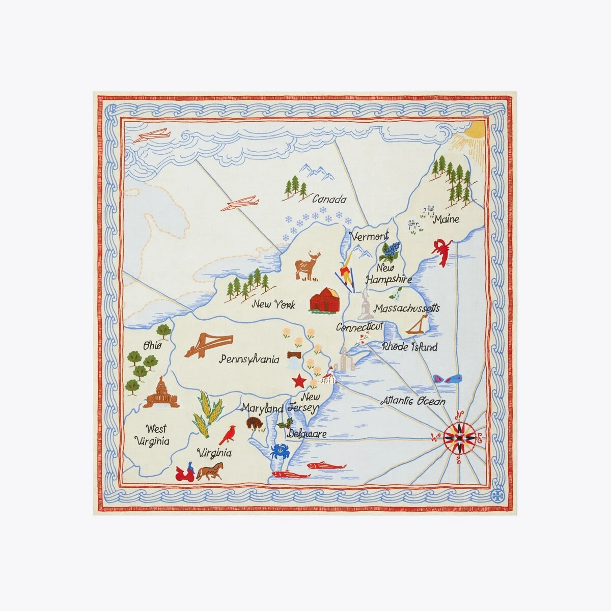 A map of the American Northeast is reimagined in a mix of textures. The square scarf is meticulously crafted in embroidered linen with felt patches. Wear it loosely tied around the neck, as a wrist tie or headband, or add it to a handbag.