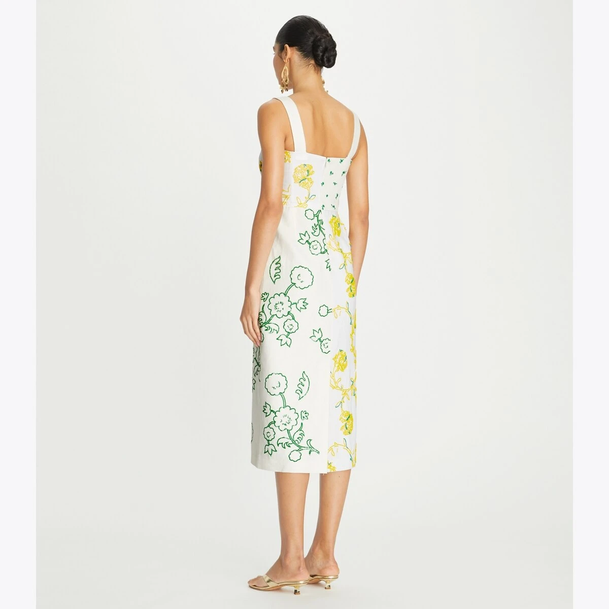 This summer-ready dress is crafted from breezy, patchwork linen adorned with floral embellishments brought to life by threadwork, sequins, and beads. Complete an elegant look with neutral accessories that keep the dress in focus.