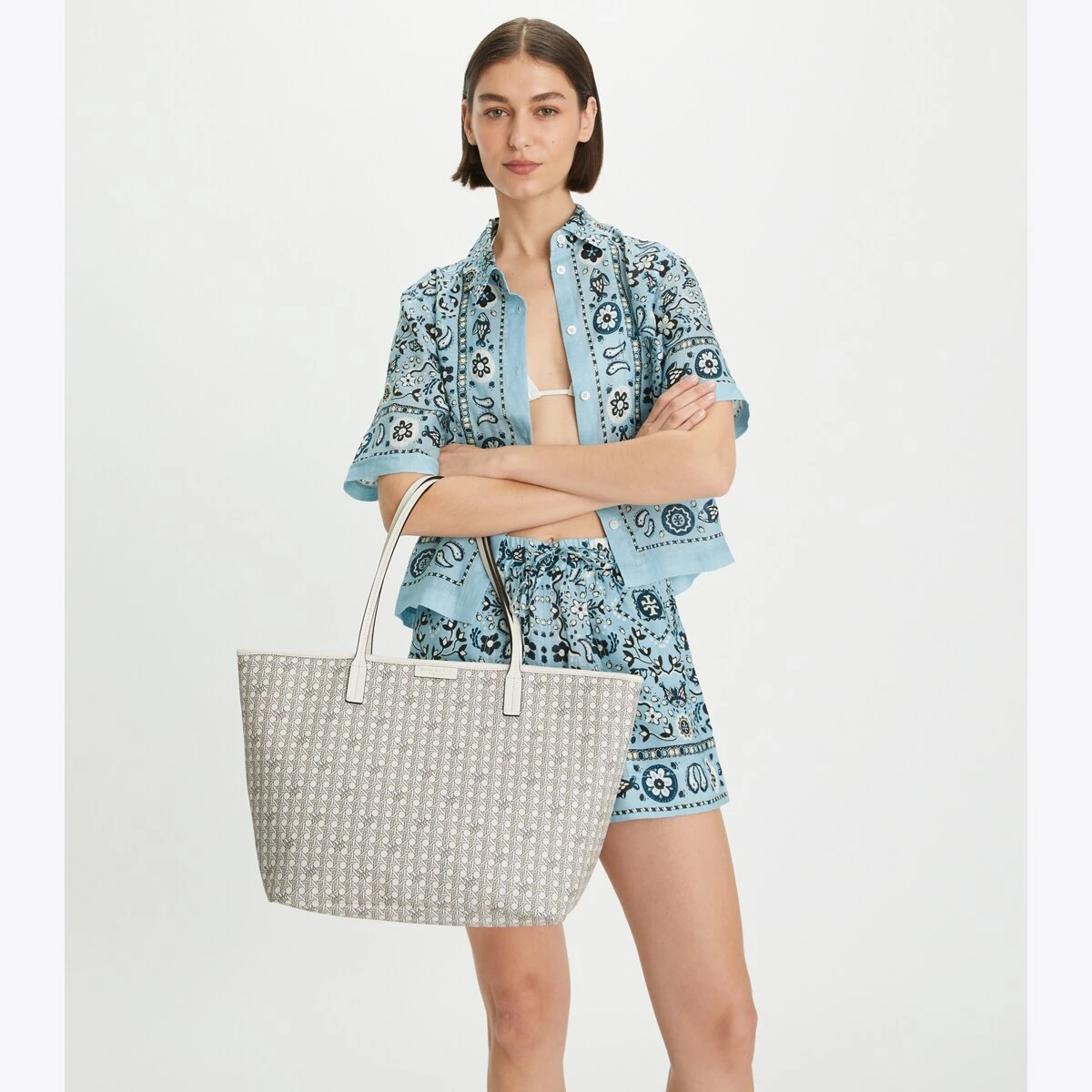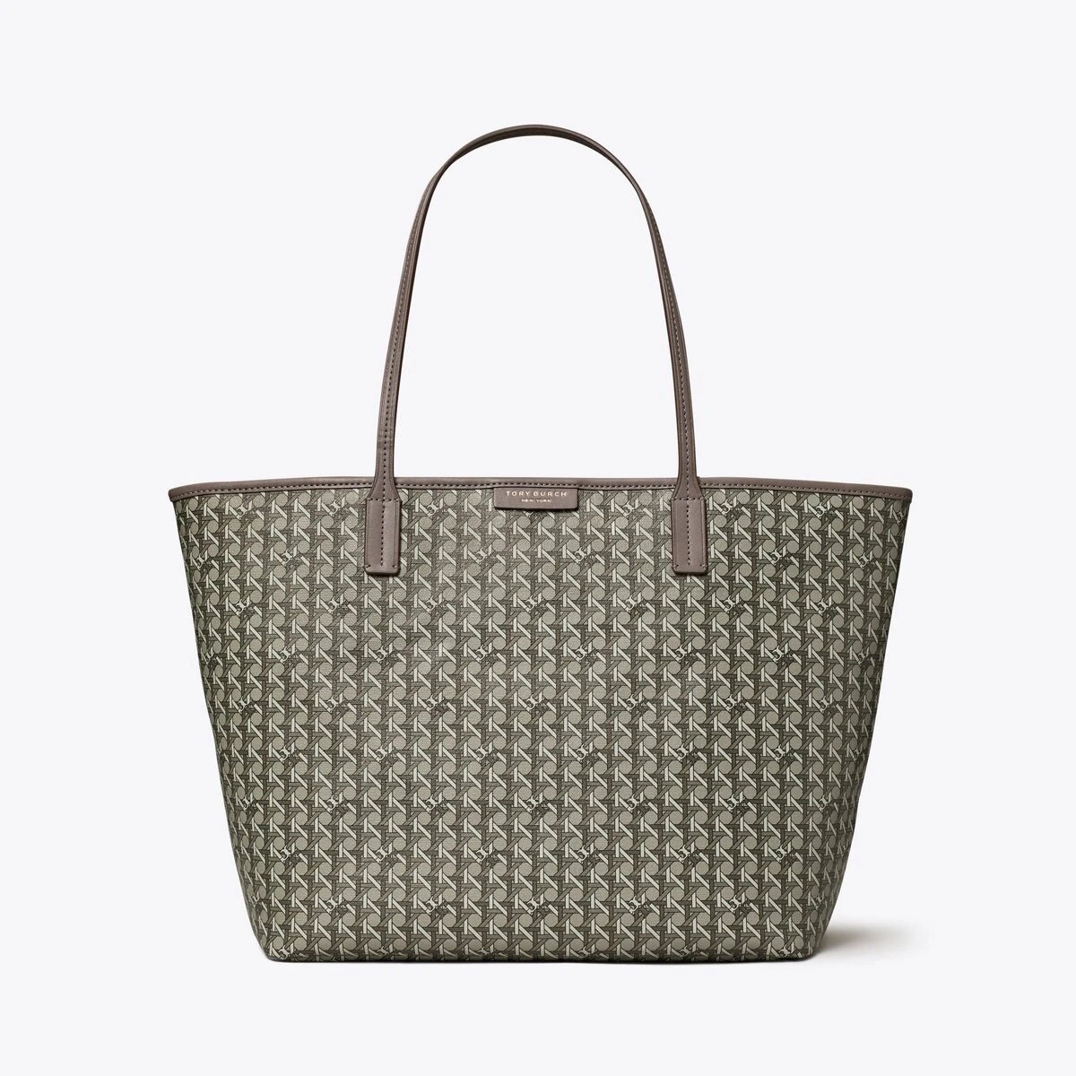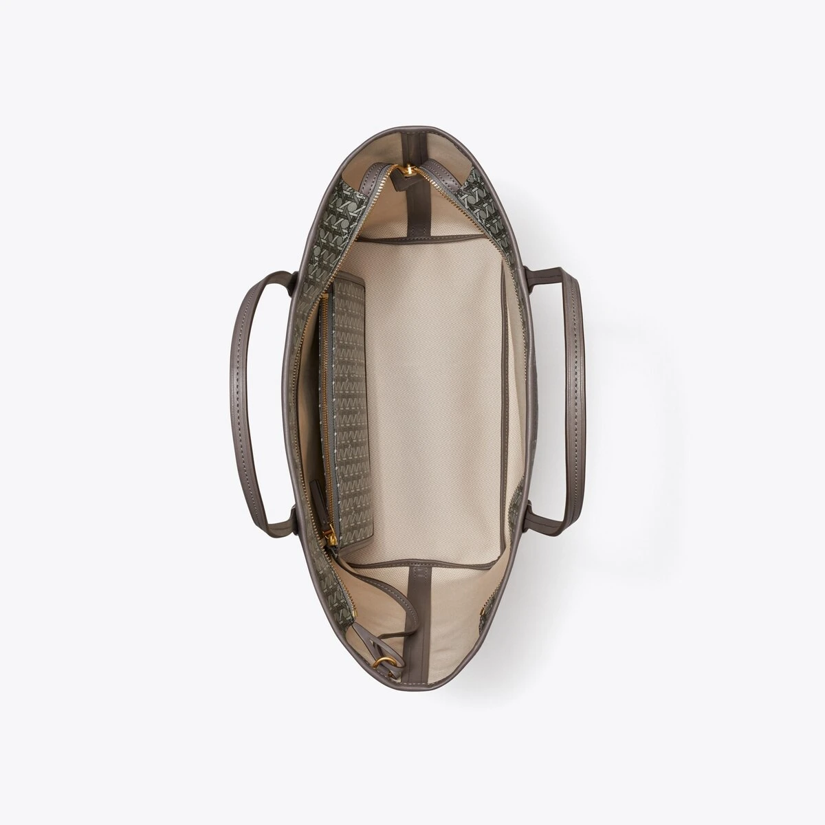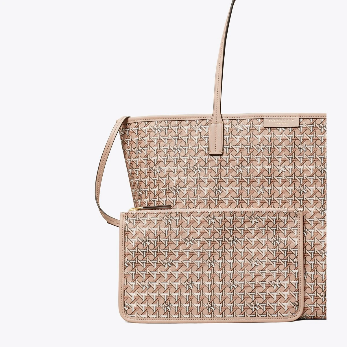 Ready for anything. A stylish tote that is supremely functional. Lightweight and durable in water-resistant coated canvas, our new Ever-Ready Tote has a secure zipped top and comes with a matching pouch. Slim straps are long enough to comfortably sit over the shoulder. Our iconic basketweave print is inspired by Tory’s longtime fascination with basketry: Straw baskets in her Valley Forge home, woven bags found on travels, the caning of Parisian café chairs. The micro motif is both a statement and neutral.