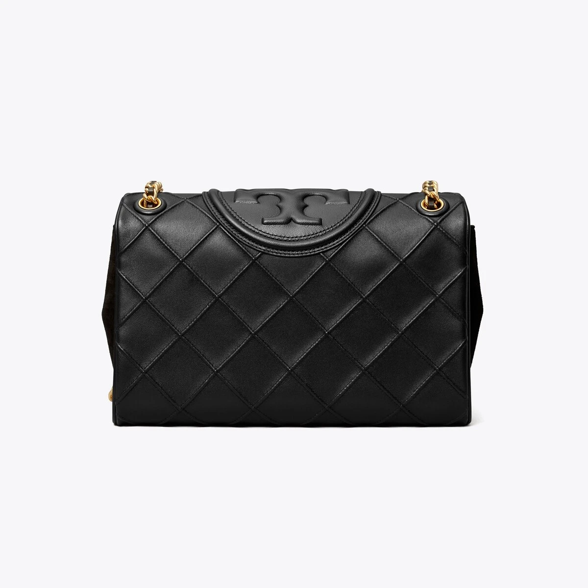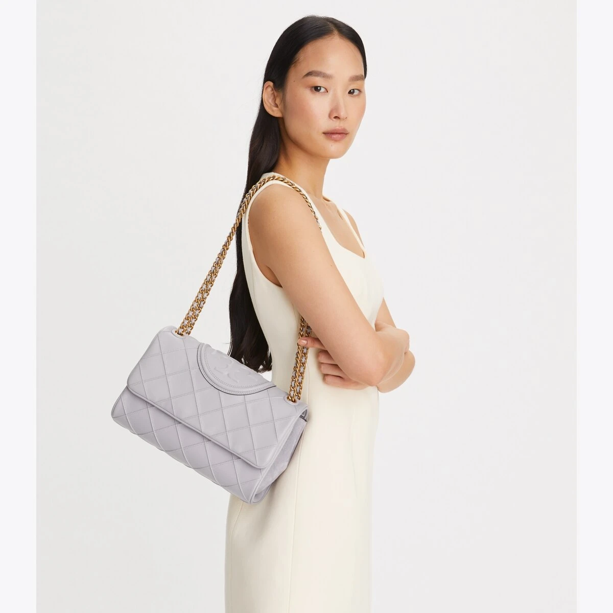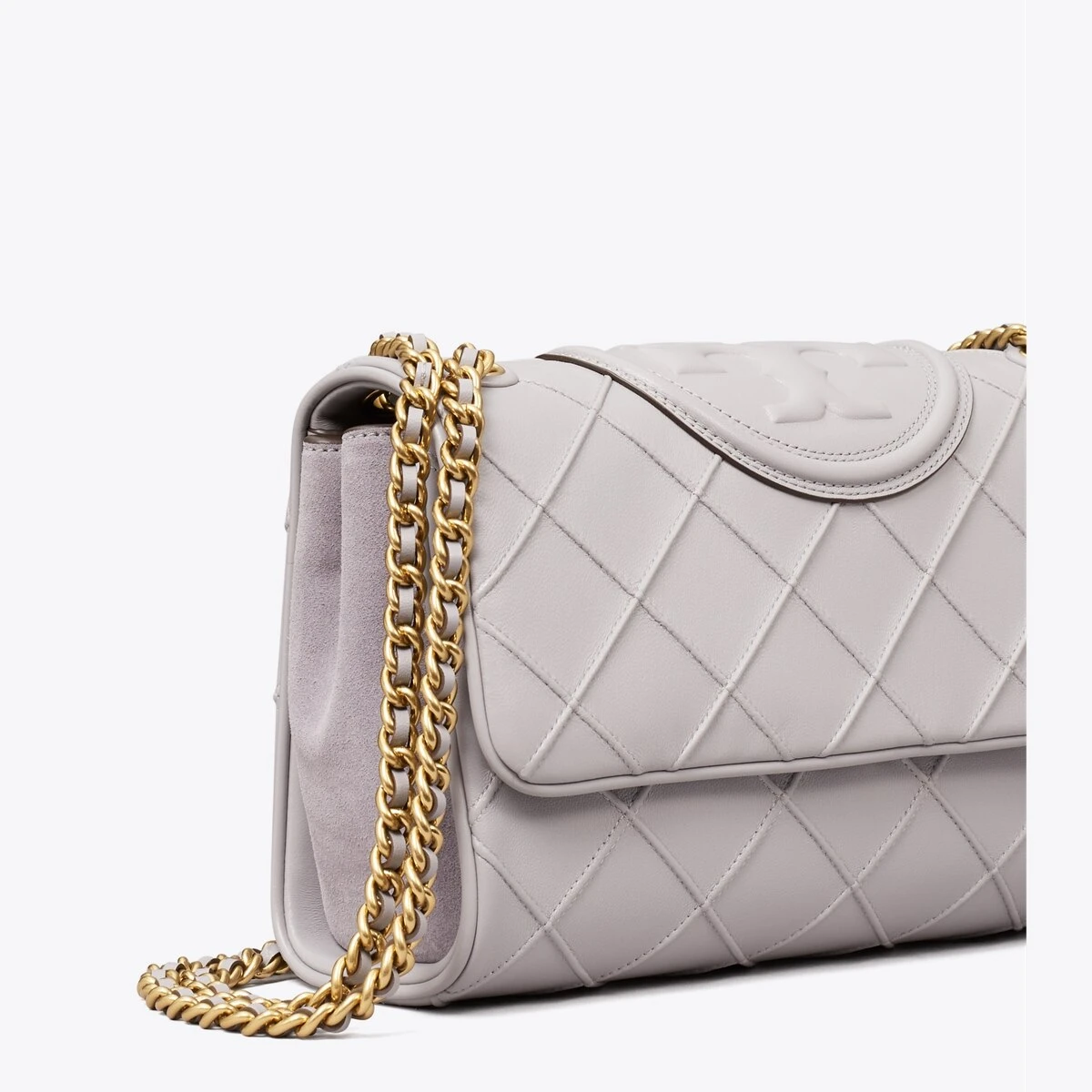 Enduring glamour. The new Fleming Soft Convertible Shoulder Bag is updated with pintucks in a diamond pattern and the softest leather. The feminine silhouette is sealed with an oversized bombé Double T. Braided with brushed chain, the strap can be worn long or short.