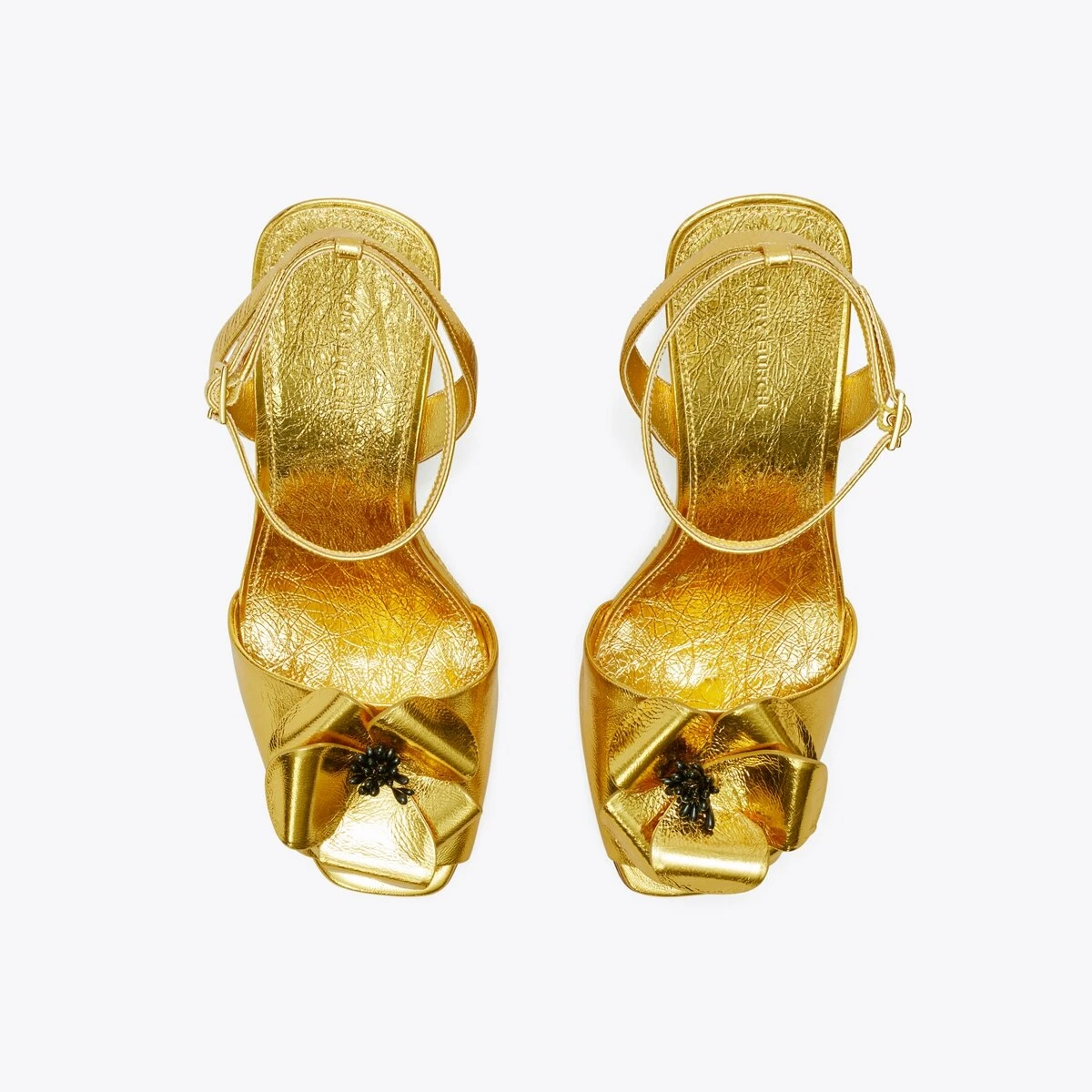 Elegant, sculptural and meticulously crafted. The classic warm-weather style is embellished with hand-molded metallic leather petals, forming a dimensional pansy — symbolic of love and free-thinking — that is centered with resin and crystal pistils. The wedge heel is wrapped in metallic-coated jute and a buckled ankle strap adds a secure fit.
