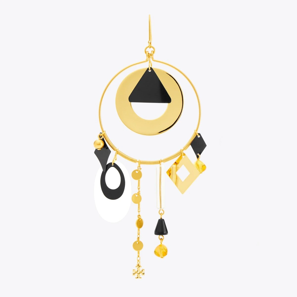 Inspired by celestial motifs and Tory’s love of sculptural mobiles popular in the Fifties, this statement design is composed of metal discs, charms, beads and wire wrapping that reflect light beautifully — and are lightweight to wear. For pierced ears.