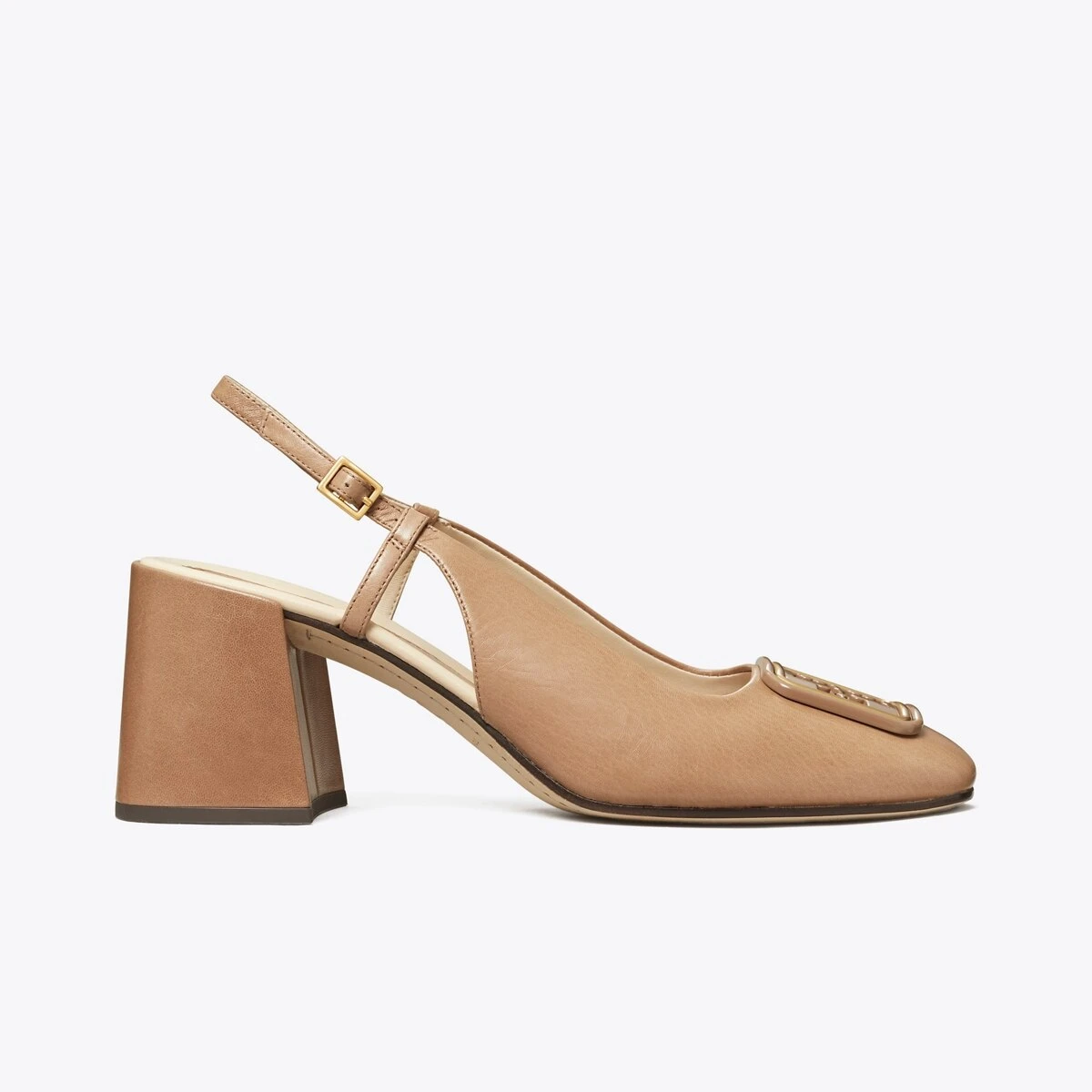 A square toe and square hardware in super-soft leather. The new Georgia Bombé Slingback has a dual-tone logo and sculpted block heel. Designed with a flattering high vamp and cushioned insole, it is sleek and versatile.