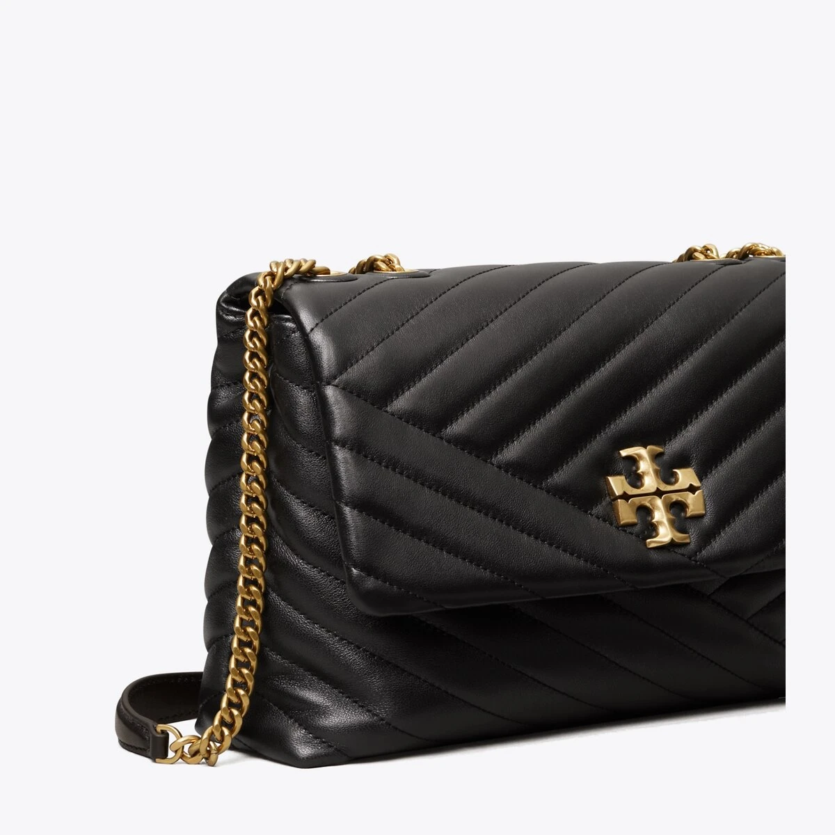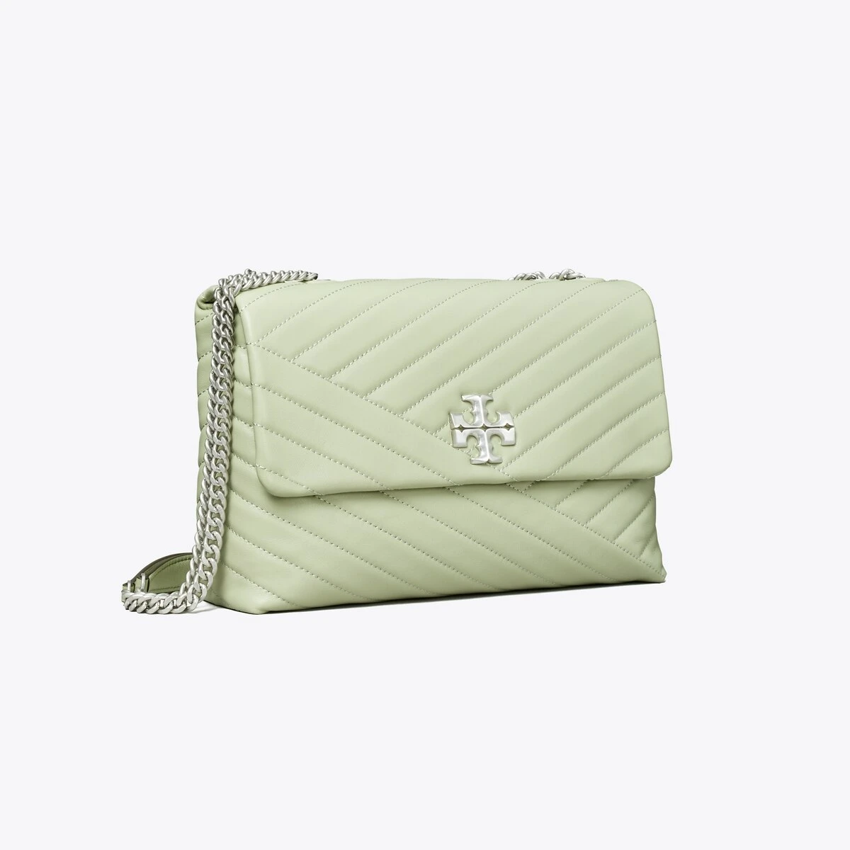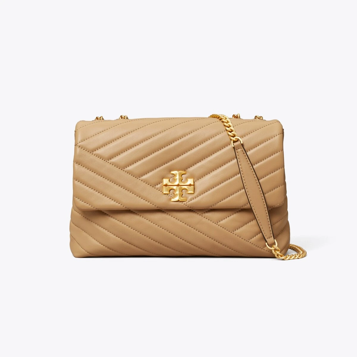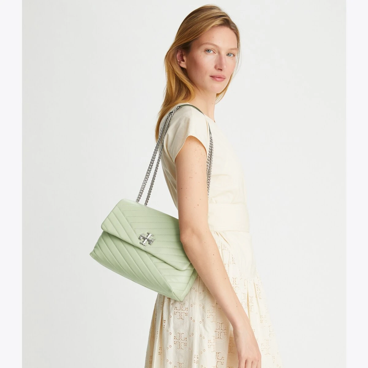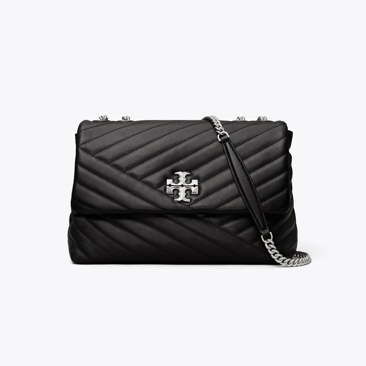 The Kira Convertible Shoulder Bag is made of soft chevron-quilted leather with beveled Double T hardware. An adjustable chain strap adapts in the moment — doubled over the shoulder, or long and crossbody.