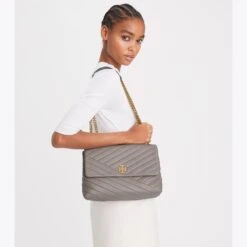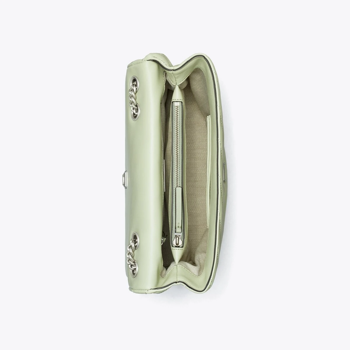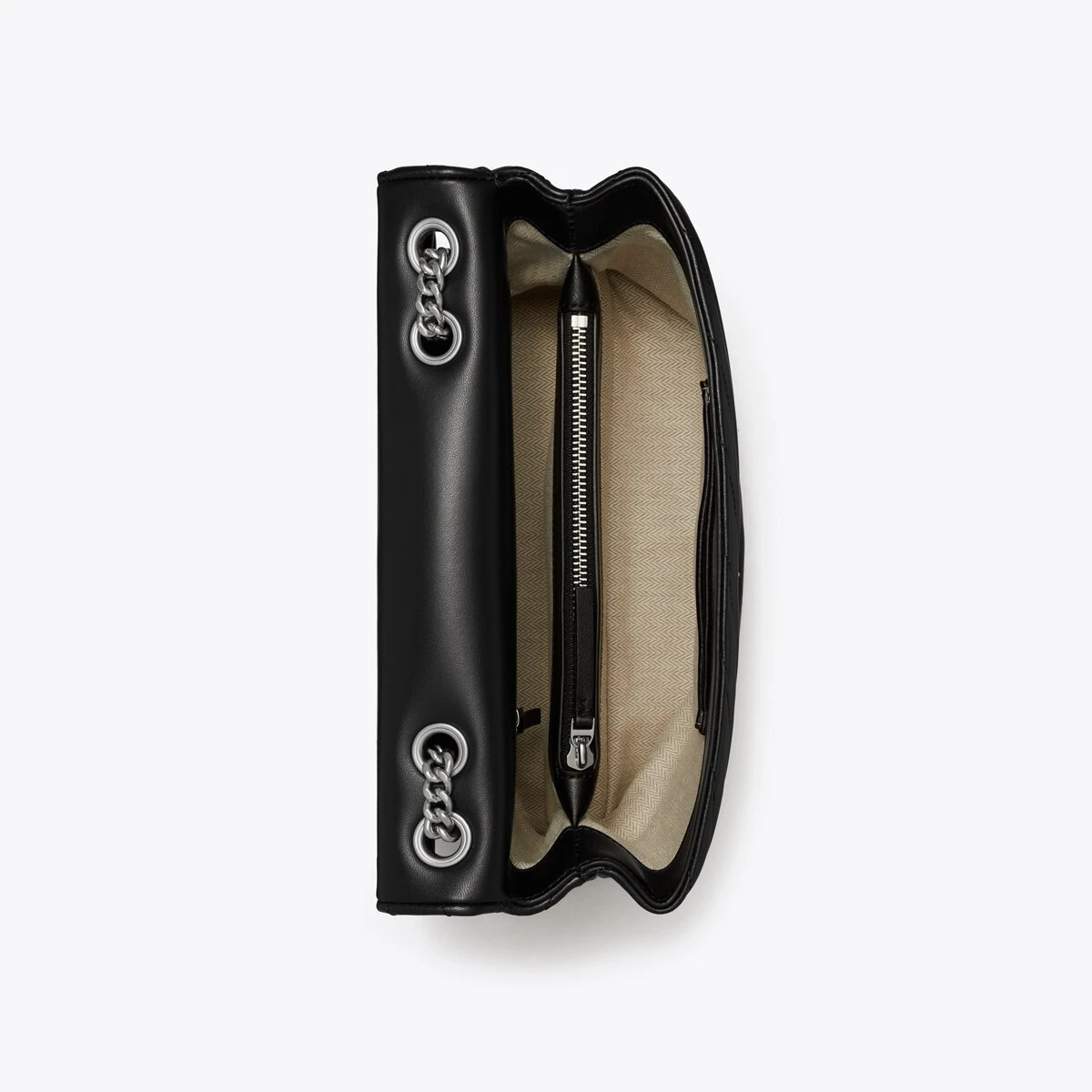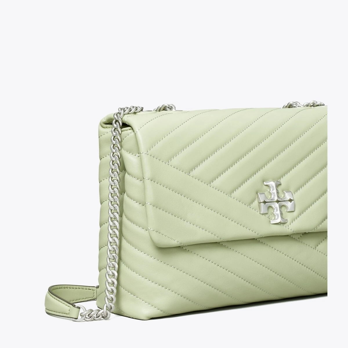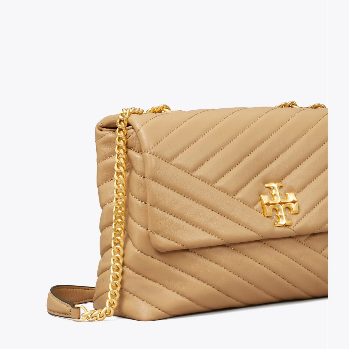 The Kira Convertible Shoulder Bag is made of soft chevron-quilted leather with beveled Double T hardware. An adjustable chain strap adapts in the moment — doubled over the shoulder, or long and crossbody.