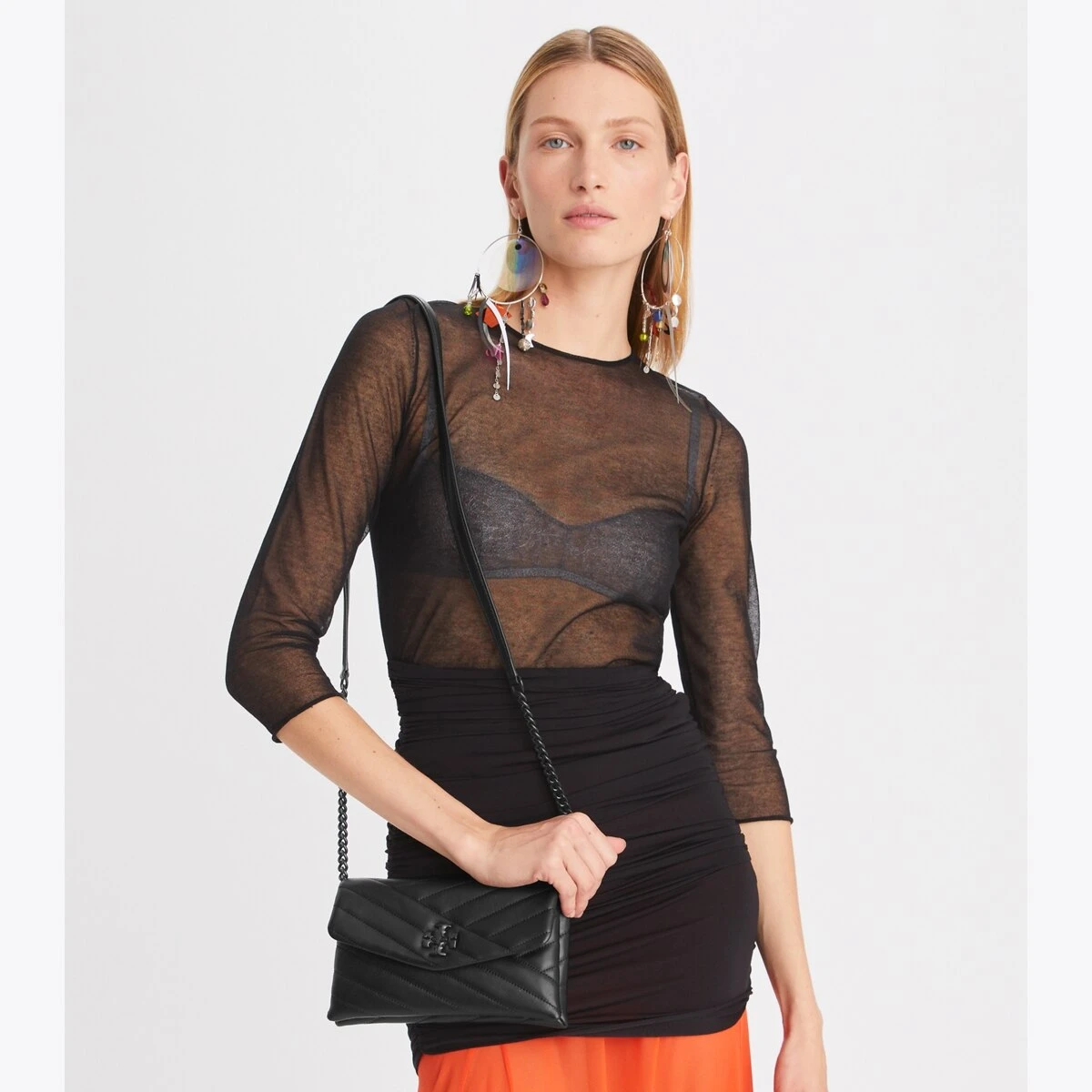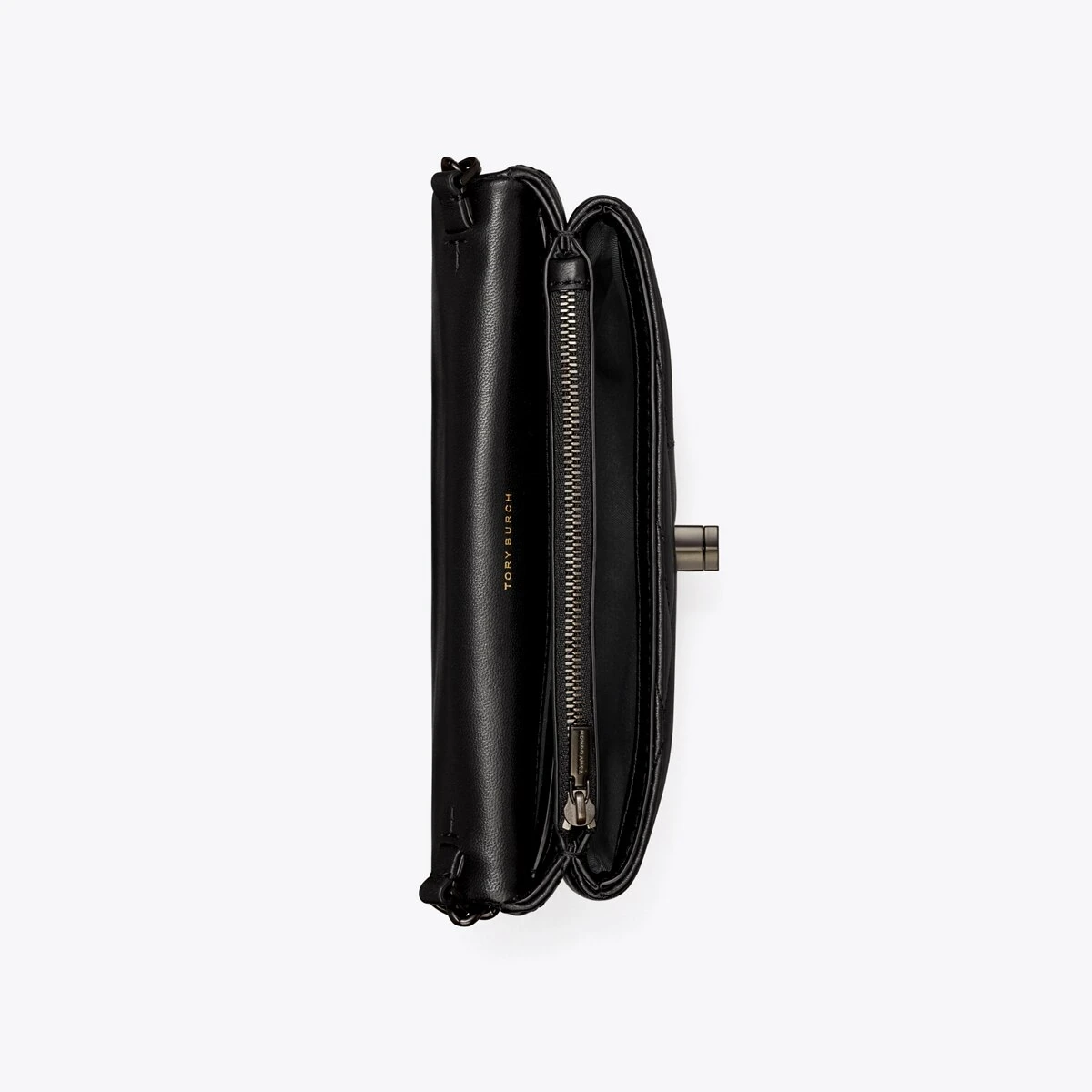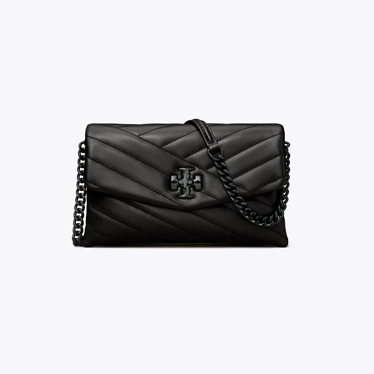 Our beveled Double T becomes graphic turn-lock hardware on the Kira Chain Wallet. Made of soft chevron-quilted leather, it is finished with a chain-and-leather crossbody strap.