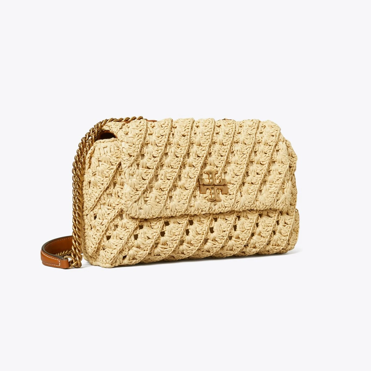 The Kira Small Convertible Shoulder Bag is made intricately crocheted straw with beveled Double T hardware. An adjustable chain strap adapts in the moment — doubled over the shoulder, or long and crossbody.