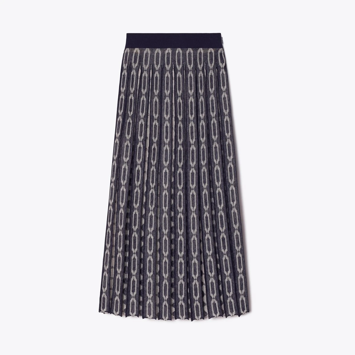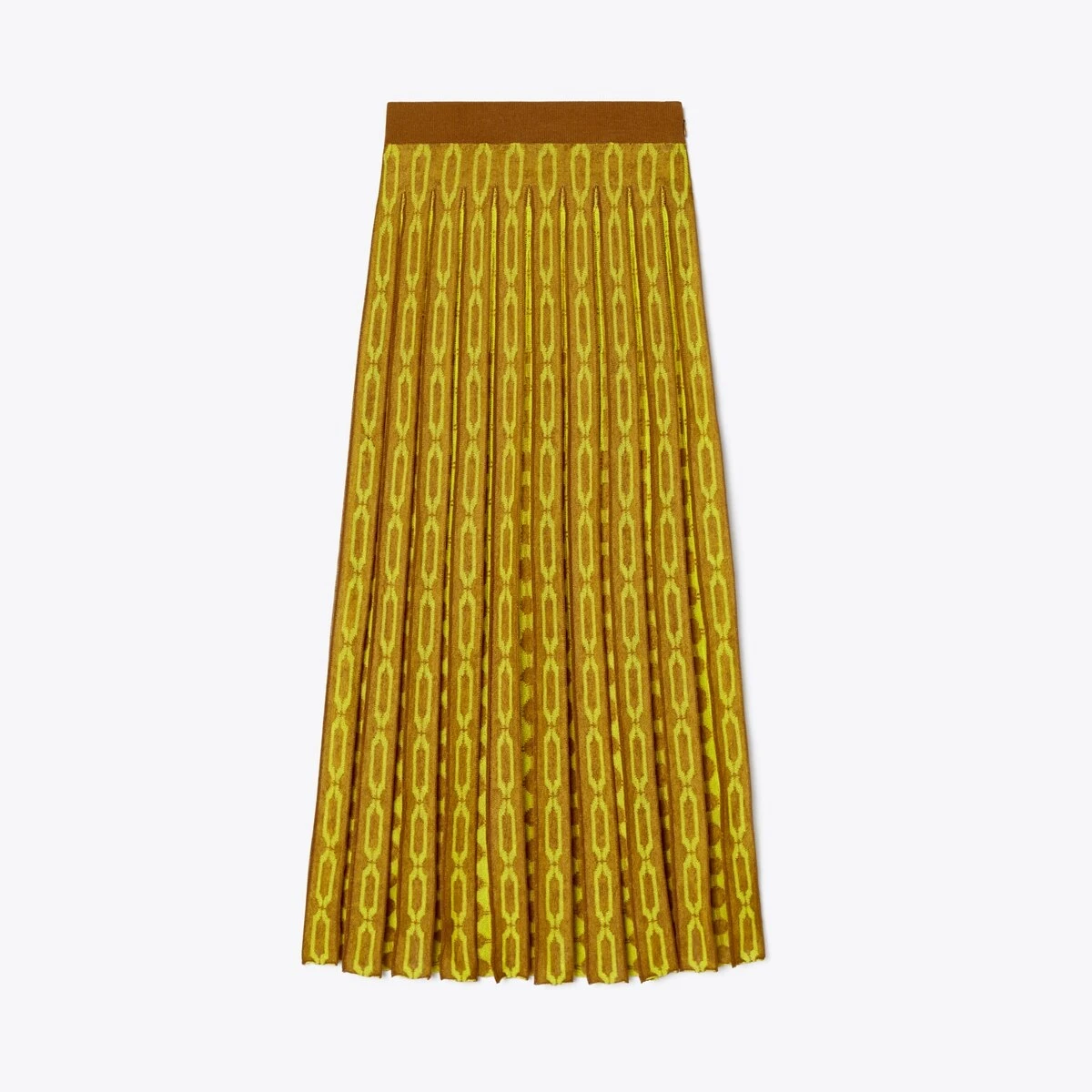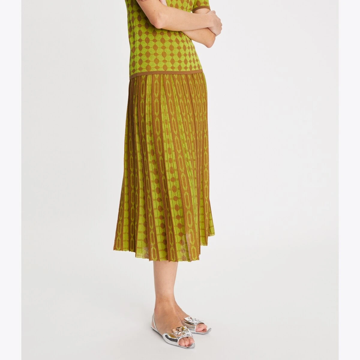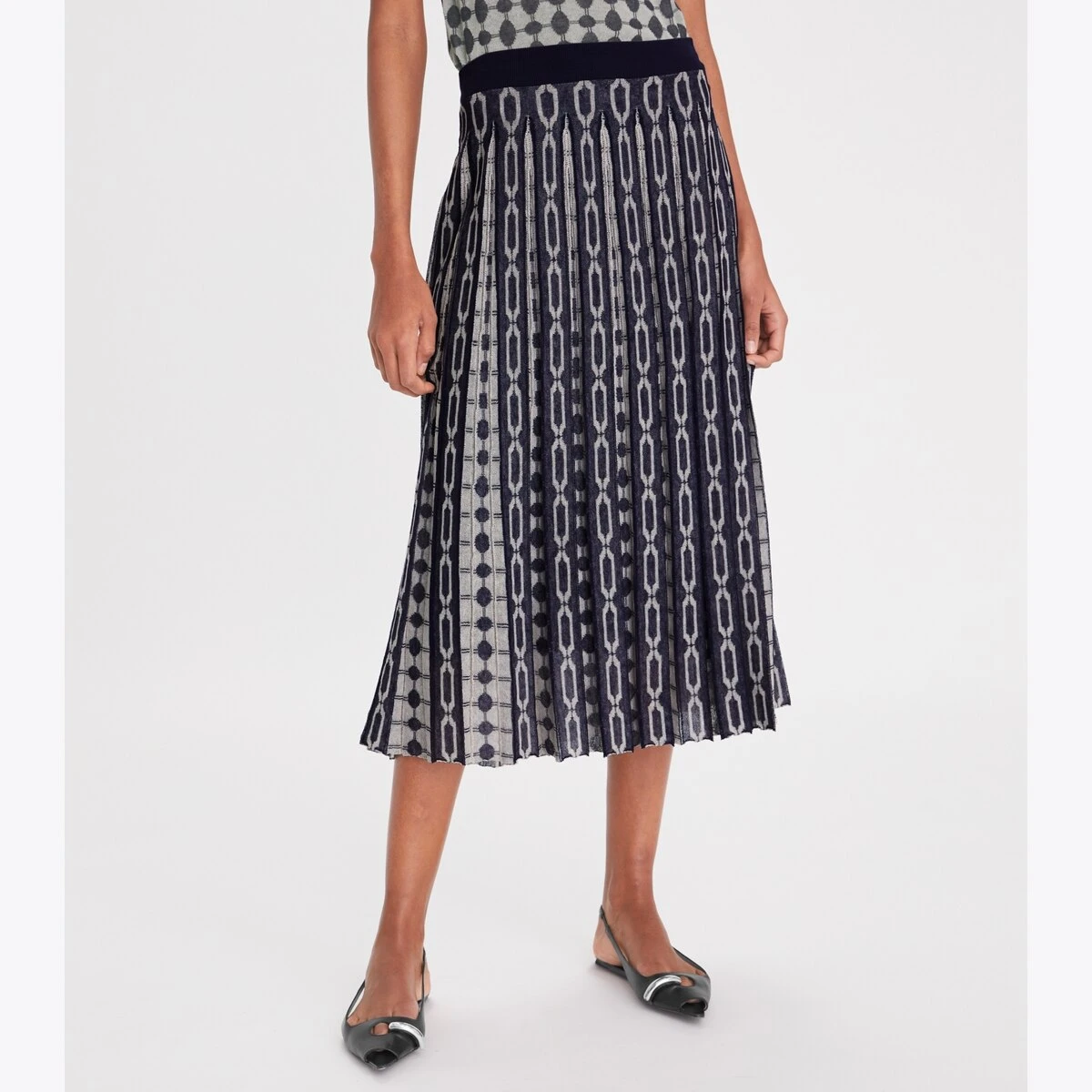 A modern take on Seventies sportswear, our jacquard knit pleated skirt is wrinkle-resistant, holds its shape and has just the right amount of give. Contrasting colors come together to create a classic chain-link pattern. Play with sweater dressing and prints when you wear it with the matching cardigan, paired with heels or sneakers.