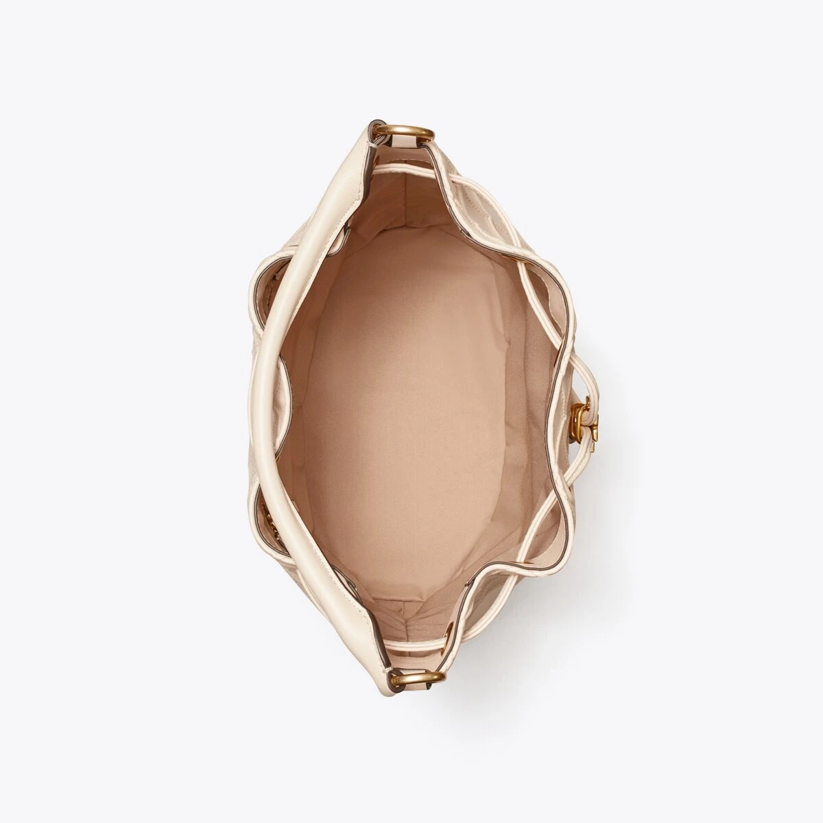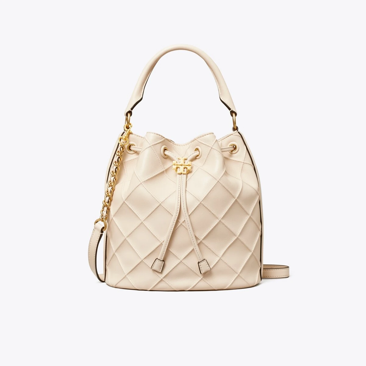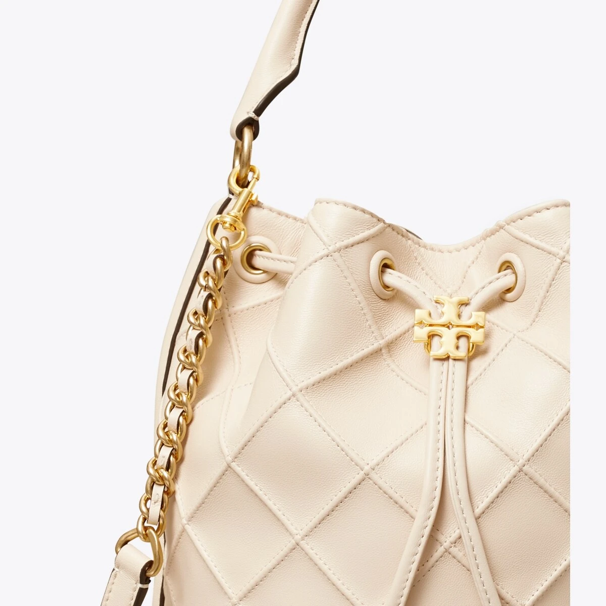 Enduring glamour. The new Fleming Bucket Bag is made of the softest leather with pintucks in a diamond pattern. Our Double T cord stopper works as a keeper for the drawstrings.