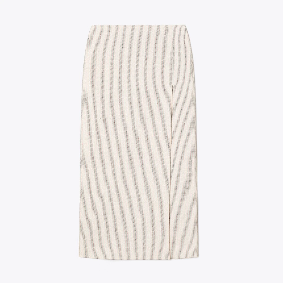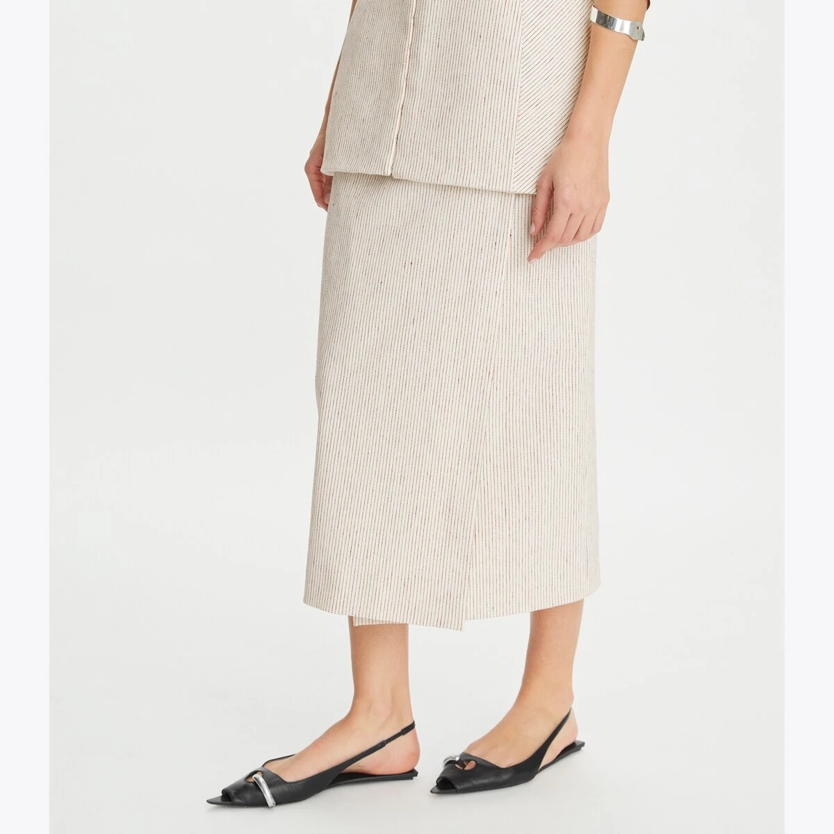 The new collection revisits signature pieces in beautiful materials with a modern perspective. Our wrap skirt is crafted in an Italian linen blend with yarn-dyed stripes. Structured and lightweight with just the right amount of give. A waist-defining flat front falls to a draped silhouette with a sharp split for movement. Wear it with the matching hook-and-eye tunic and silver arm cuff, as seen on our runway.