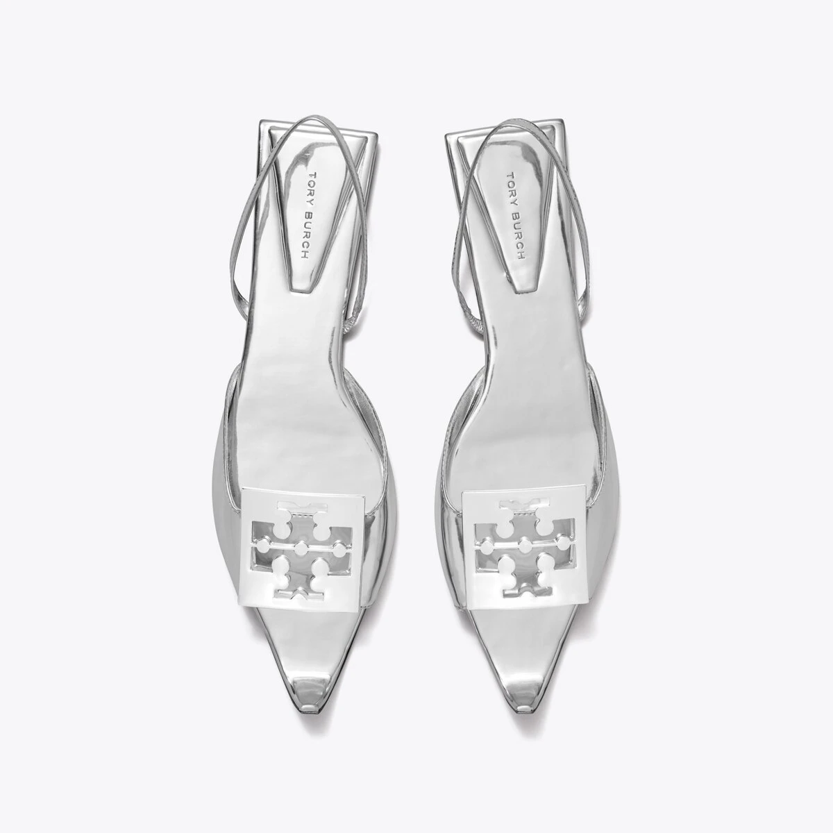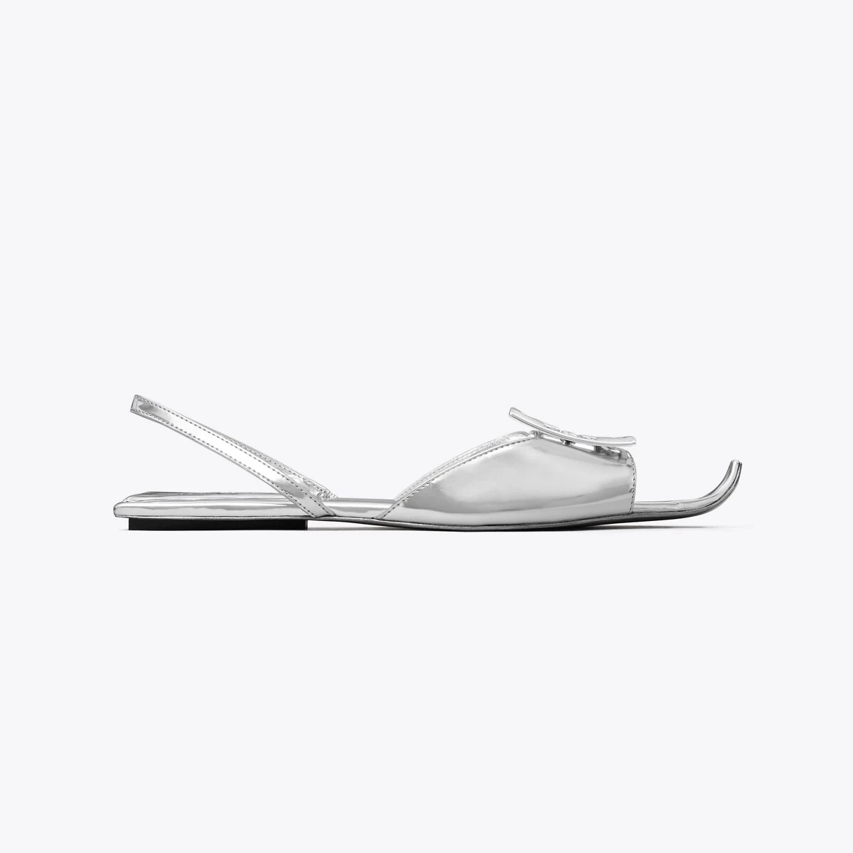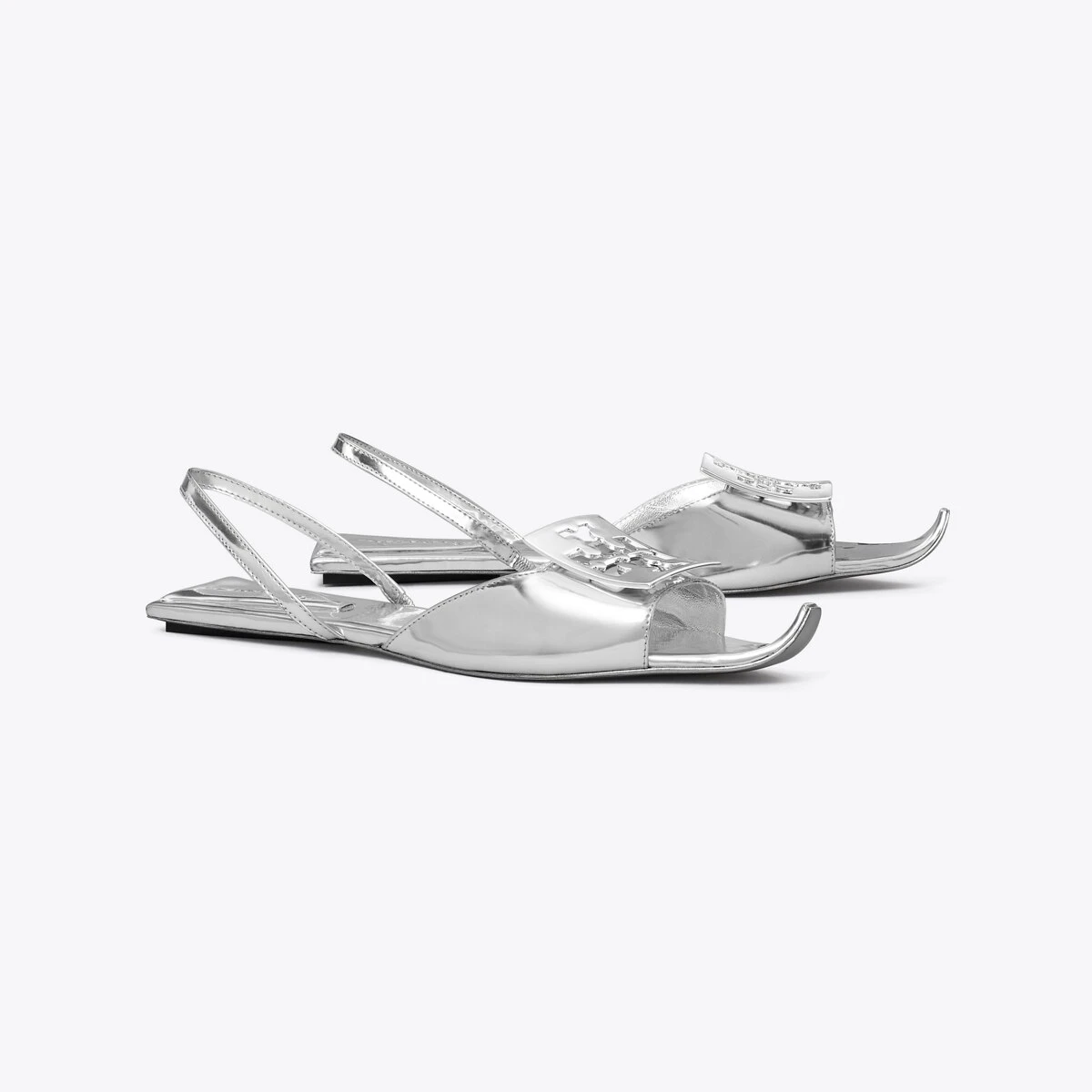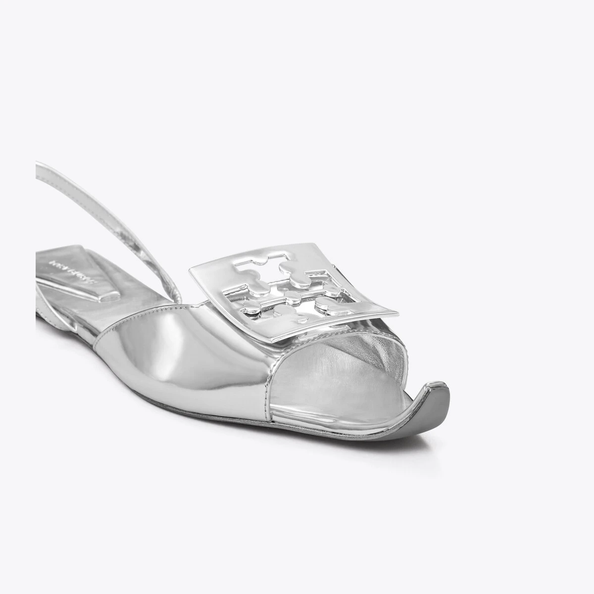 Artful details and sharp innovation define the new collection. The Logo Flat Slingback Sandal plays with shape and geometry with its upturned toe and square heel. A silver logo plate and high-shine metallic leather add a modern look. Comfort and ease are secured by an elasticated ankle strap.