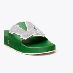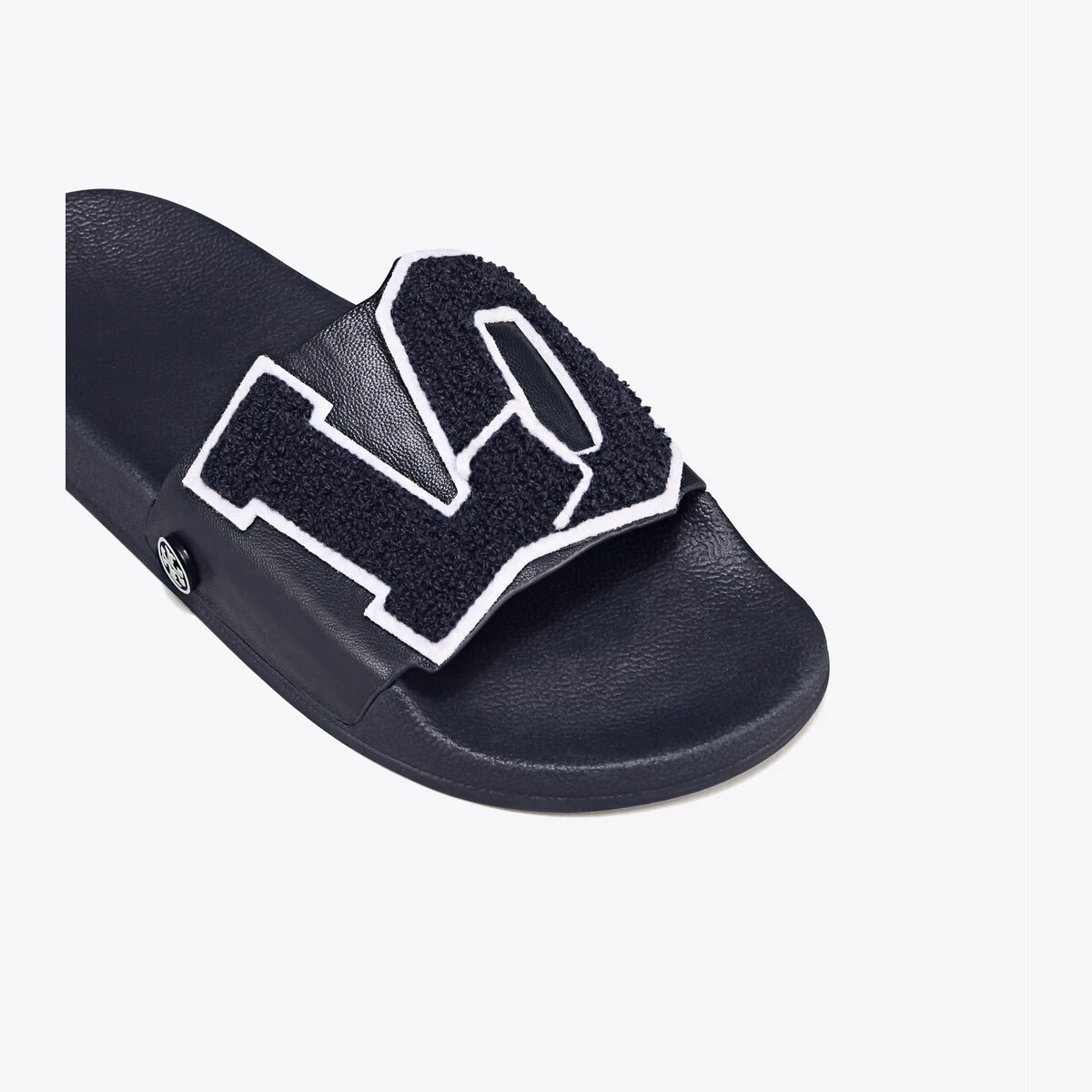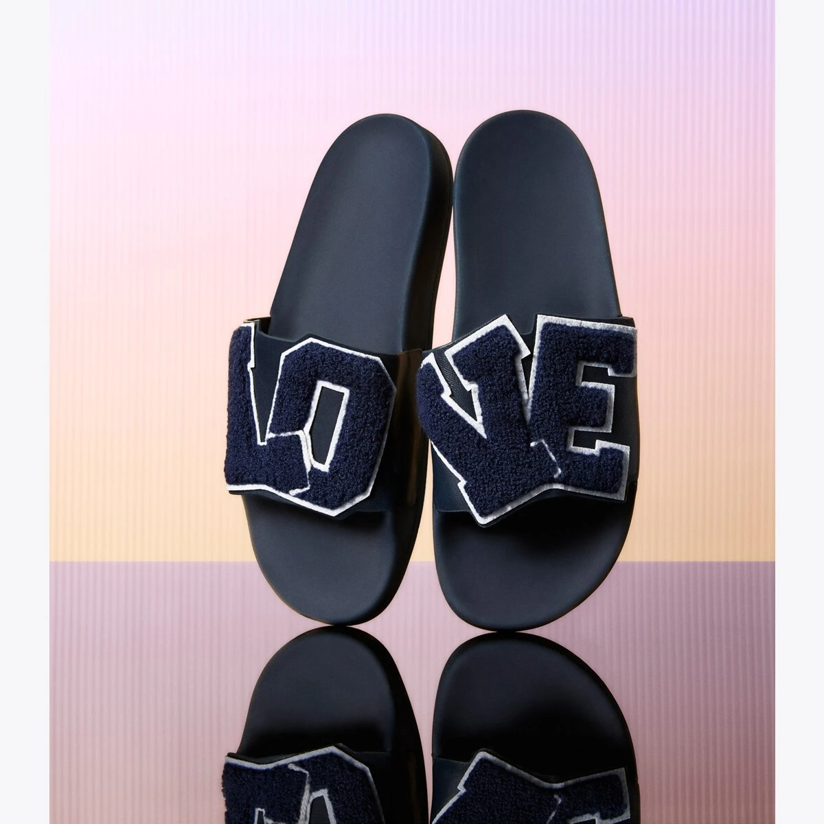 From our Love Capsule, a lightweight slip-on designed for comfort and ease. Our best-selling Love Slides elevate a supportive sandal —featuring a cushioned EVA sole — with a leather upper and chenille and felt varsity appliqués. Perfect for travel or wearing post-workouts.