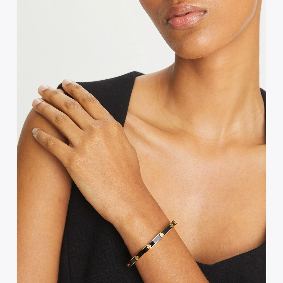 Our signature collection, reimagined as jewelry. In a mix of metal and enamel, the Miller Stud Enamel Hinge Bracelet, studded with Double Ts, looks great stacked or solo.