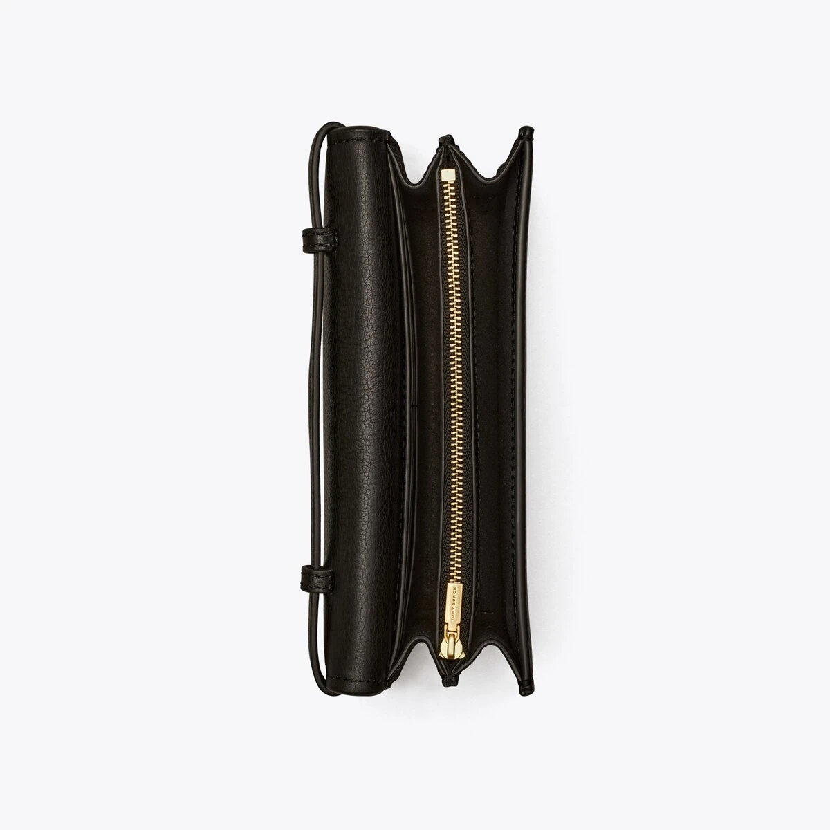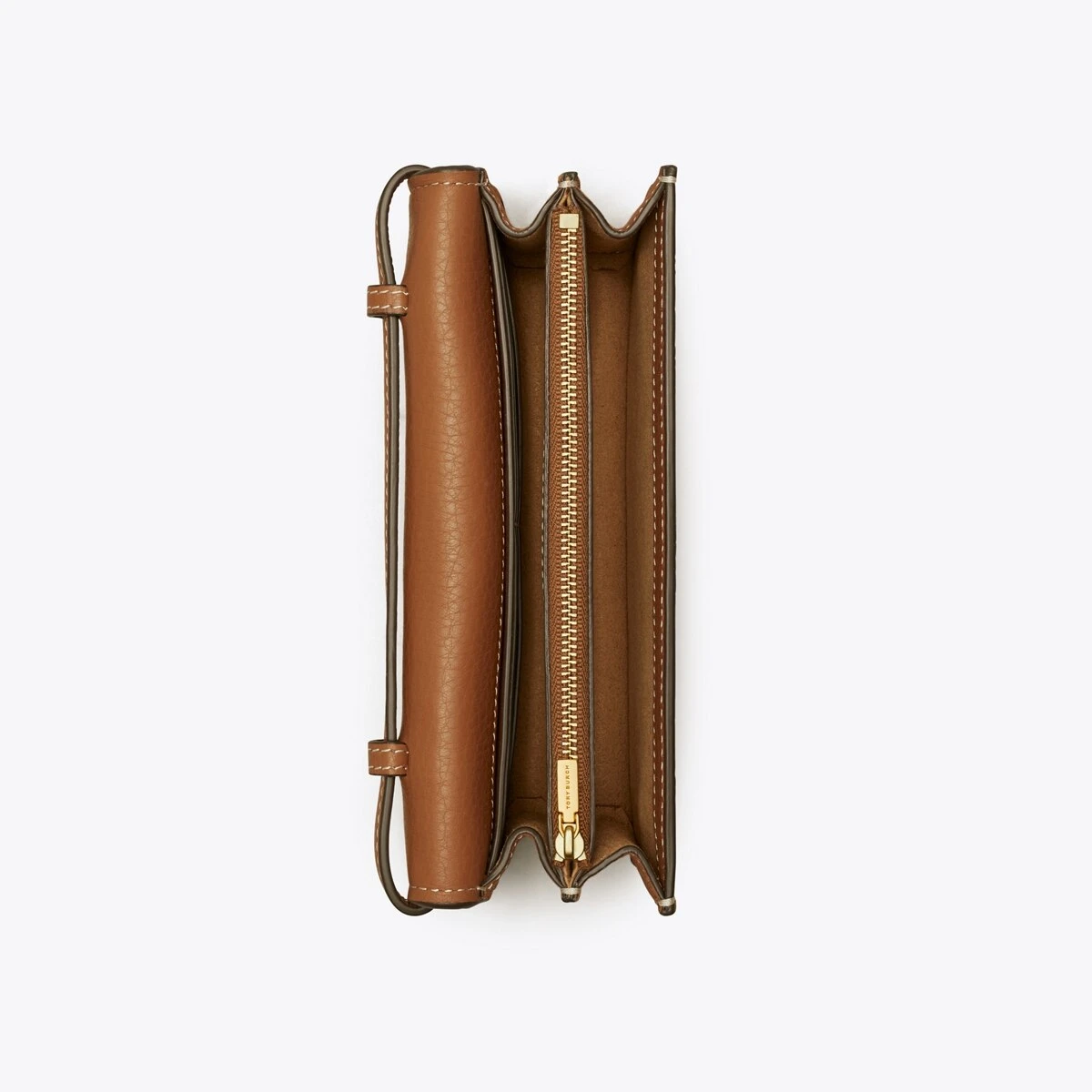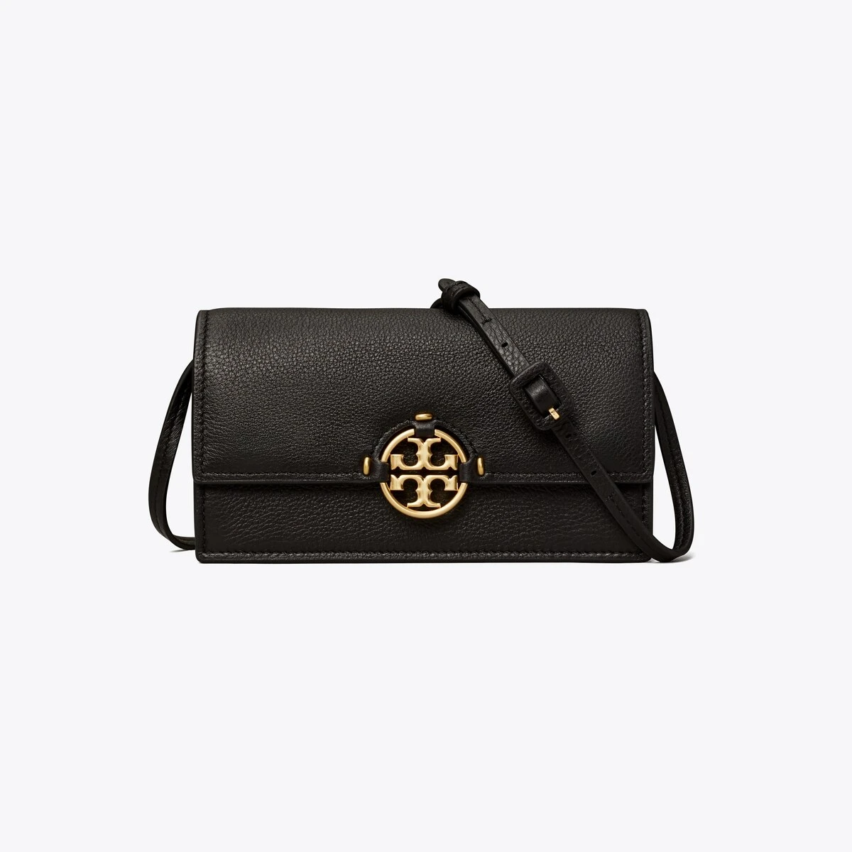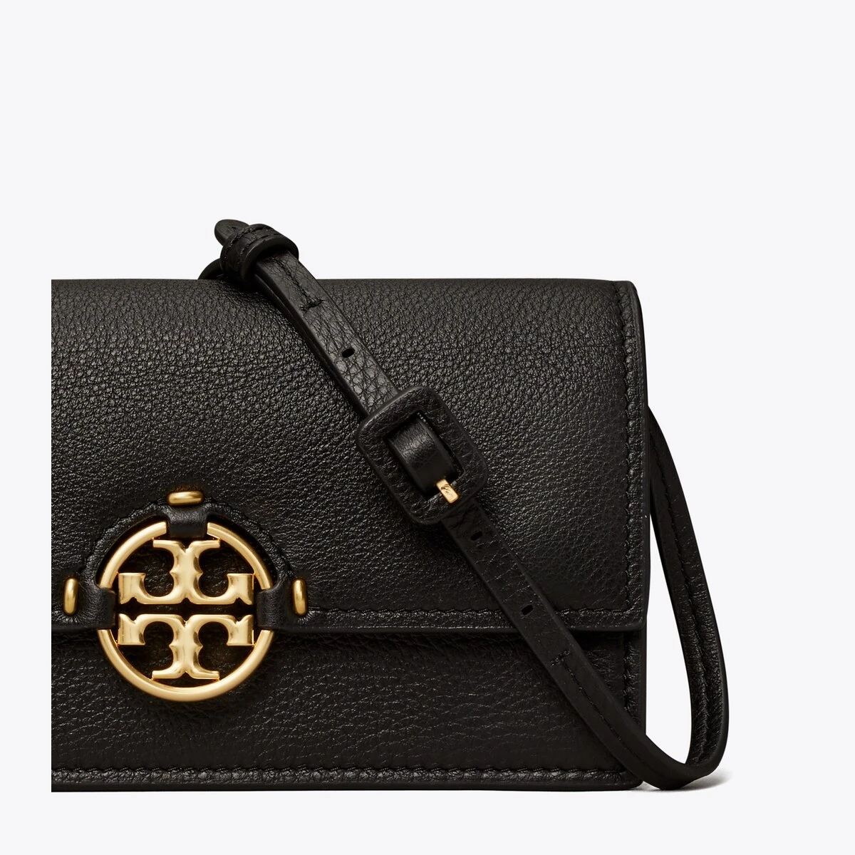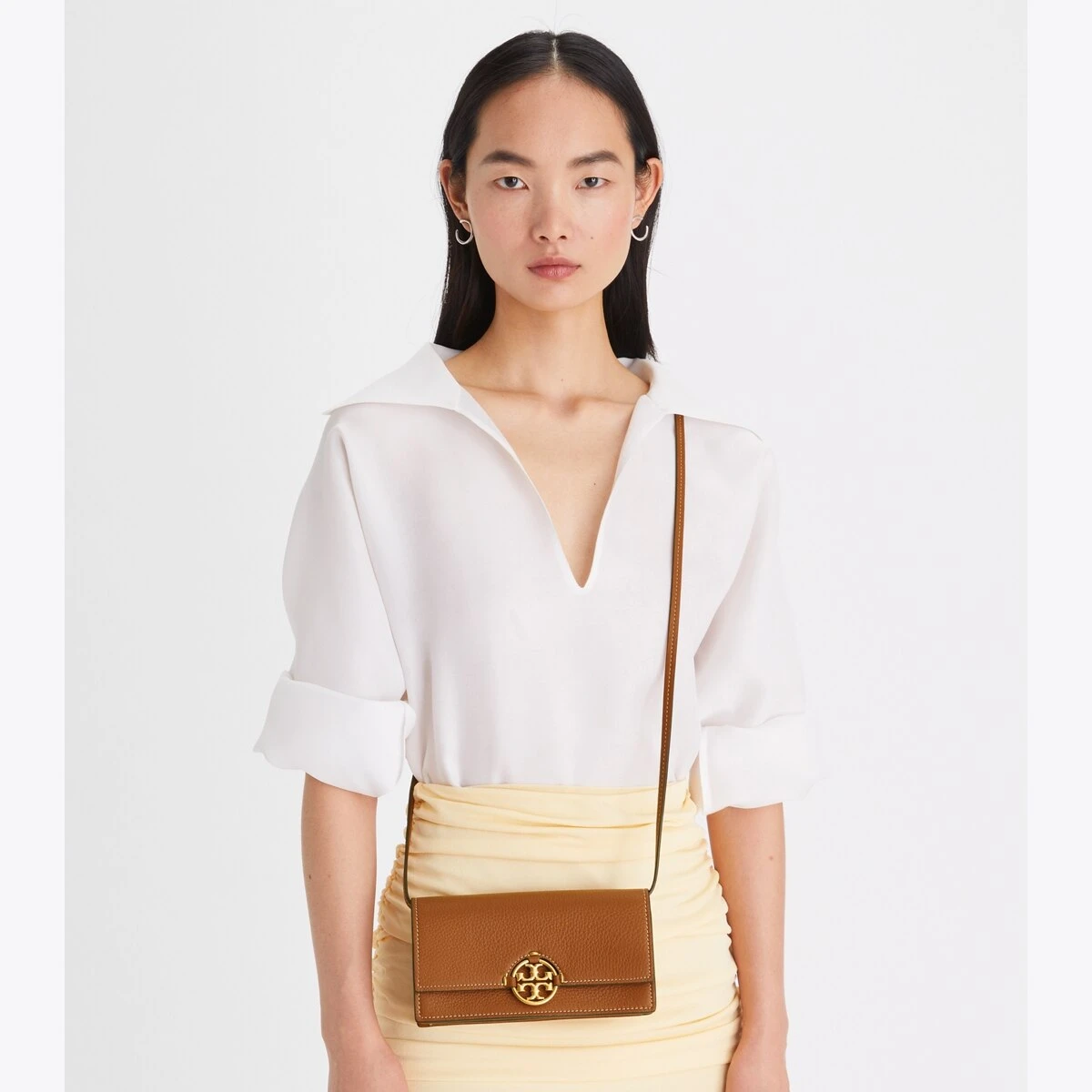A new silhouette from our iconic collection, the Miller Wallet Crossbody in natural-grain leather with our signature Double T. It has an adjustable strap and a gusseted shape that opens to multiple compartments — including a zippered pocket that fits a phone.