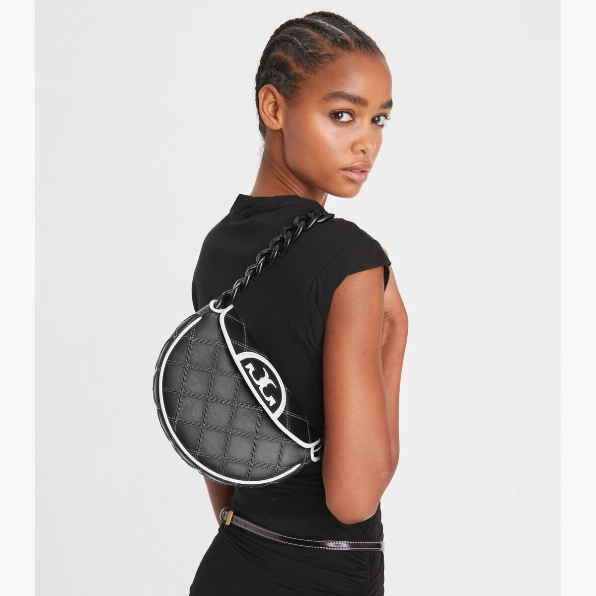 Enduring glamour. Pintucks in a diamond pattern and the softest leather. Sealed with an oversized Double T. The Mini Fleming Crescent Bag has a chunky chain strap and a secure snap closure that opens to multiple card pockets for organization. Wear it tucked under the arm or crossbody with the removable strap.