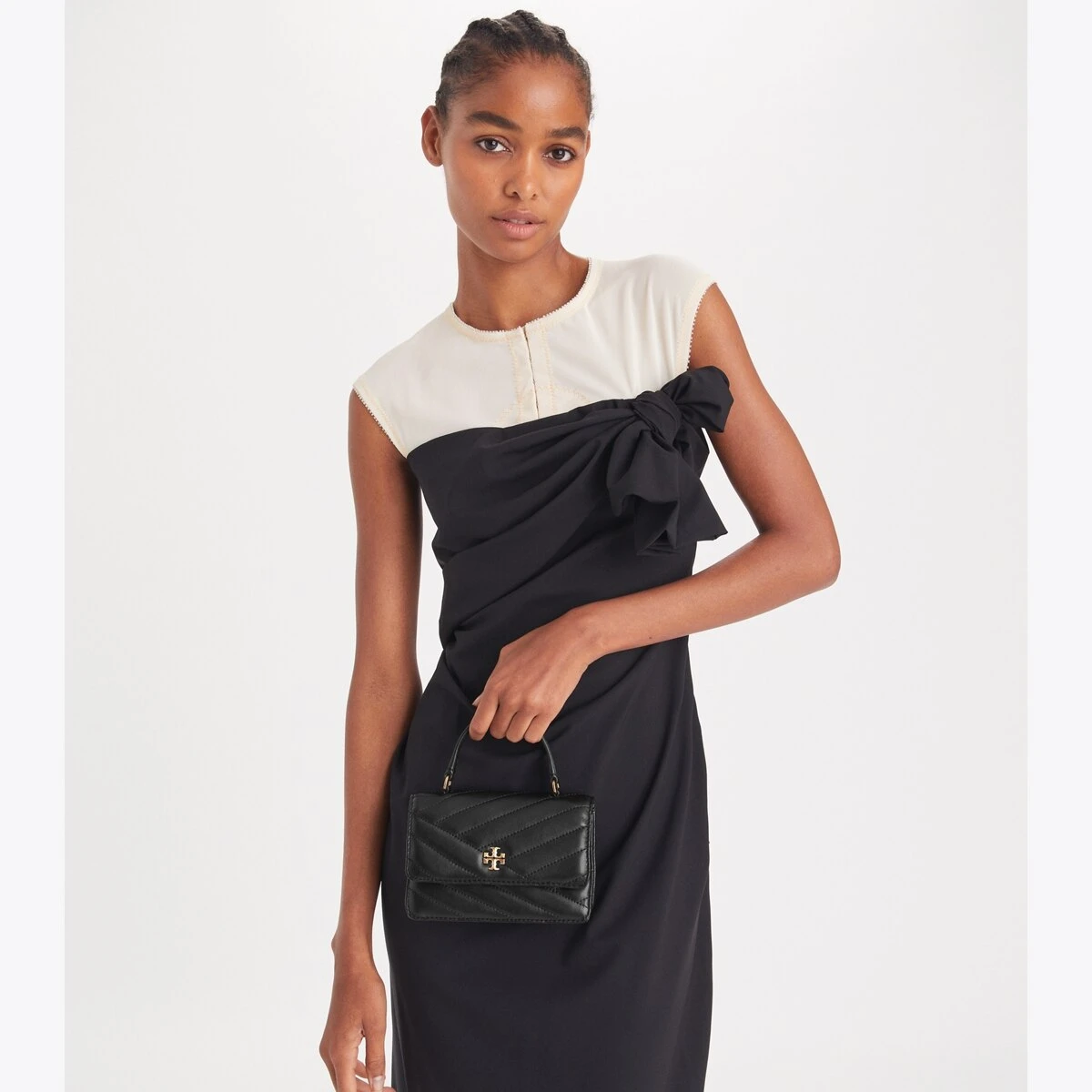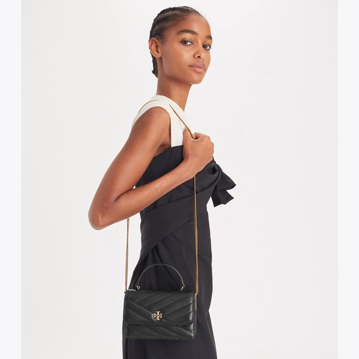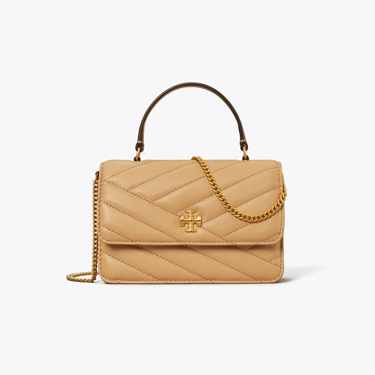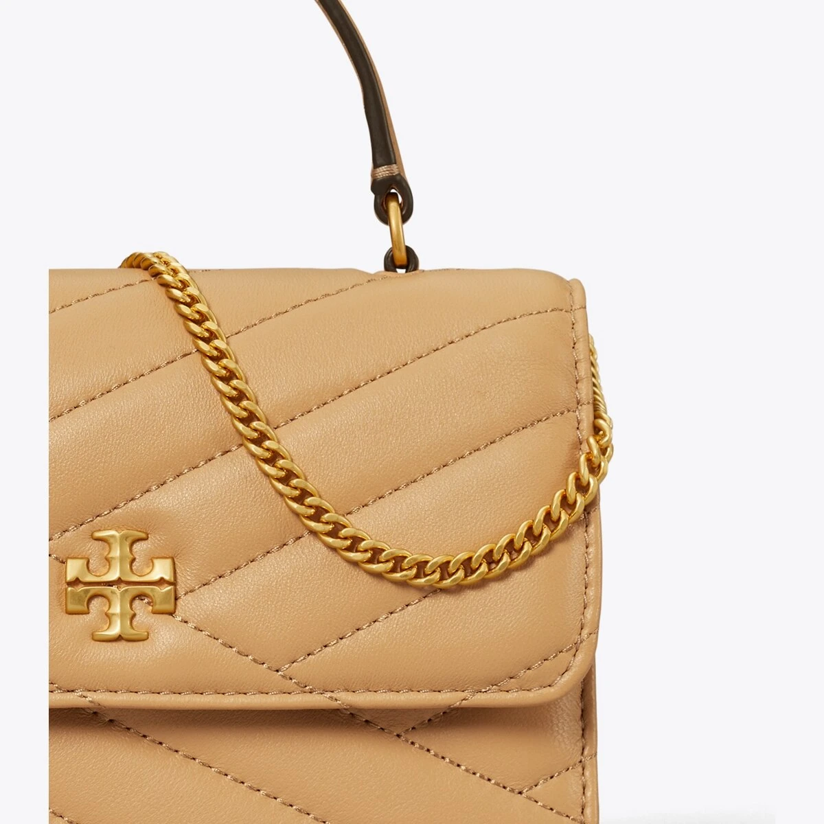 The Mini Kira Top-Handle Chain Wallet is made of soft chevron-quilted leather and features our Double T as graphic turn-lock hardware. Carry it by the top handle or with the chain shoulder strap.