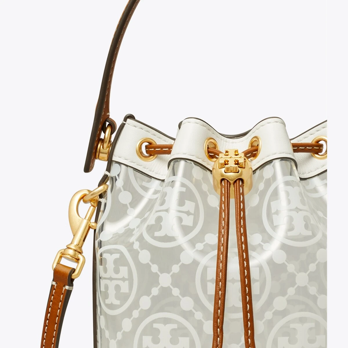 A new way of seeing T Monogram, the mini clear bucket bag closes with drawstrings, secured by our gold Double T cord stopper. Worn crossbody, the top handle falls naturally. Every detail is considered, with special attention to function and versatility.