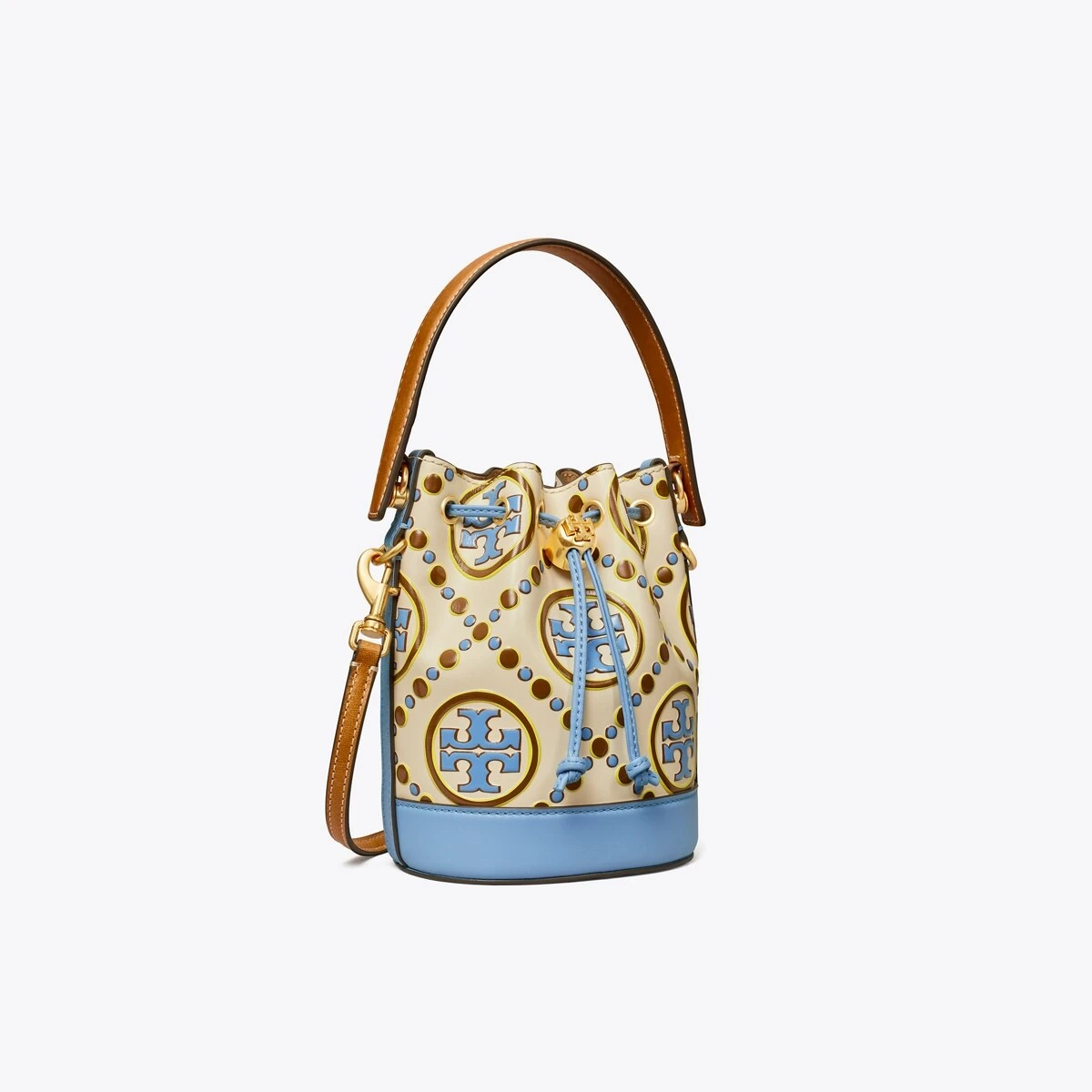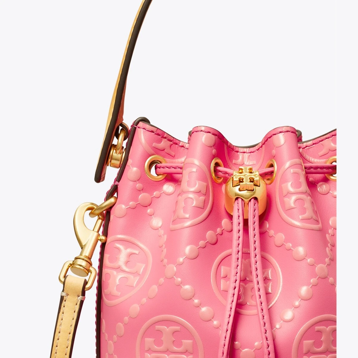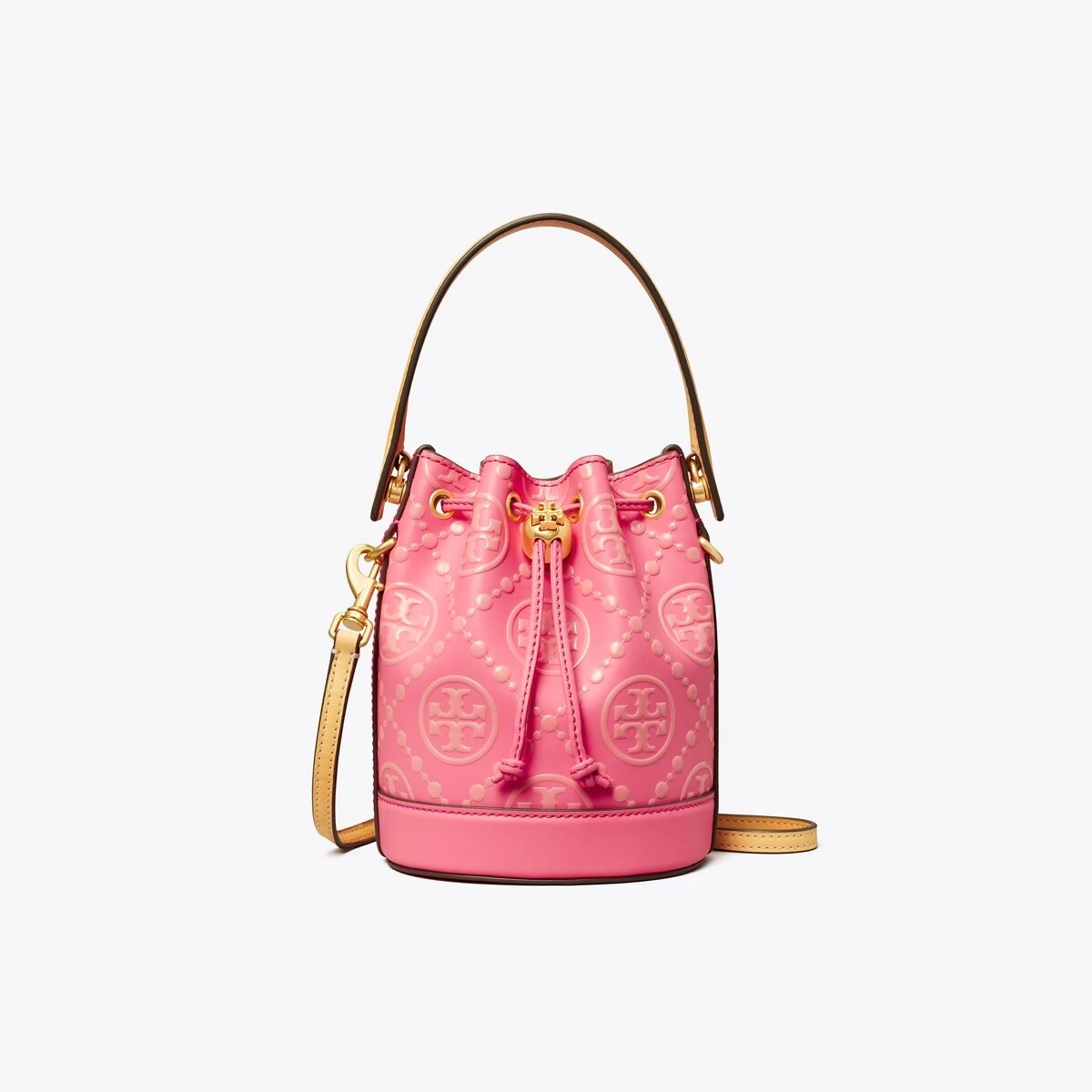 The mini bucket bag is crafted in contrast embossed leather. When worn crossbody, the top handle falls naturally. Our metal logo cord stopper works as a keeper for the drawstrings. Press and hold the Double T down while guiding the drawstrings through — and release to lock. Every detail is considered, with special attention to function and versatility.