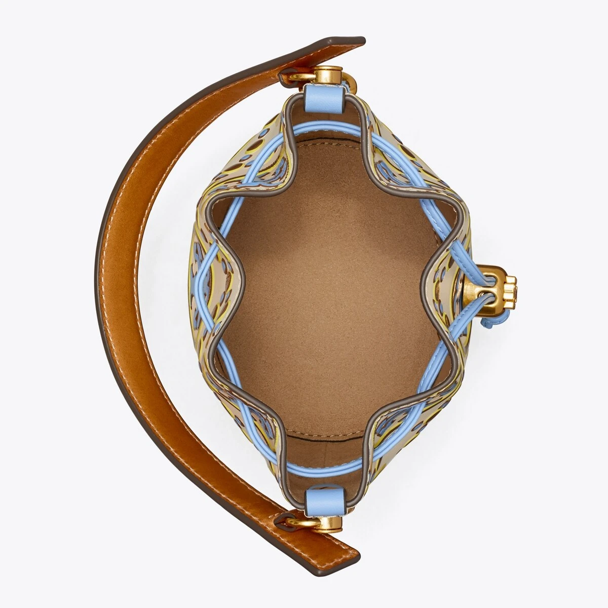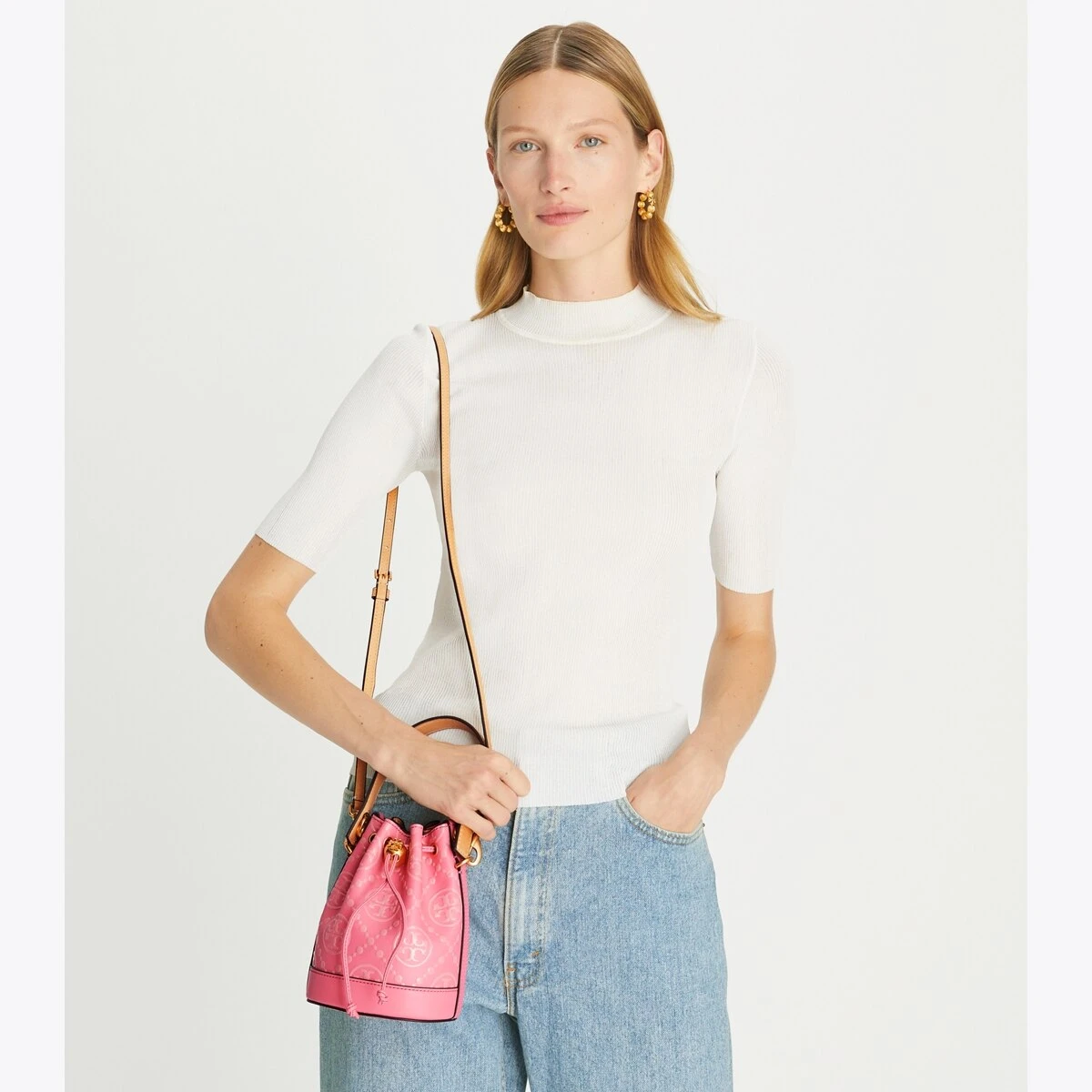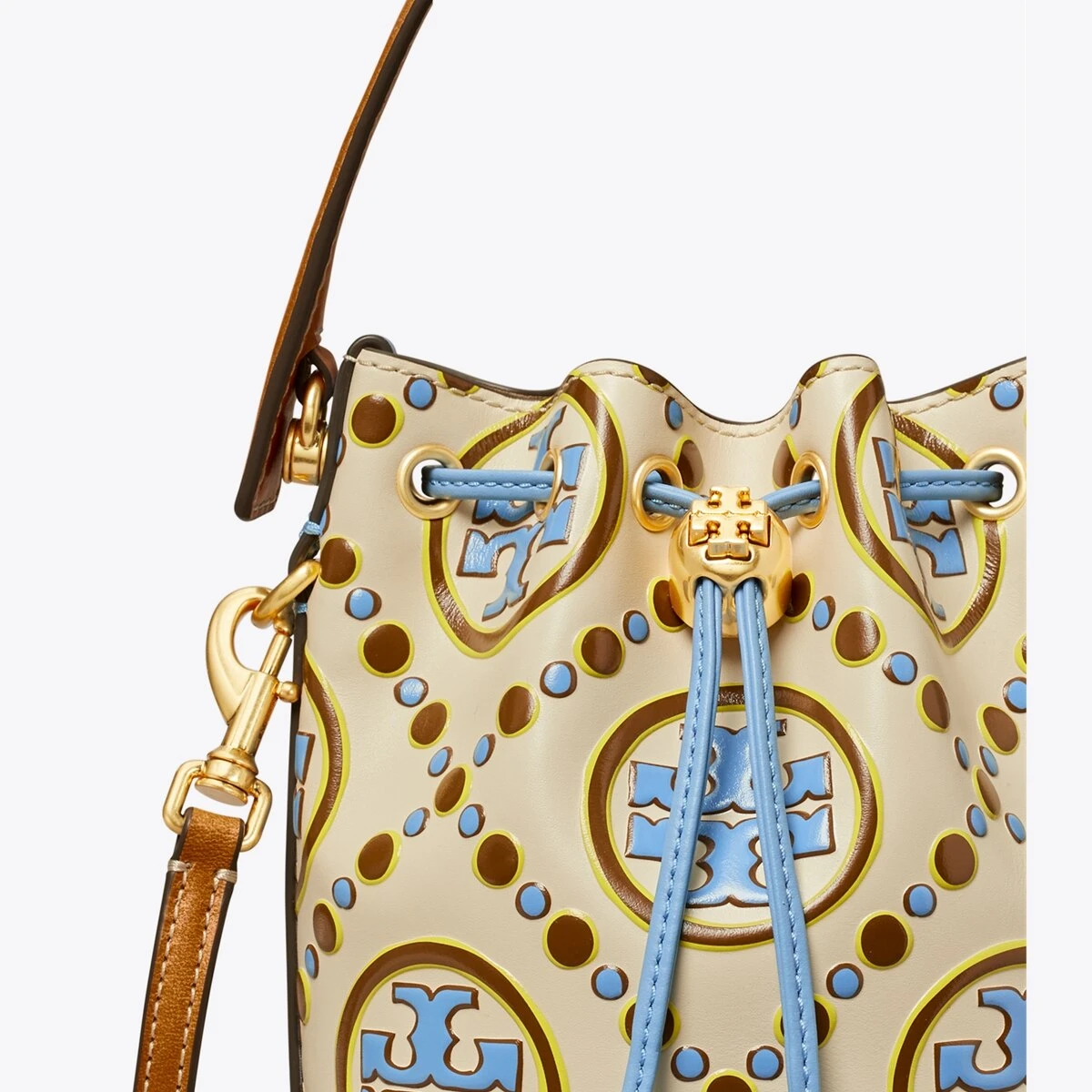 The mini bucket bag is crafted in contrast embossed leather. When worn crossbody, the top handle falls naturally. Our metal logo cord stopper works as a keeper for the drawstrings. Press and hold the Double T down while guiding the drawstrings through — and release to lock. Every detail is considered, with special attention to function and versatility.