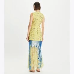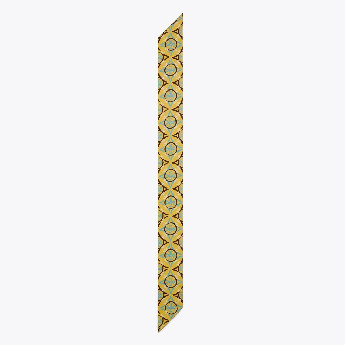Our new silk twill ribbon tie combines a mix of bold color and pattern. The print, a hand-painted graphic based on our signature T Monogram pattern, has a graphic mosaic on one side, and a pair of bold yellow stripes on the other. A versatile accessory, wear it loosely knotted around the neck or as a hair tie or headband, or add it to a handbag.