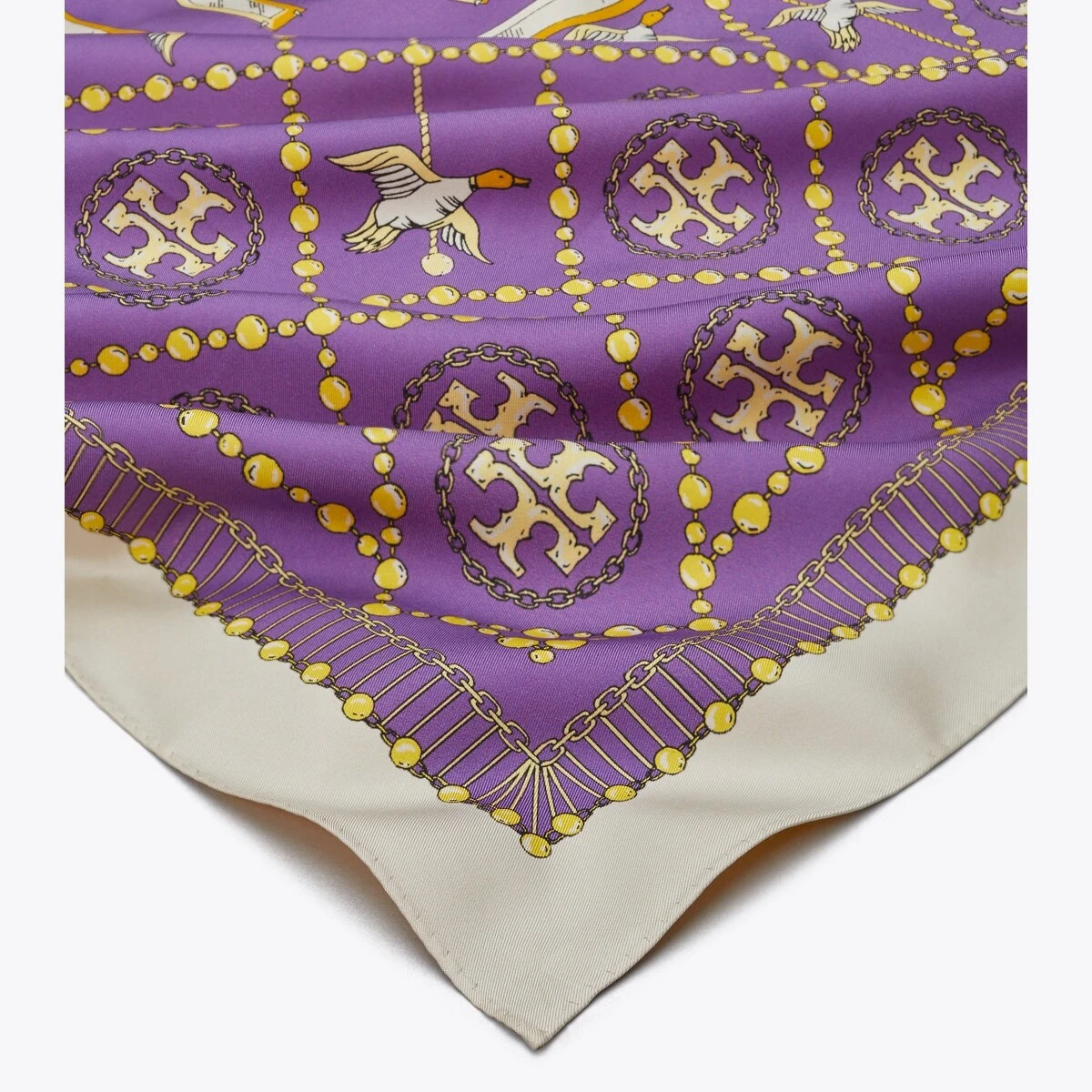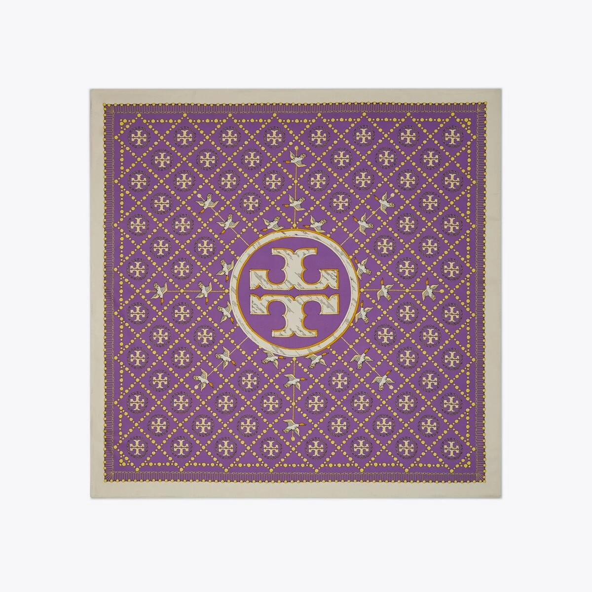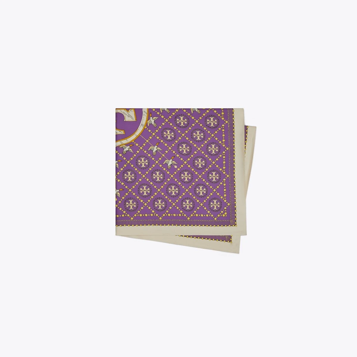 The T Monogram is a classic pattern inspired by traditional Pennsylvania Dutch quilting. Crafted in silk twill, a pearl and duck motif intertwines with our signature monogram. Wear the reversible square scarf loosely draped, wrapped or knotted at the neck.