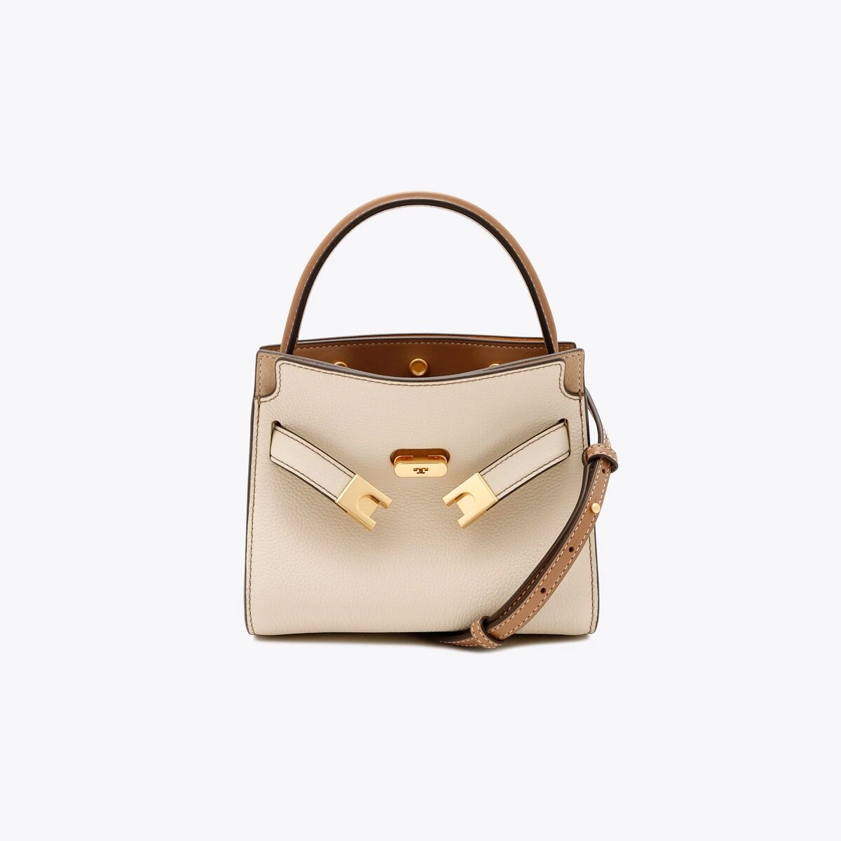 Our Petite Lee Radziwill Double Bag contrasts structure and softness, and a mix of materials. A little bit undone, the drape and sense of volume are fundamental to the design. Composed of layers that unfold like the collar of a trench coat, it can be worn open, semi-buttoned or fully closed. Beautifully crafted in pebbled leather and suede, with signature lock-and-key hardware. The collection is named for Lee Radziwill, who was fearlessly unique.