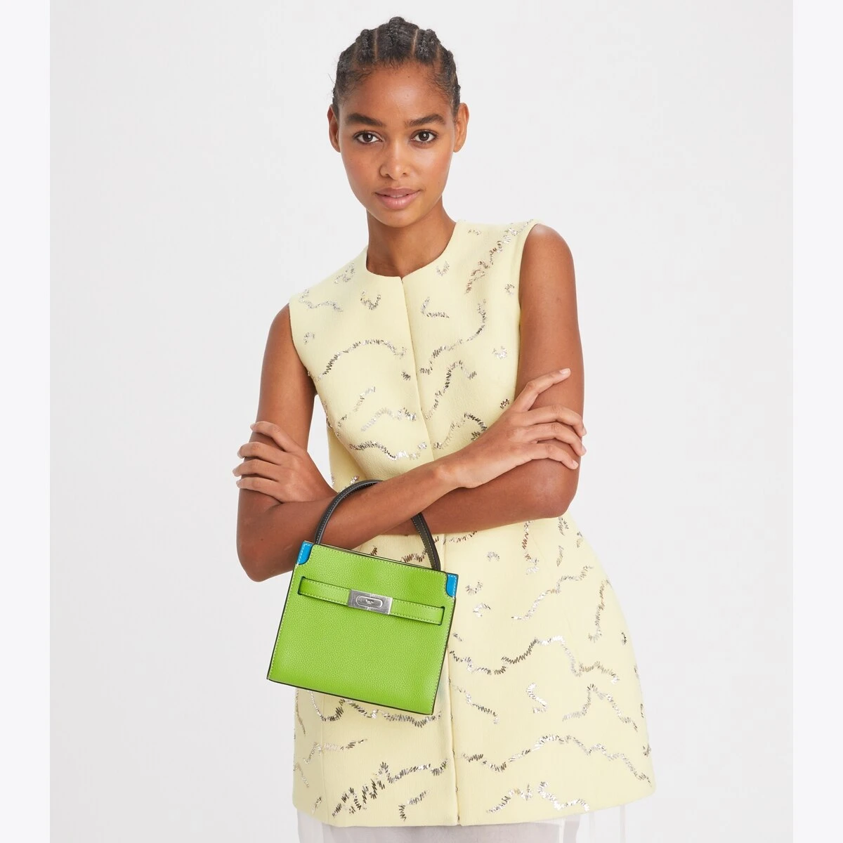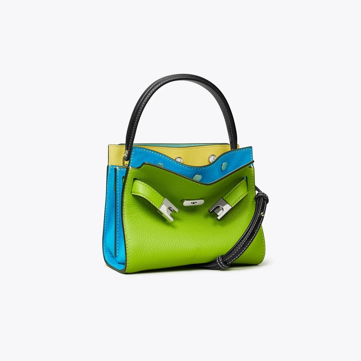 Our Petite Lee Radziwill Double Bag contrasts structure and softness, and a mix of materials. A little bit undone, the drape and sense of volume are fundamental to the design. Composed of layers that unfold like the collar of a trench coat, it can be worn open, semi-buttoned or fully closed. Beautifully crafted in pebbled leather and suede, with signature lock-and-key hardware. The collection is named for Lee Radziwill, who was fearlessly unique.