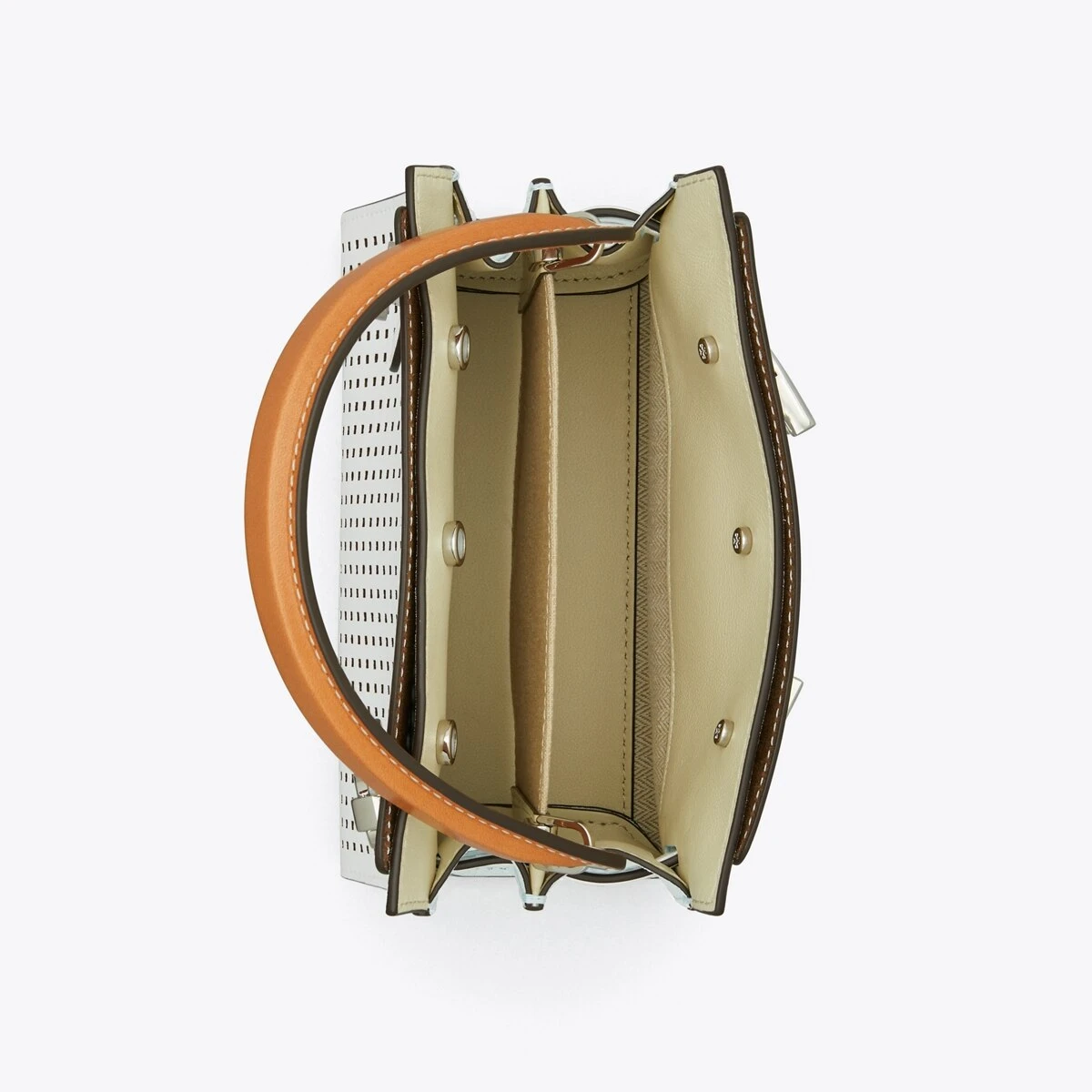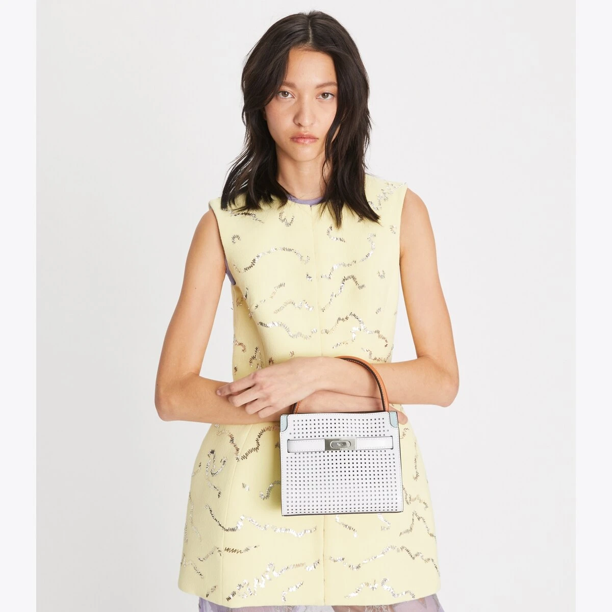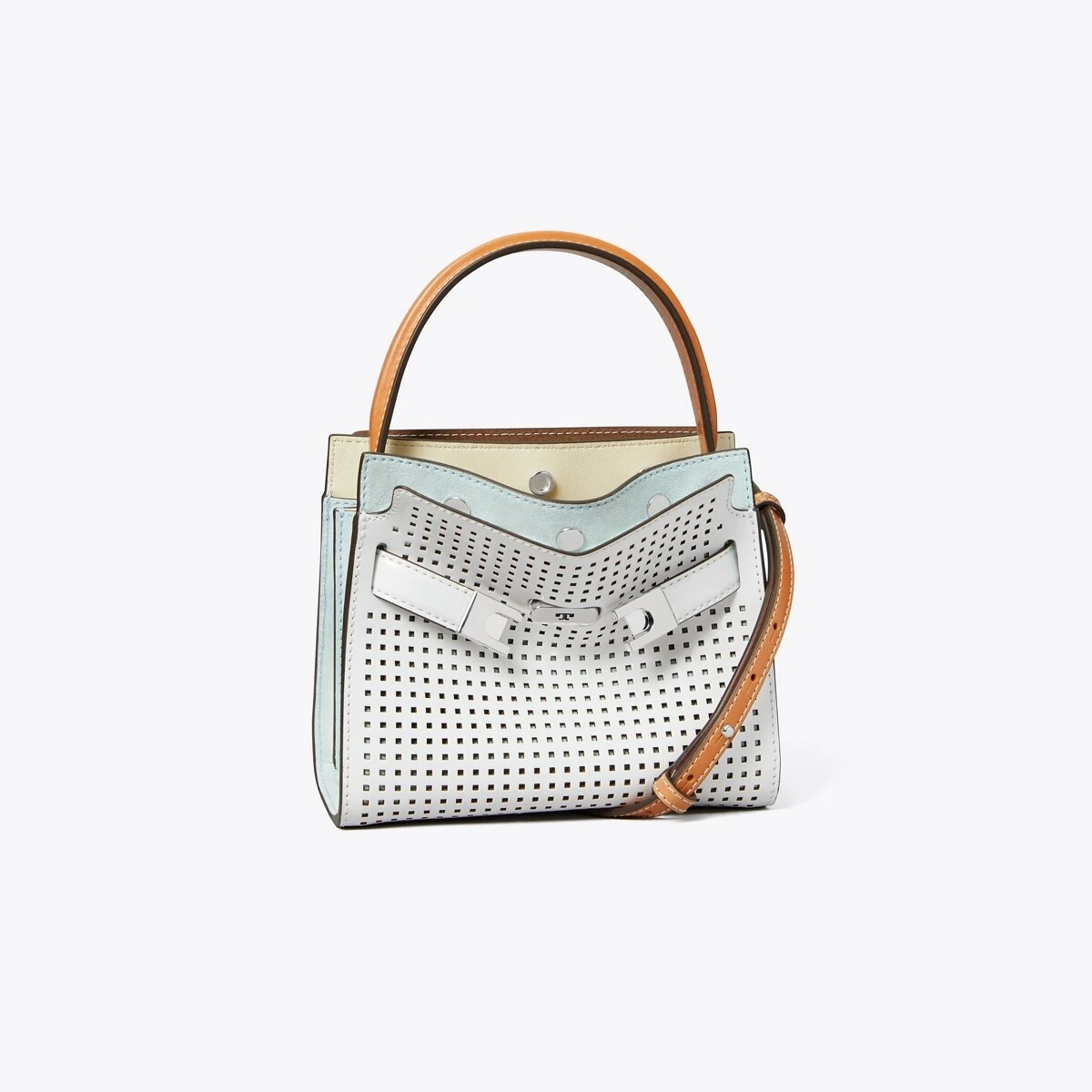 Our Petite Lee Radziwill Double Bag contrasts structure and softness, and a mix of materials. A little bit undone, the drape and sense of volume are fundamental to the design. Composed of layers that unfold like the collar of a trench coat, it can be worn open, semi-buttoned or fully closed. Beautifully crafted in perforated leather and suede, with signature lock-and-key hardware. The collection is named for Lee Radziwill, who was fearlessly unique.