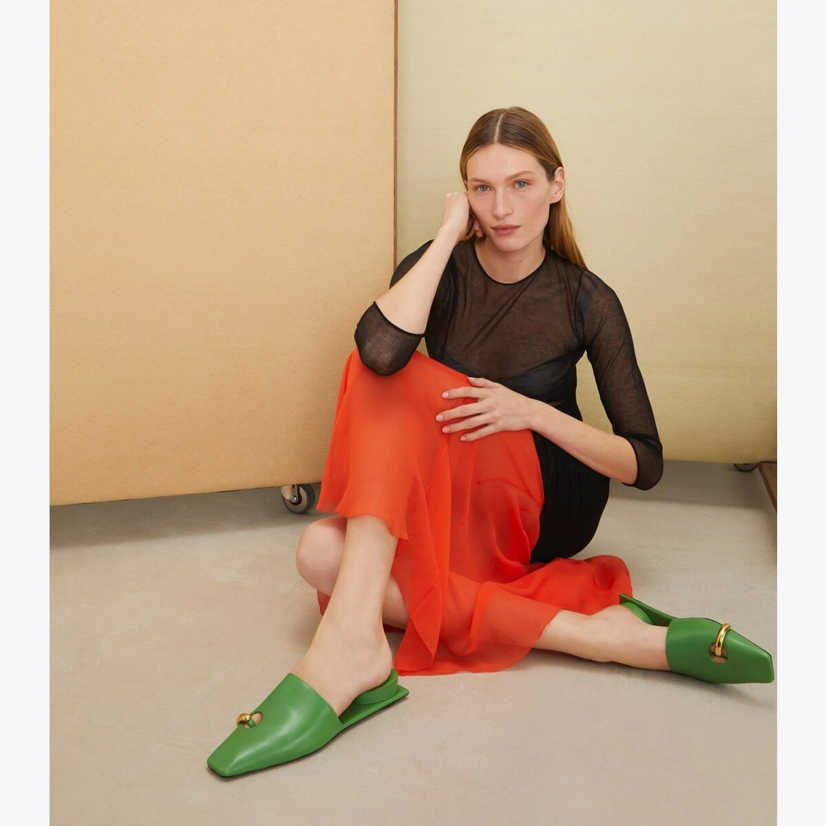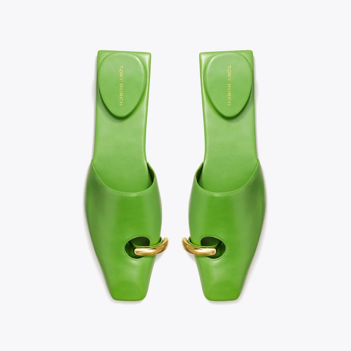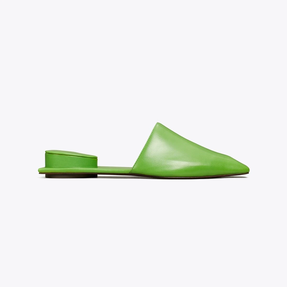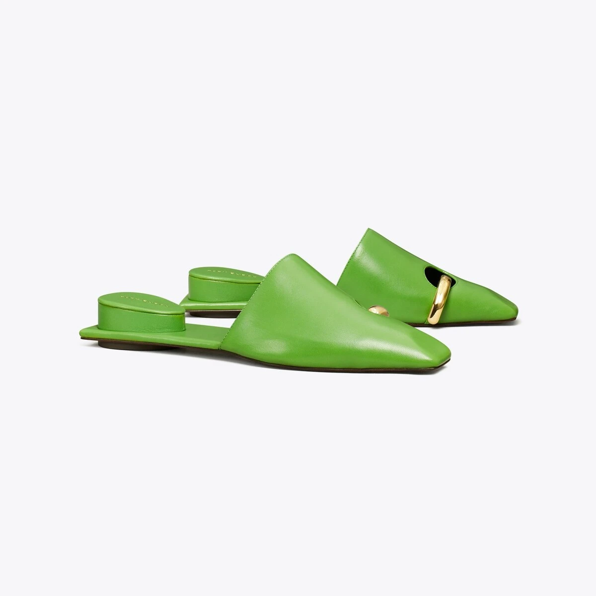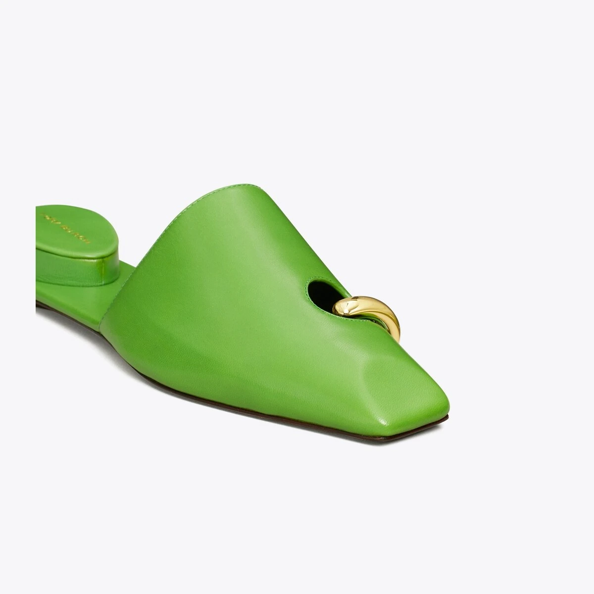 Surreal and innovative. A juxtaposition of shape and function. Crafted in sleek leather with brass hardware creating the illusion of a pierced toe. The sculptural mule also features an inverted heel cushion, offering a comfortable sandal to dress up jeans or a skirt.