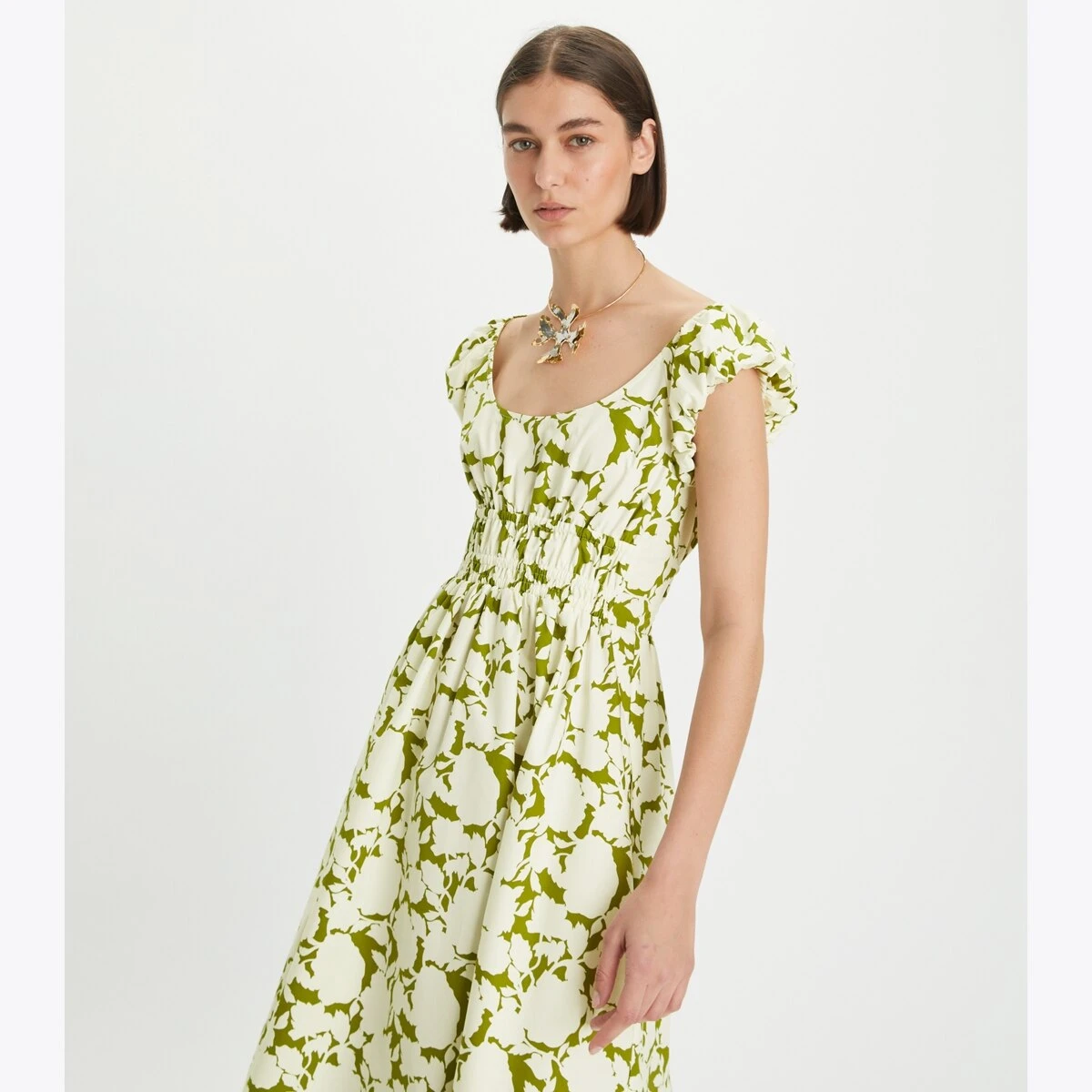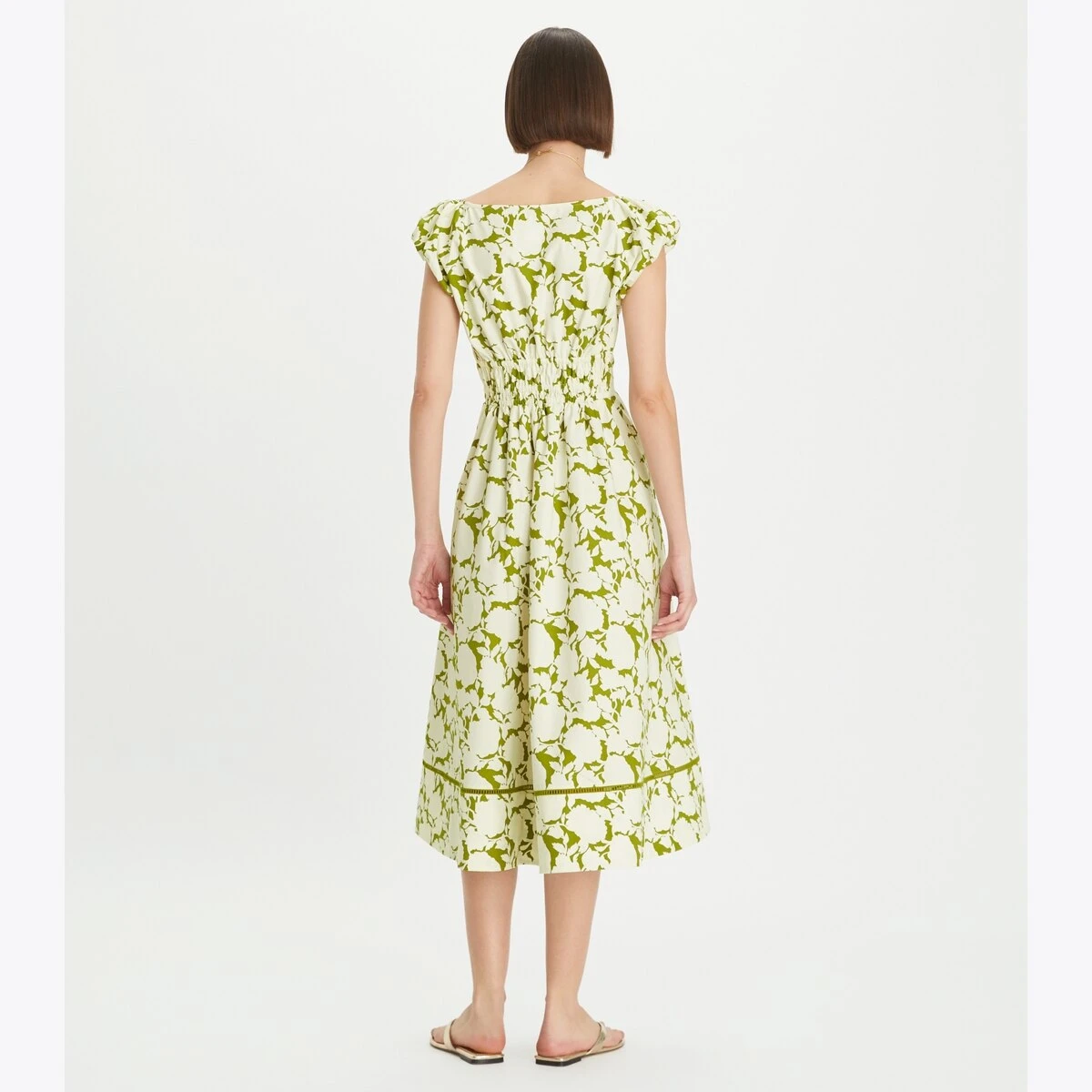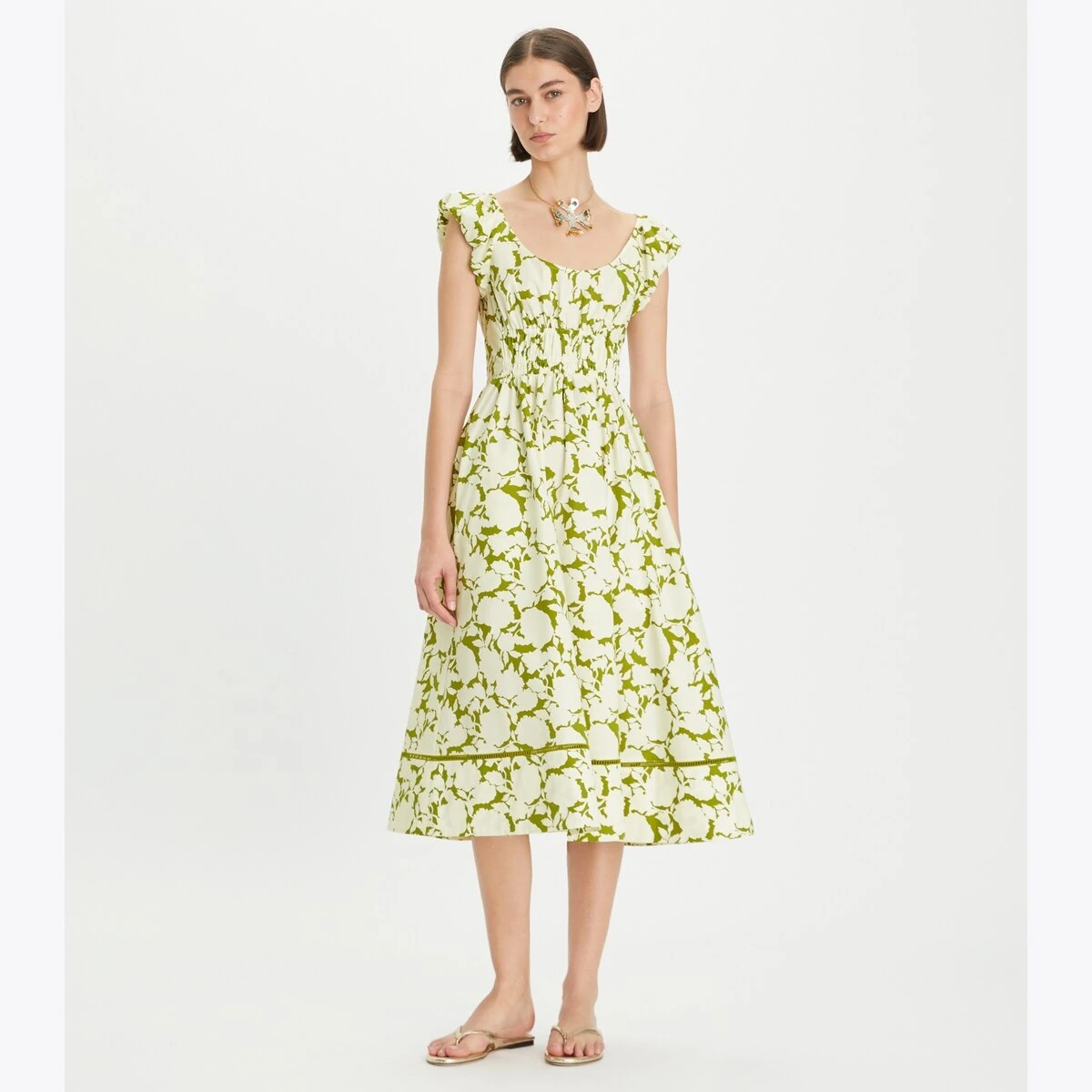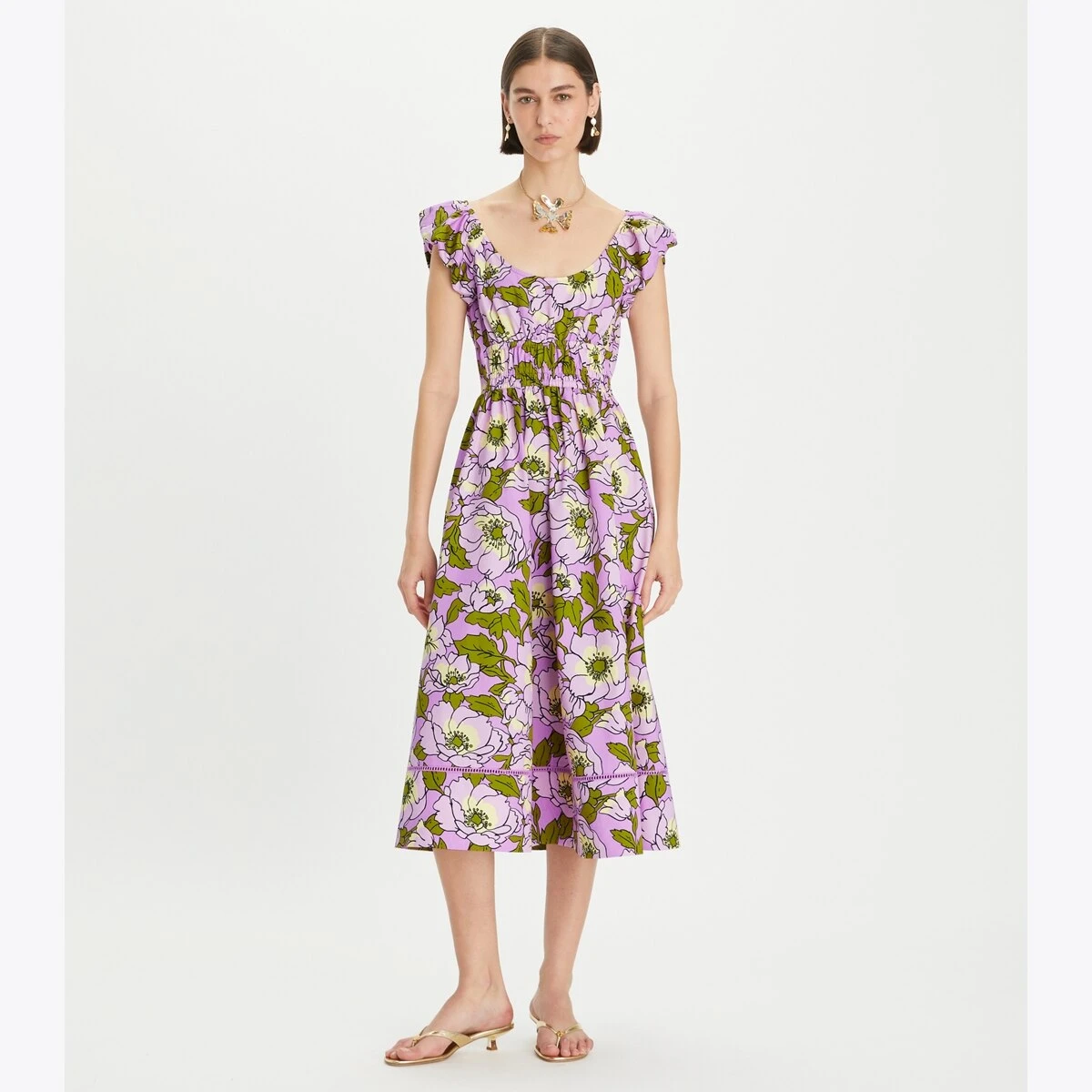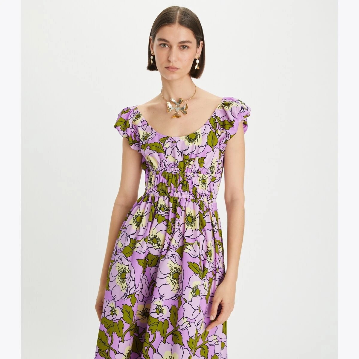 The Scoop-Neck Dress is bright and effortless — a perfect style for warm weather. It is crafted from lightweight cotton poplin and updated in a bold floral. It has a fit and flare silhouette, smocked top, and gently puffed cap sleeves to balance proportions.