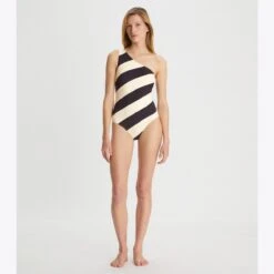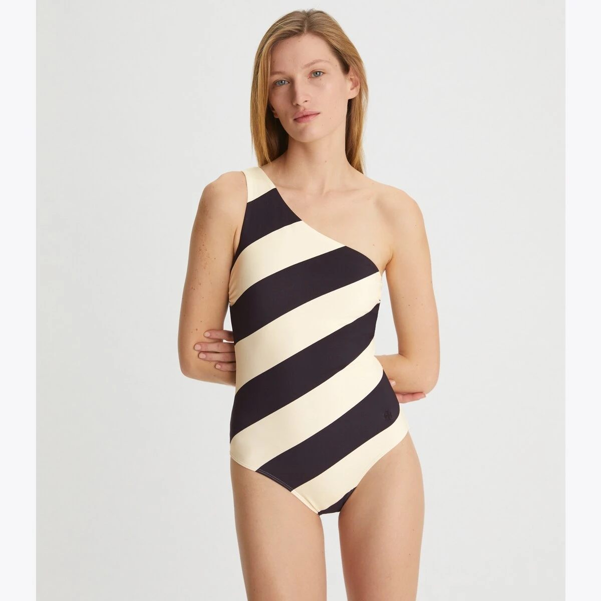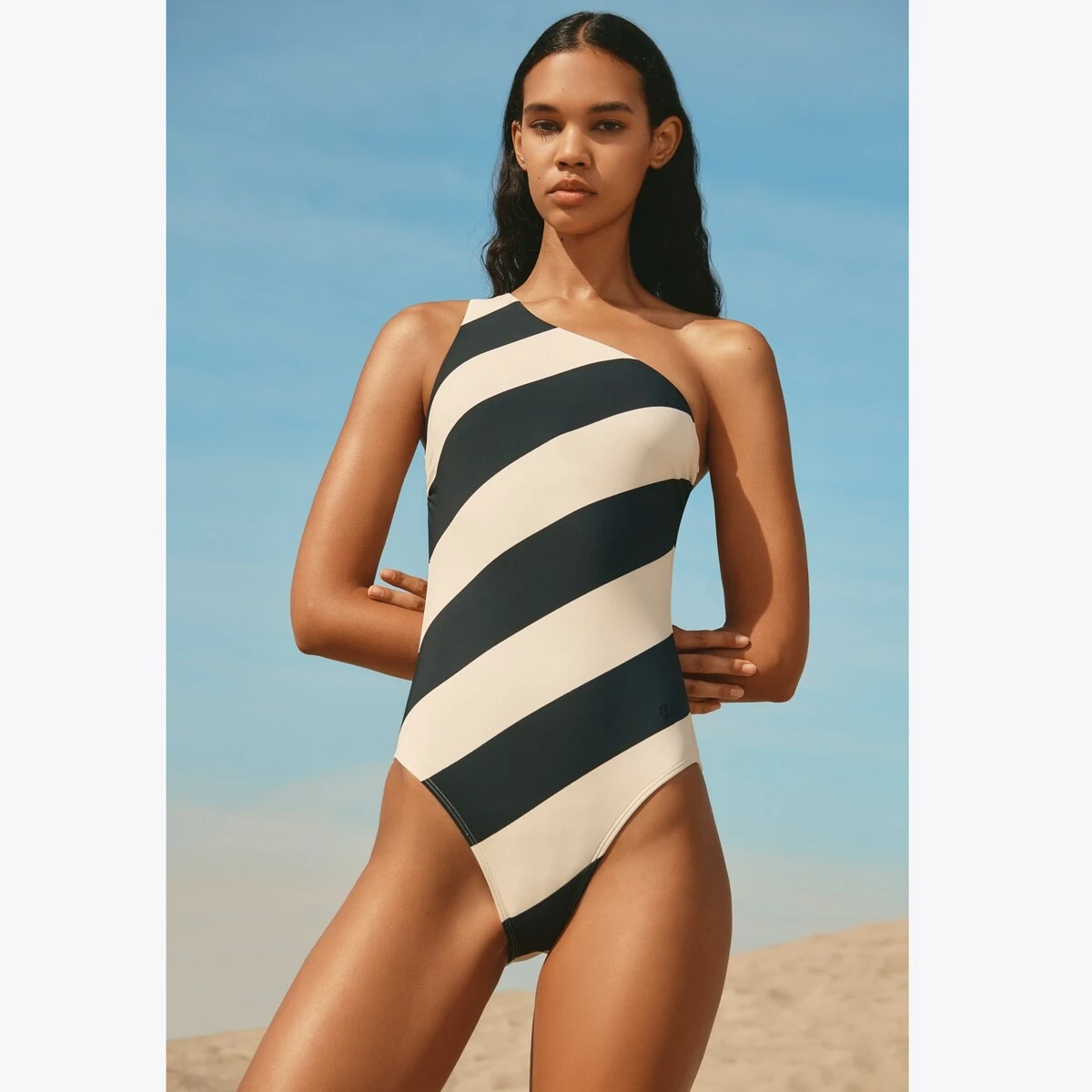 An asymmetrical single strap and bold diagonal stripes give this one-shoulder one-piece a modern edge. Made of the highest-quality Sensitive® Fabrics by Eurojersey (a world-renowned source from Italy), which feature four-way stretch, impeccable fit, long lifespan and SPF 50 sun protection.