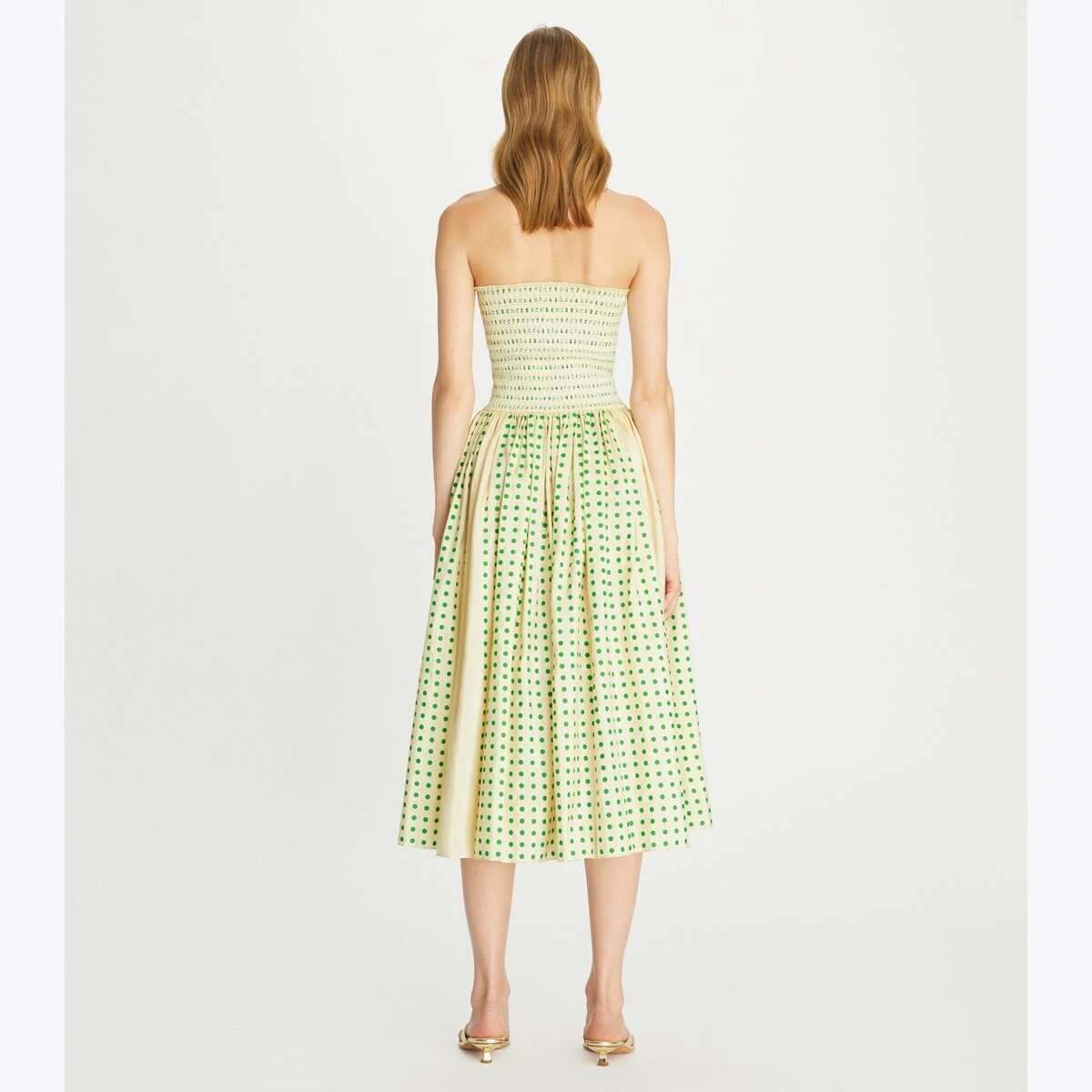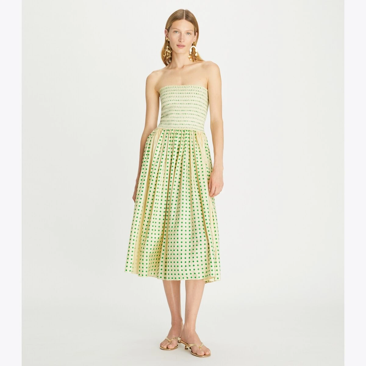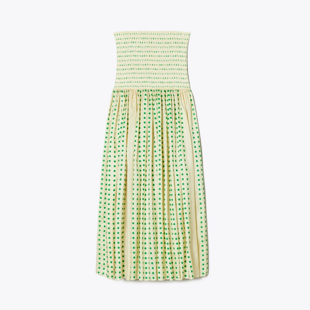 This strapless dress is crafted from hand-woven silk dupioni, which is thicker and stronger than traditional silk. A smocked bodice delivers a custom fit, while the softly gathered skirt falls effortlessly — its easy movement enhanced by alternating green-and-white polka dots.