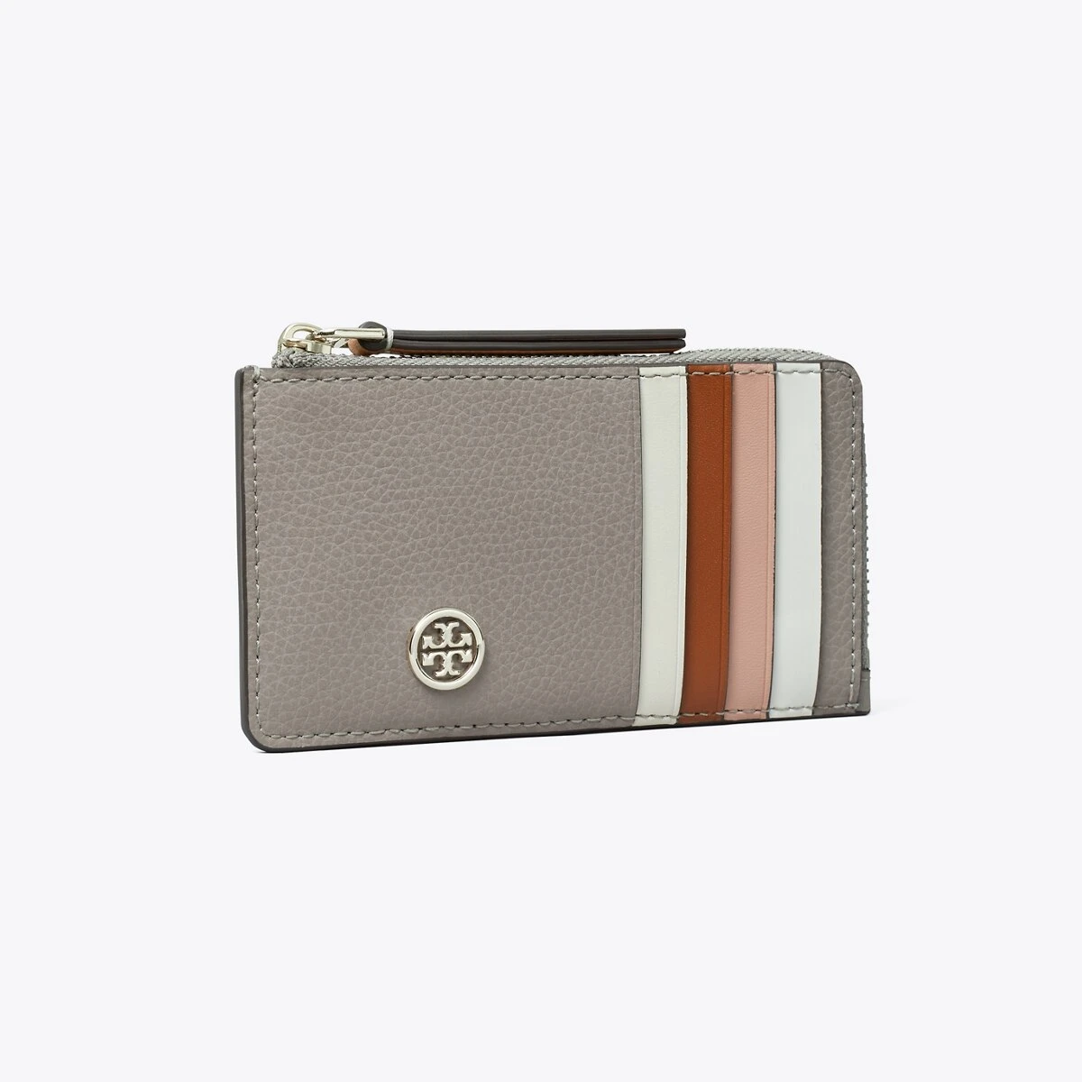 From our collection inspired by Tory’s parents, Buddy and Reva Robinson. Inspired by their love of travel, the timeless, versatile silhouettes are designed for everyday use. Our Robinson Top-Zip Card Case is made of soft pebbled leather, with a zippered coin pouch and multiple pockets.
