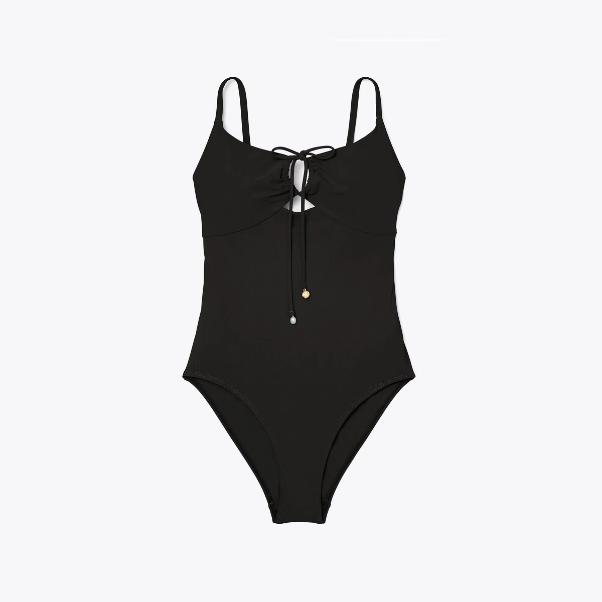 A feminine silhouette with retro glamour, our ruched one-piece has ties finished with a pearl on one side and a gold knot on the other. It’s flattering and versatile in classic black. Made of the highest-quality Sensitive® Fabrics by Eurojersey (a world-renowned source from Italy), which feature four-way stretch, impeccable fit, long lifespan and SPF 50 sun protection.