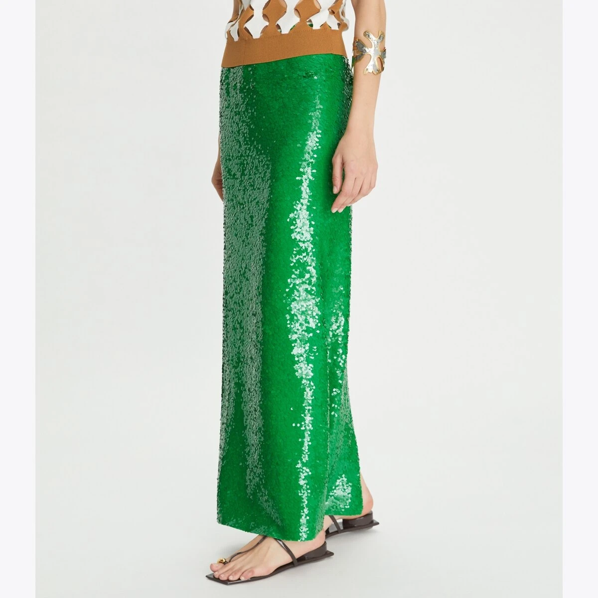 This full-length skirt delivers full-on glamor with all-over sequins in a vibrant summer green, while the smooth lining and stretch waistband ensure comfortable wear. Amp it up with a silk top or dress it down with a cotton t-shirt.