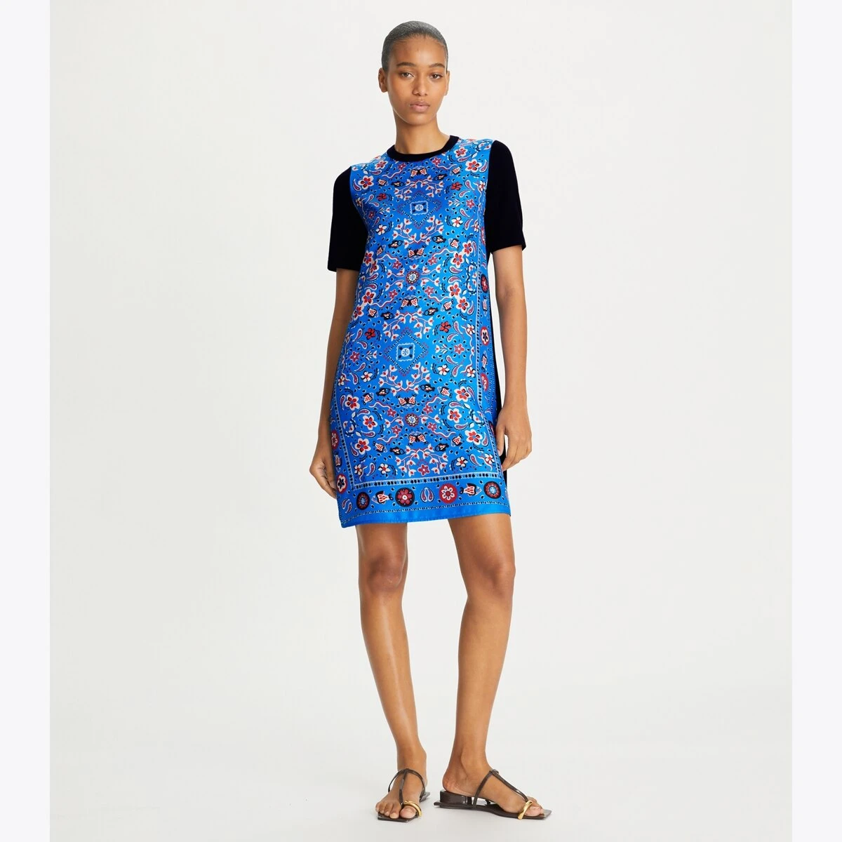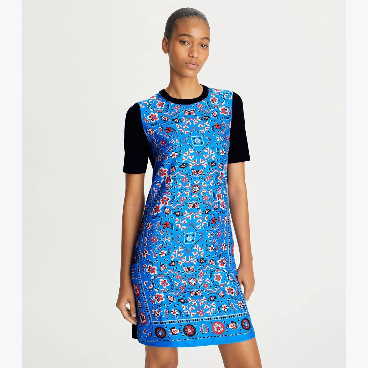 Crafted in a vibrant symmetrical print silk twill and merino wool, our sweater dress is a versatile piece that is easy to wear from season to season. Wear on its own now, and layer under a cardigan when the weather cools down.