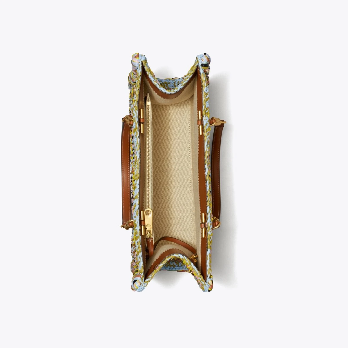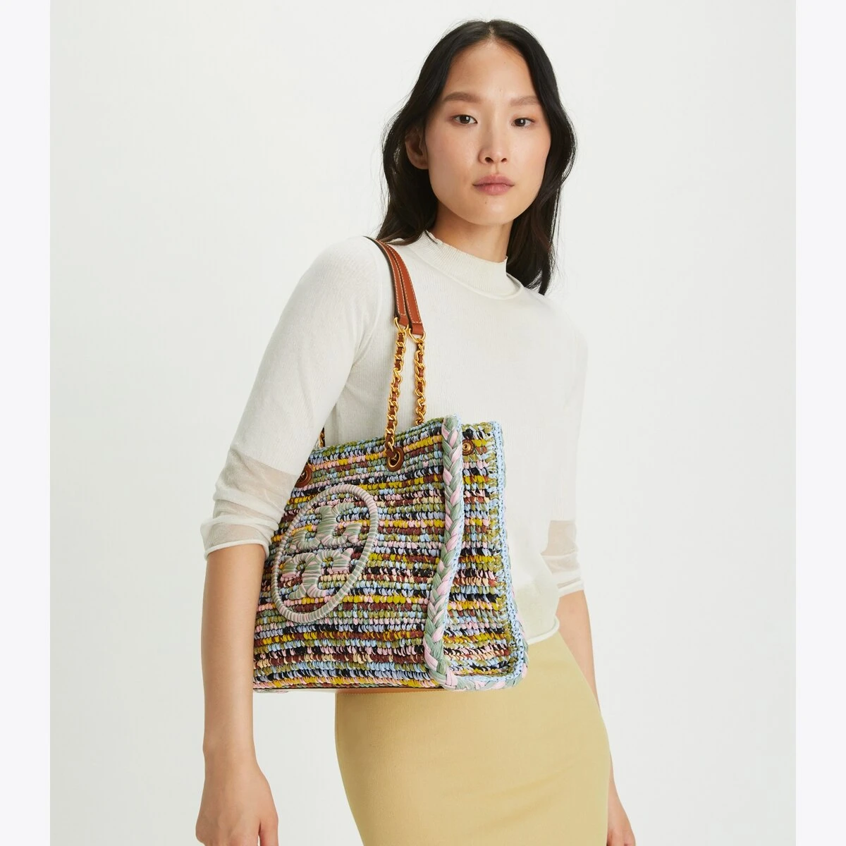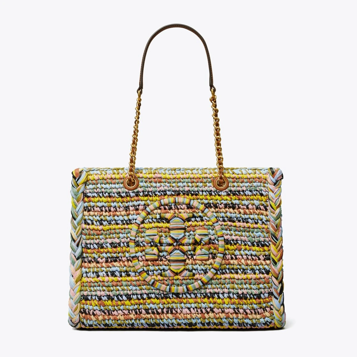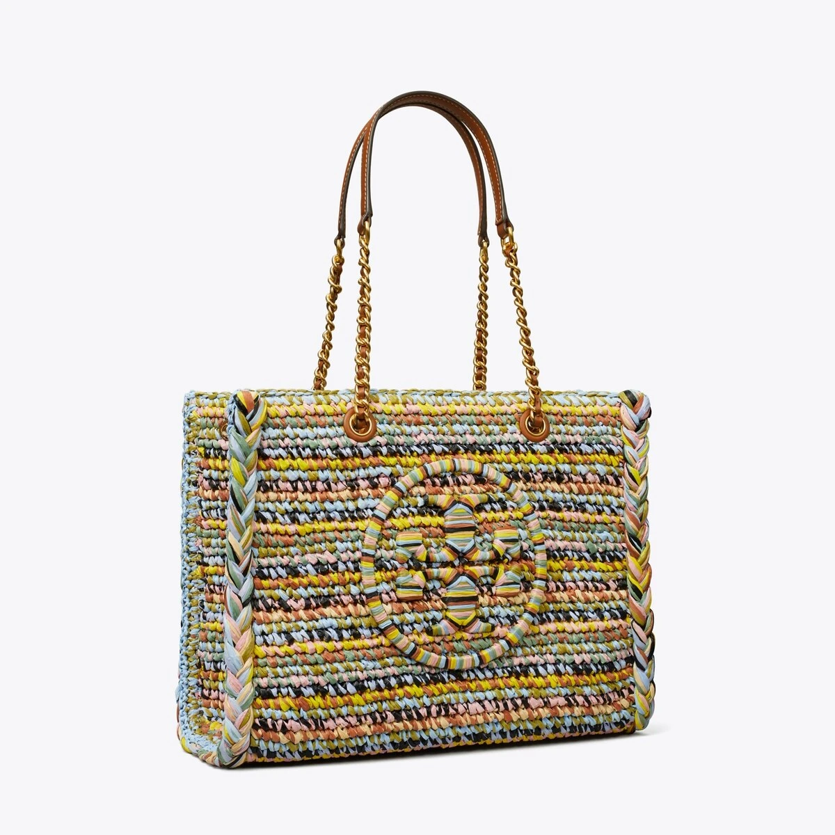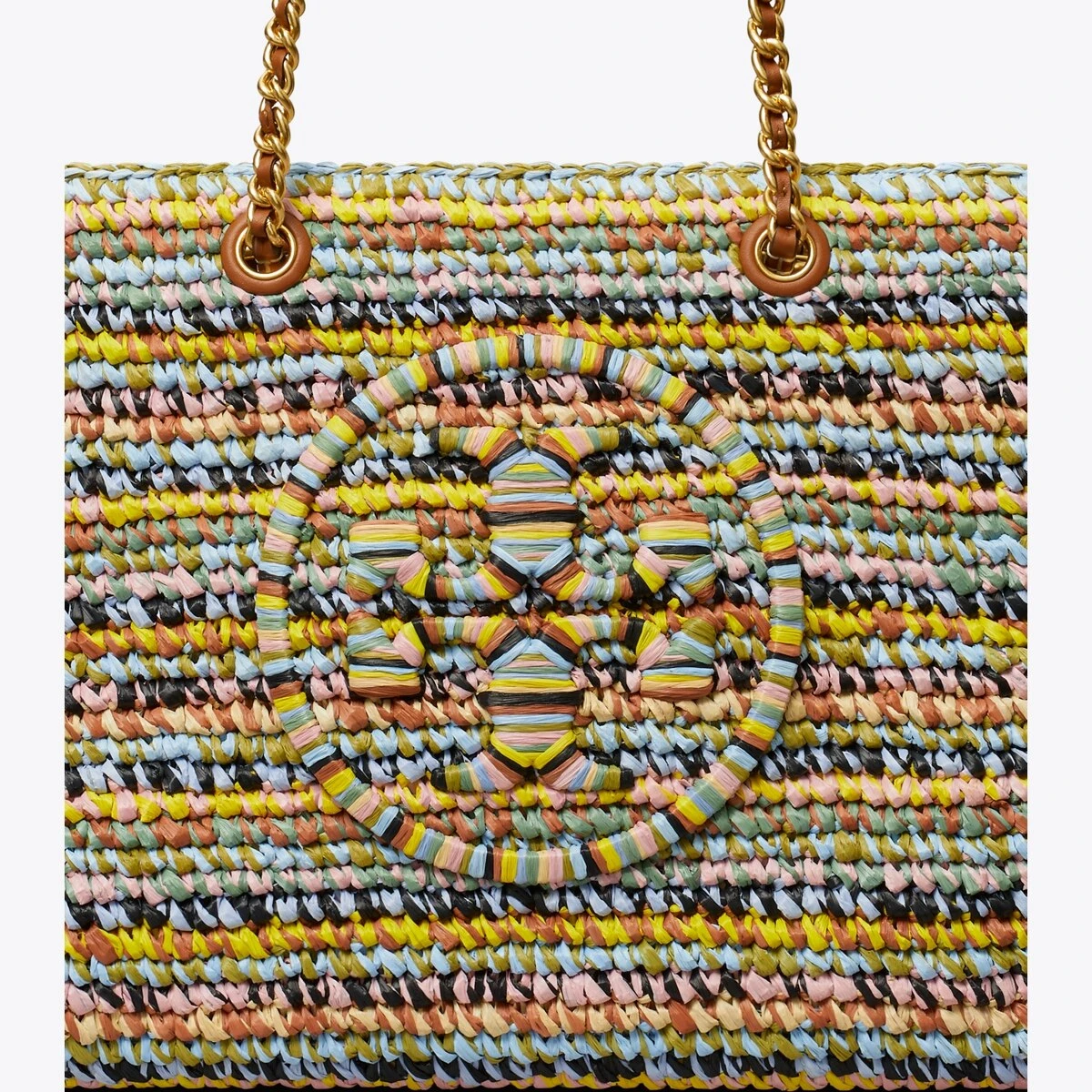 A quintessential summer handbag. The Ella Chain Tote is crafted in a mélange of hand-woven raffia and a versatile palette. The inside is lined in structured canvas, with a removable zippered pouch to keep essentials organized.
