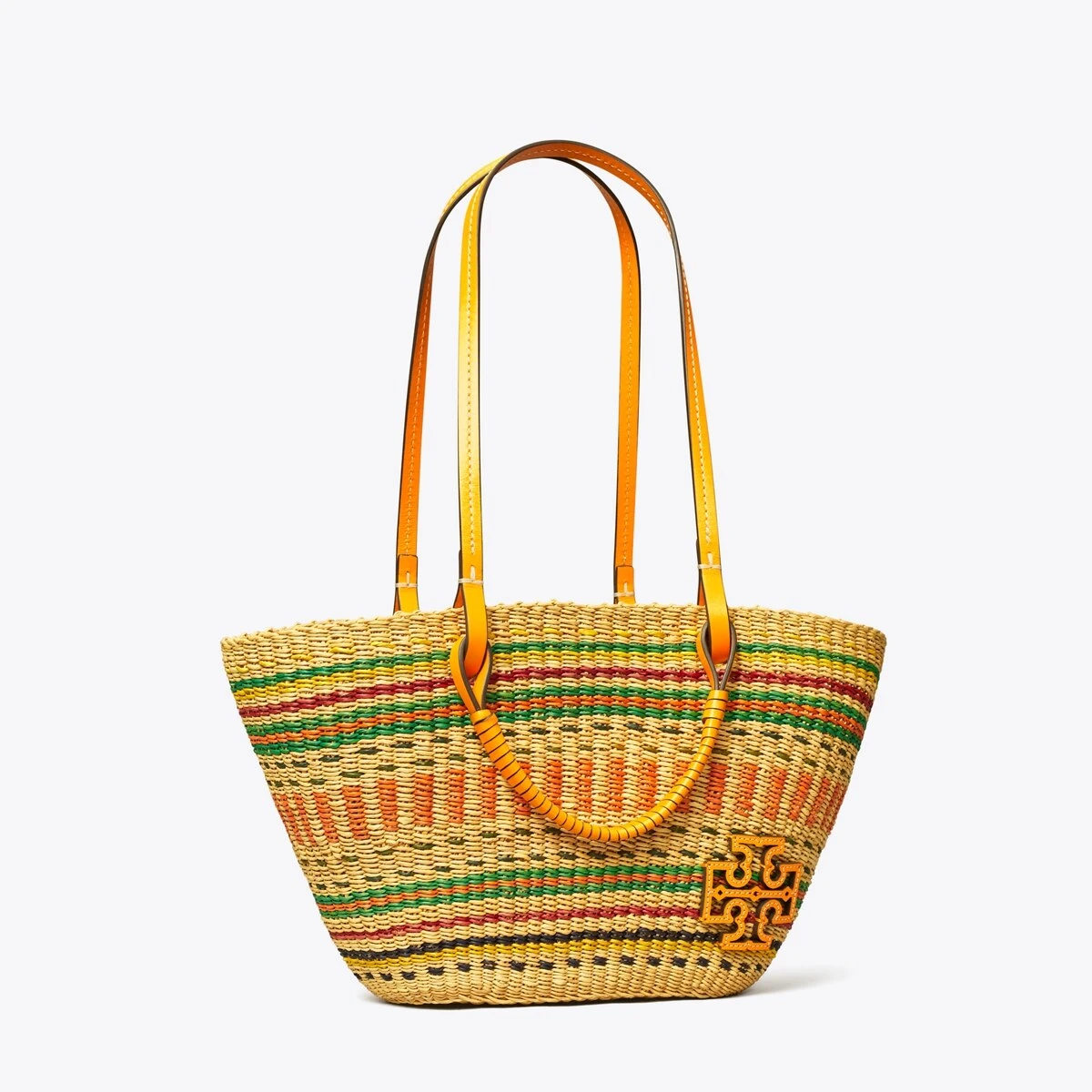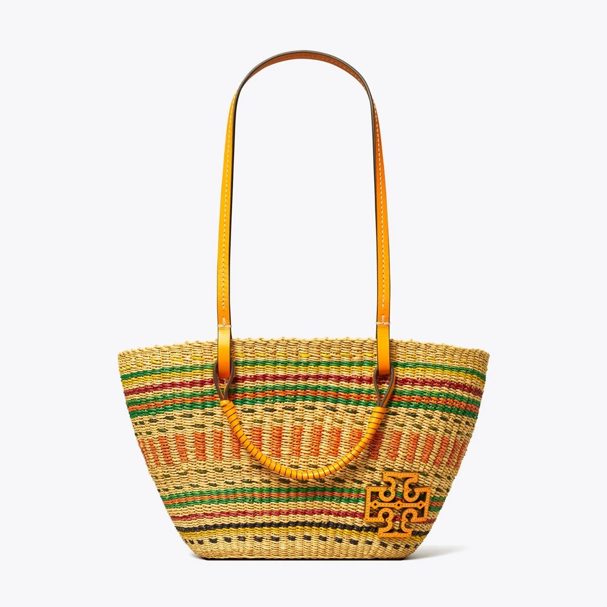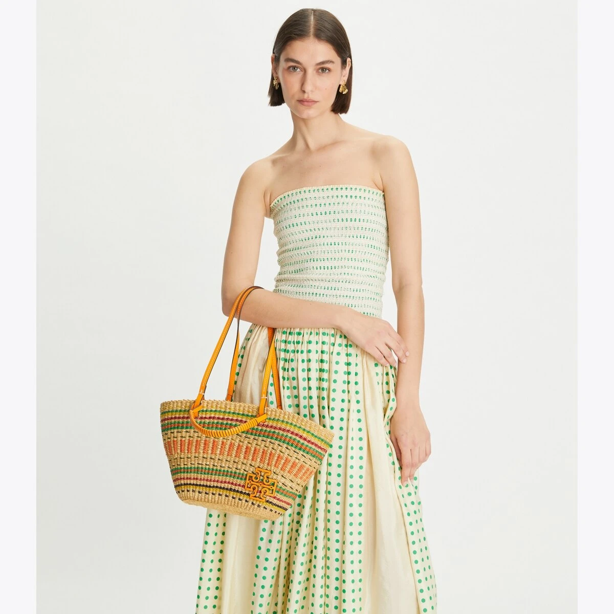 - Leather wrapped straw top handles with 4.7″ (12cm) drop; leather shoulder strap with 11″ (28cm) drop