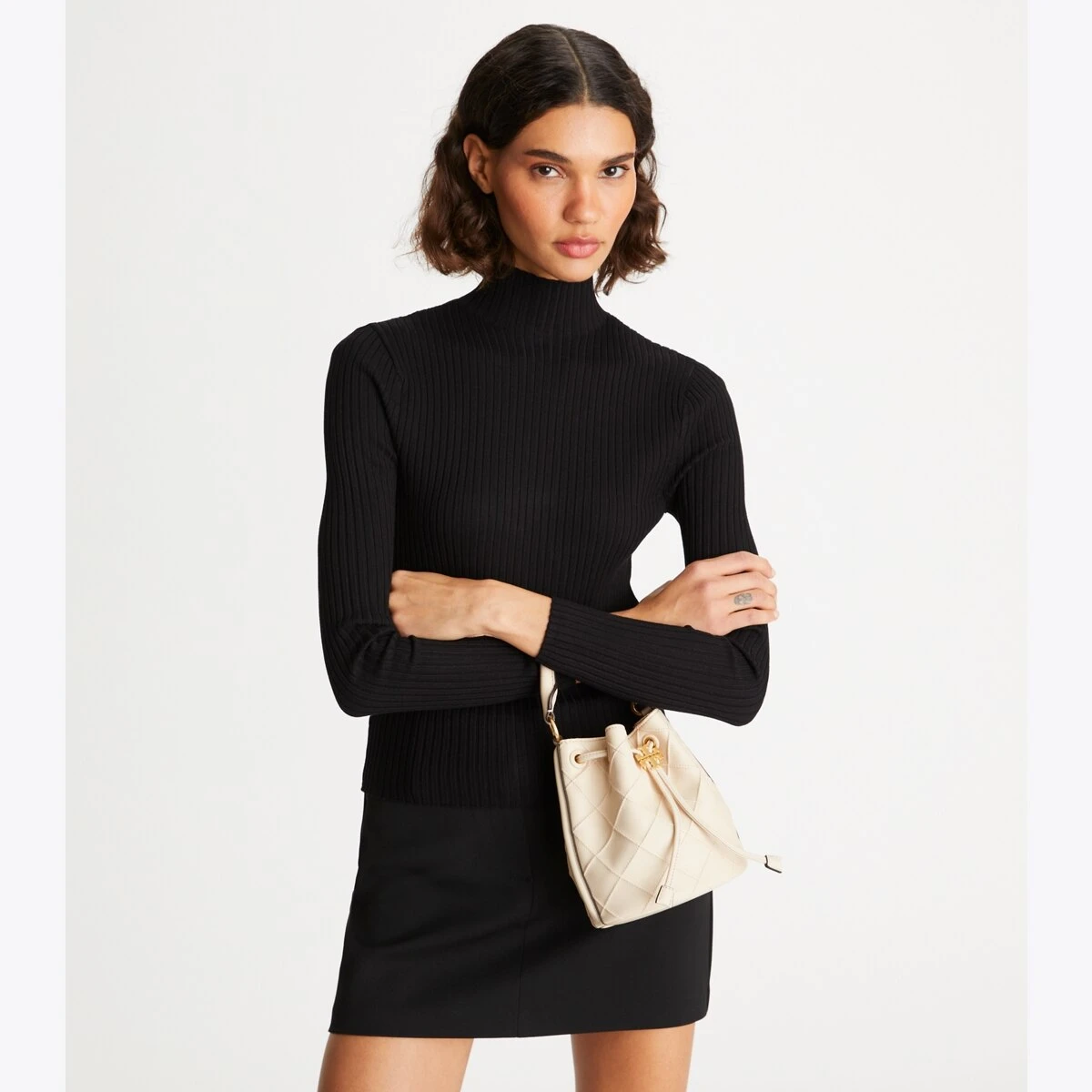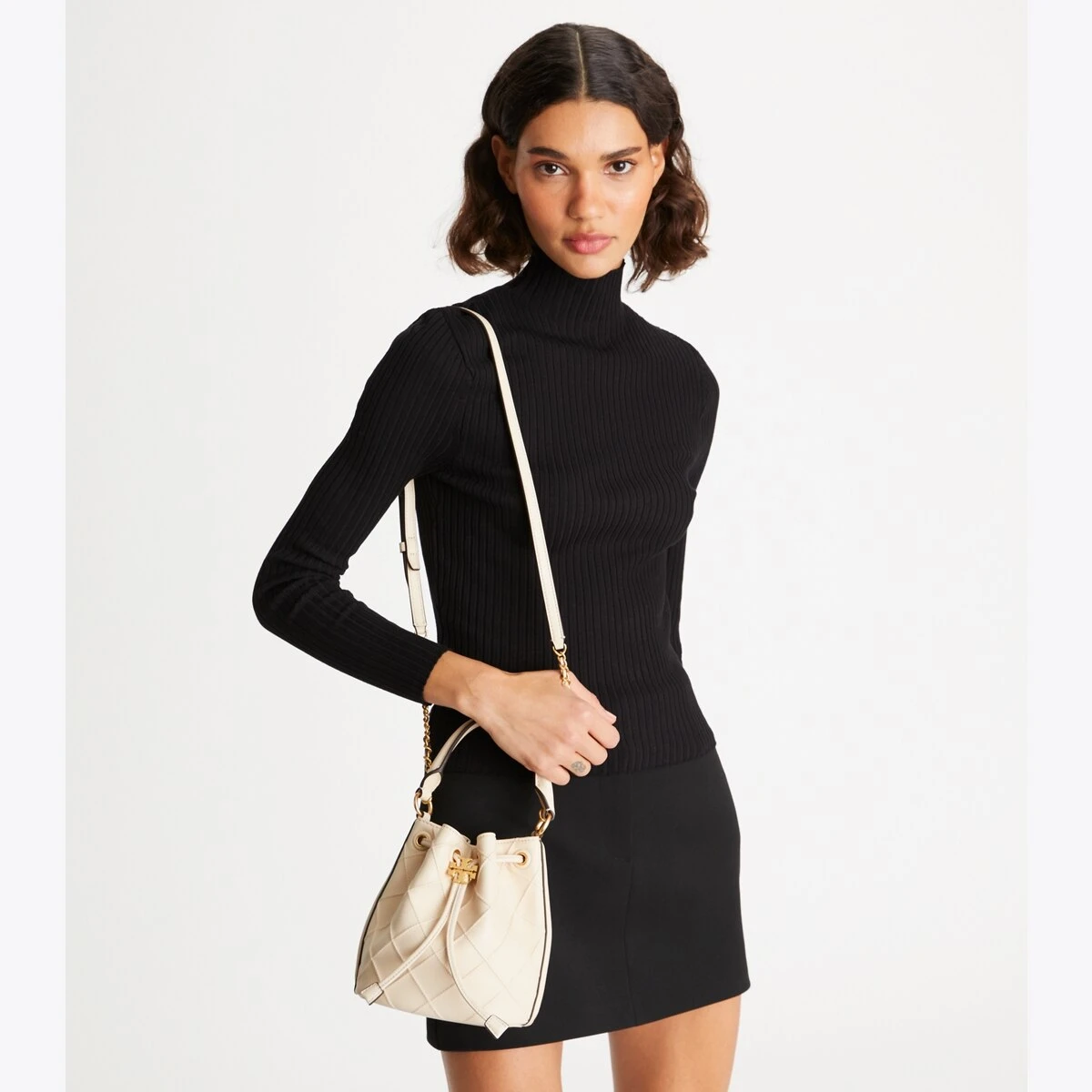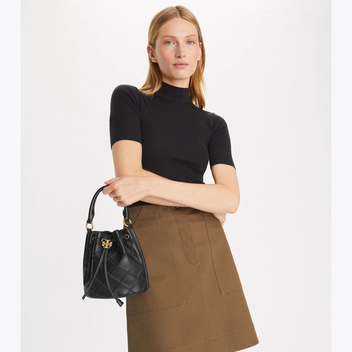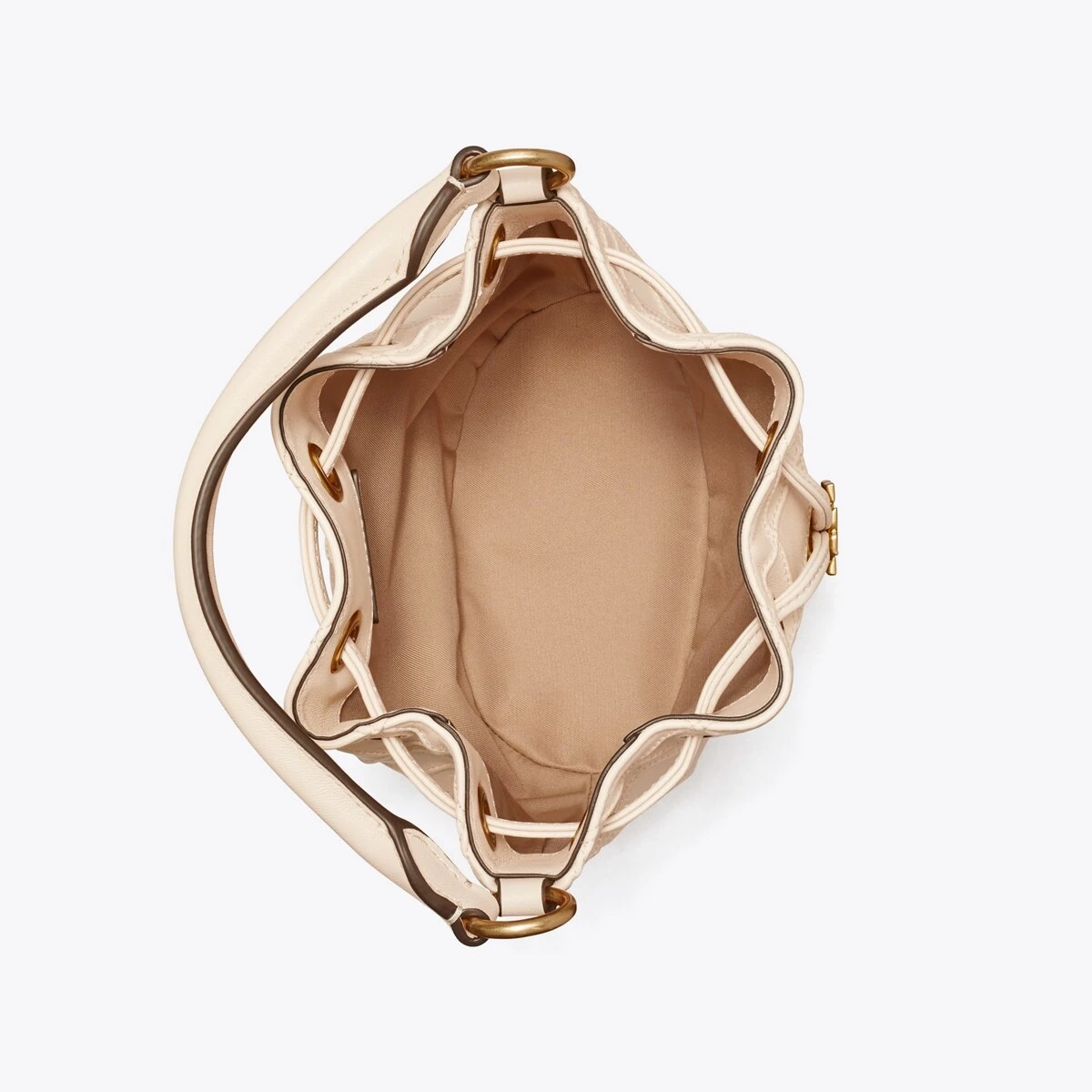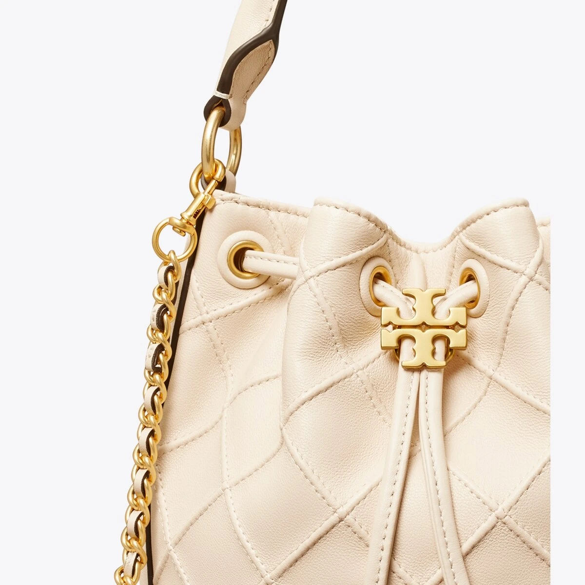 Enduring glamour. The new Fleming Bucket Bag is made of the softest leather with pintucks in a diamond pattern. Our Double T cord stopper works as a keeper for the drawstrings.
