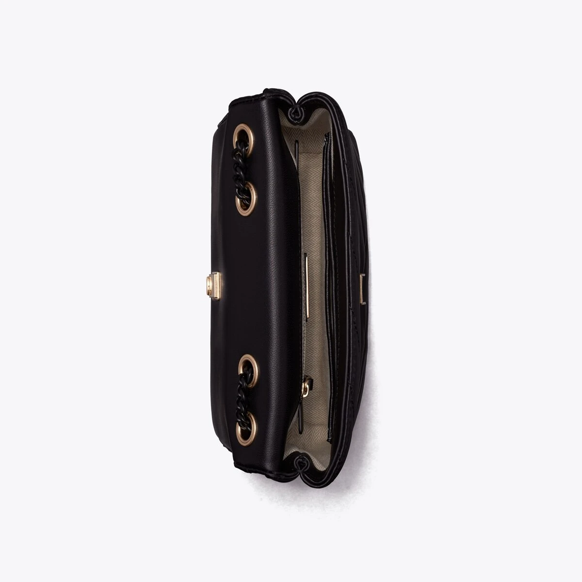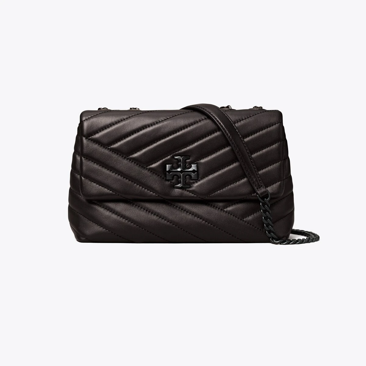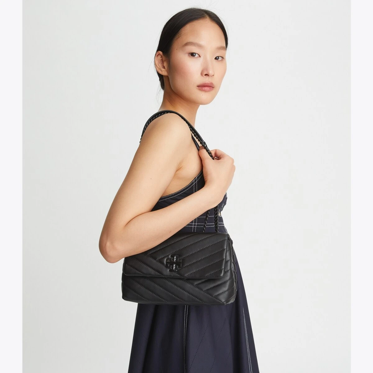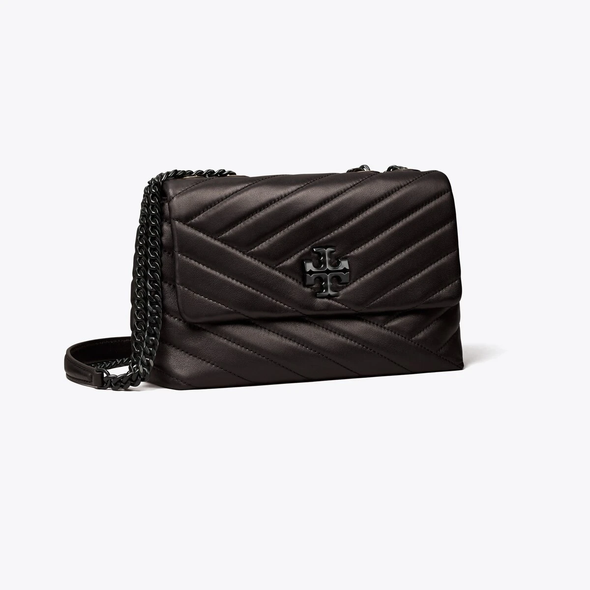 The Small Kira Convertible Shoulder Bag plays with tonal texture: powder-coated hardware on soft chevron-quilted leather. An adjustable chain strap adapts in the moment — doubled over the shoulder, or long and crossbody.