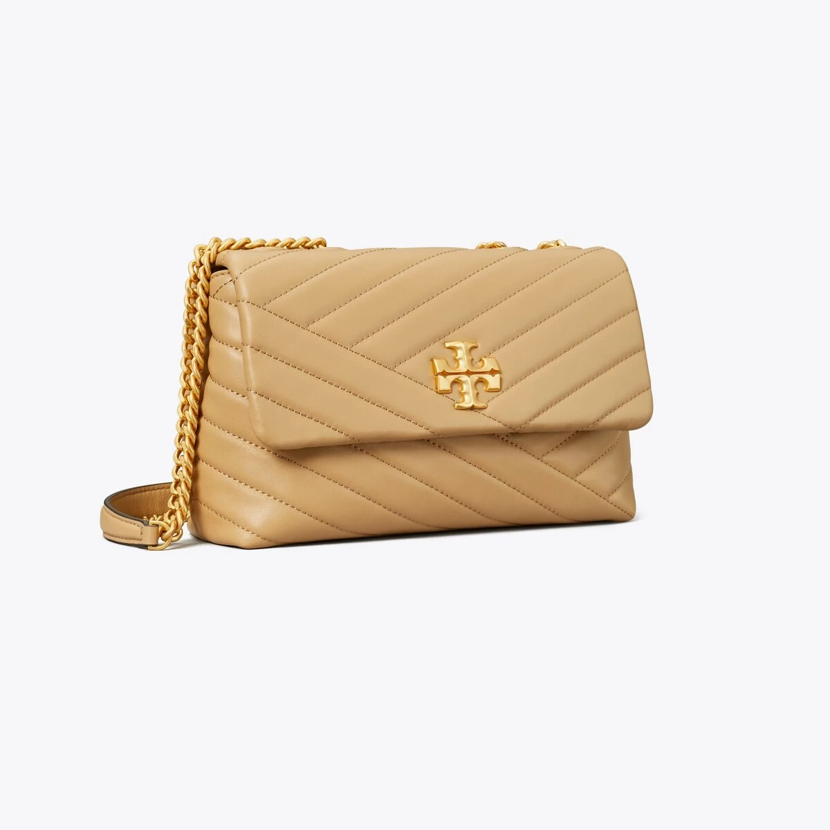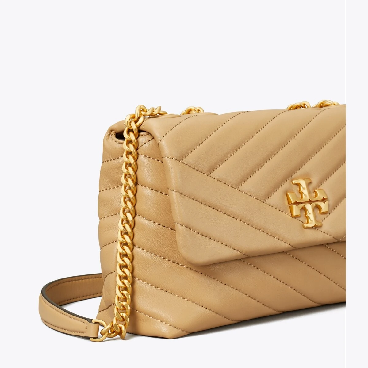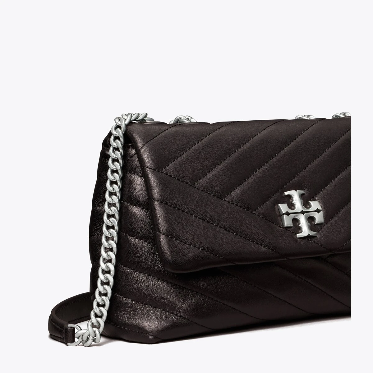 The Small Kira Convertible Shoulder Bag is made of soft chevron-quilted leather with beveled Double T hardware. An adjustable chain strap adapts in the moment — doubled over the shoulder, or long and crossbody.