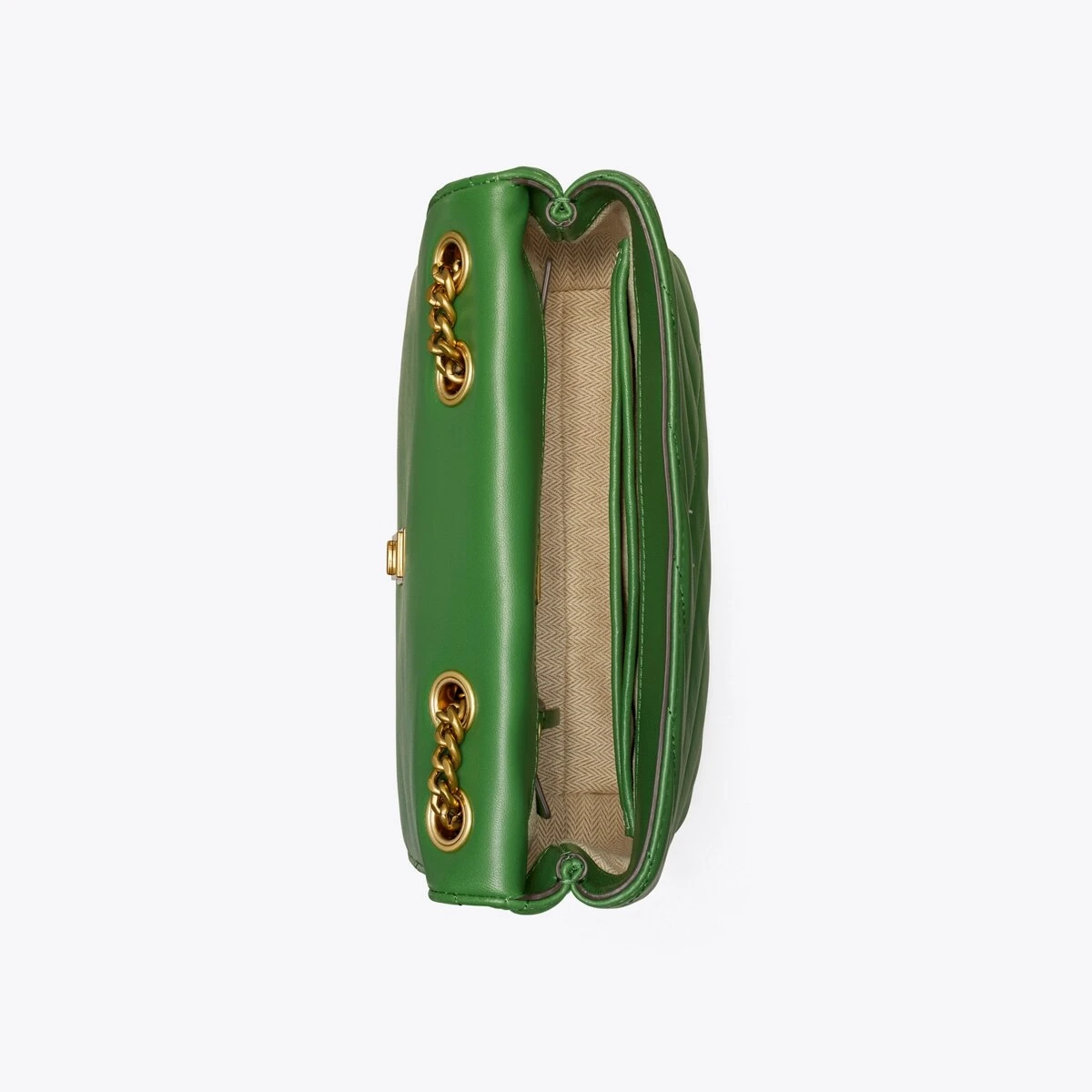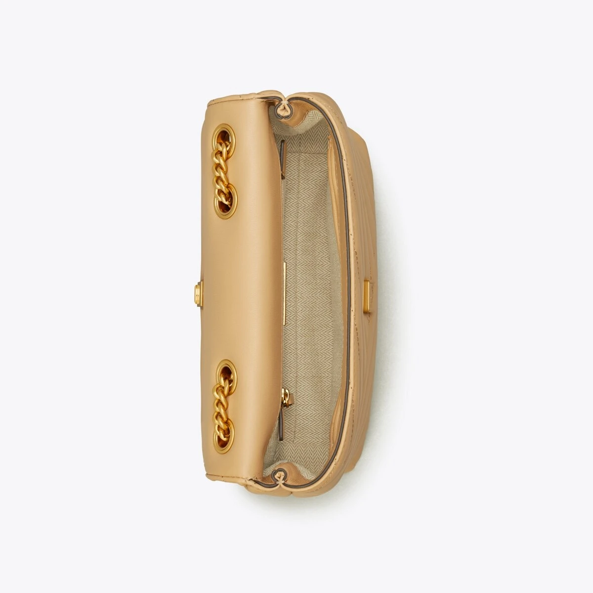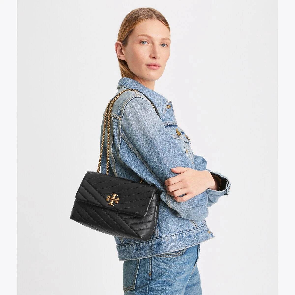 The Small Kira Convertible Shoulder Bag is made of soft chevron-quilted leather with beveled Double T hardware. An adjustable chain strap adapts in the moment — doubled over the shoulder, or long and crossbody.