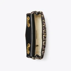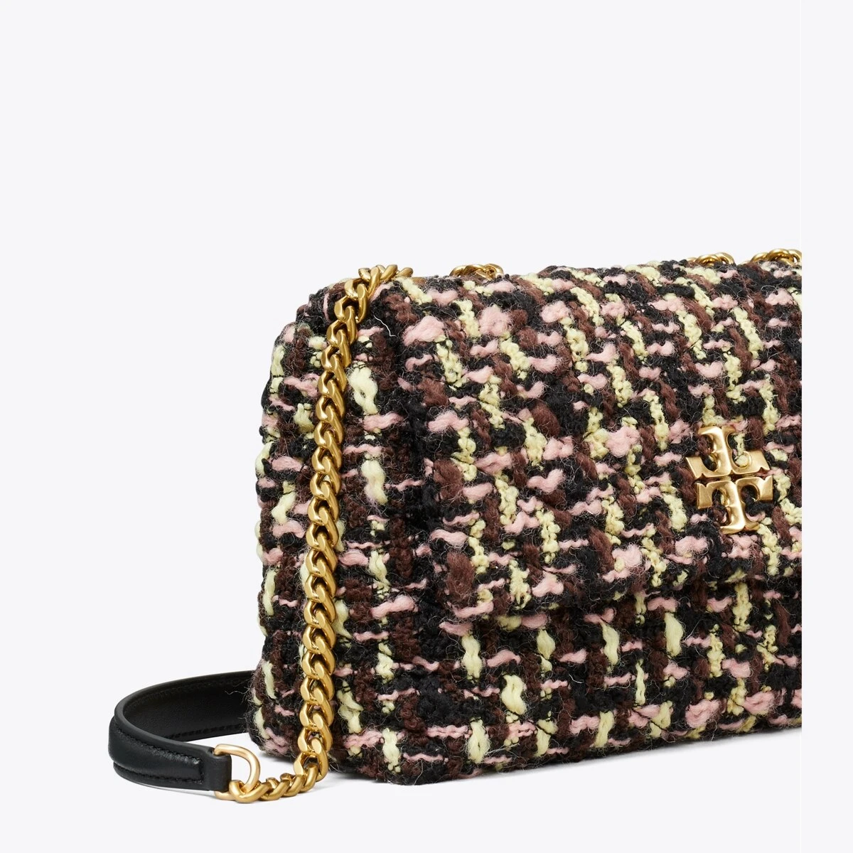 The Small Kira Convertible Shoulder Bag is made of soft tweed with beveled Double T hardware. Wear the adjustable chain strap doubled over the shoulder or long and crossbody.