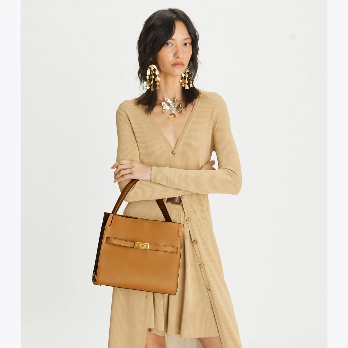 Our Small Lee Radziwill Double Bag contrasts structure and softness, and a mix of materials. Composed of layers that unfold like the collar of a trench coat, it can be worn open, semi-buttoned or fully closed. Beautifully crafted in leather and suede, with signature lock-and-key hardware. The collection is named for Lee Radziwill, who was fearlessly unique.