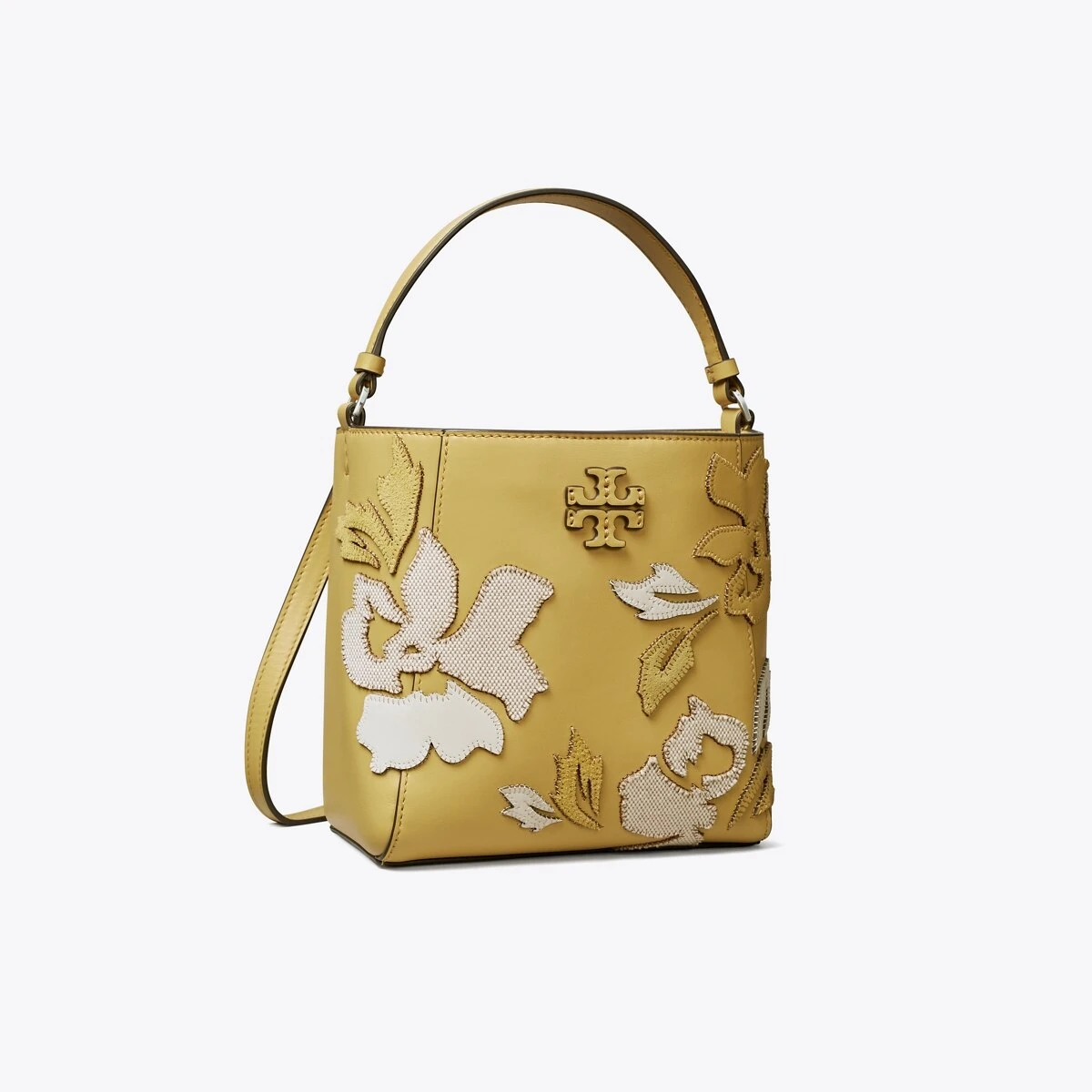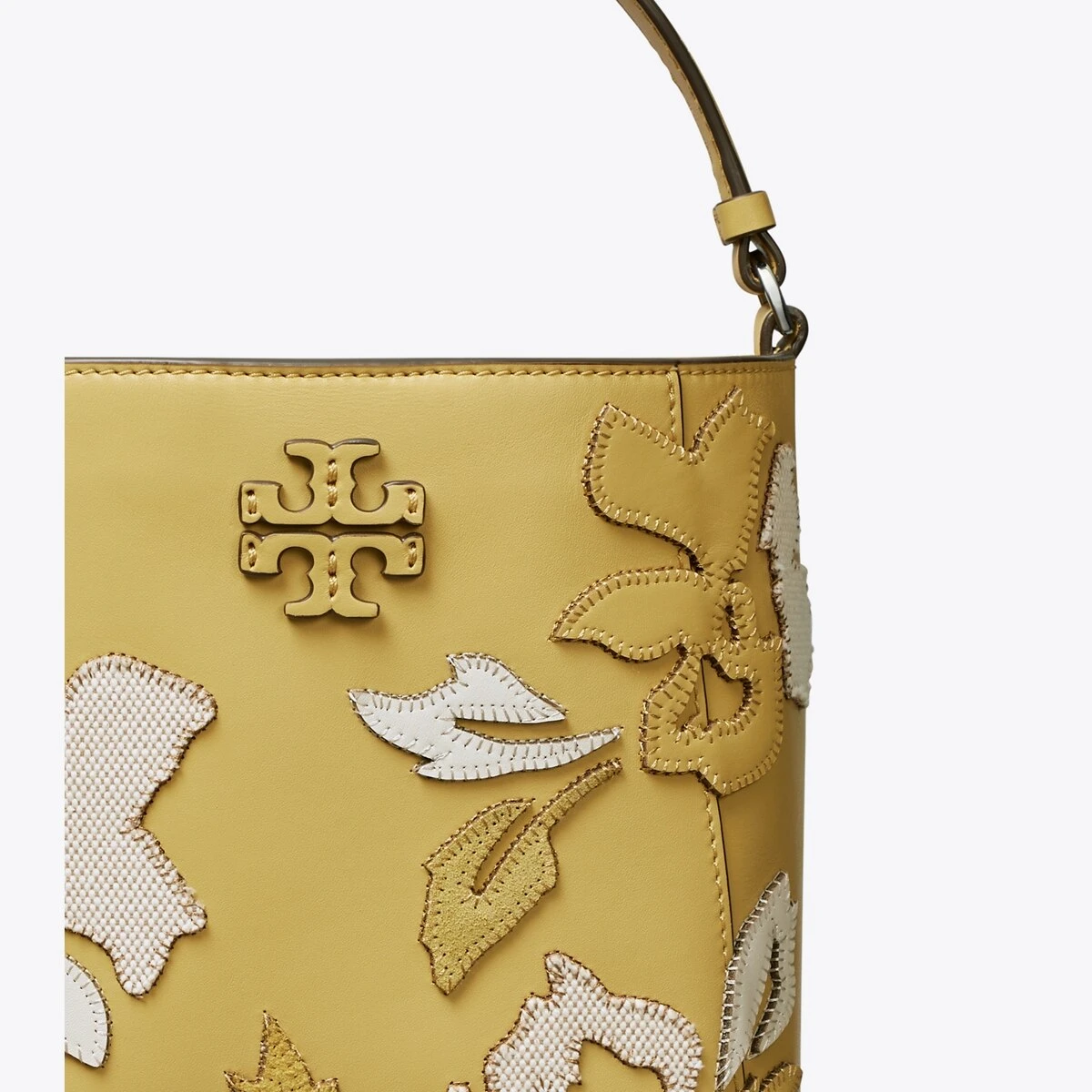 The Small McGraw Bucket Bag has a die-cut Double T and floral appliqués in a mix of leather, suede, and canvas. Carry it two ways: by the top handle or crossbody strap.
