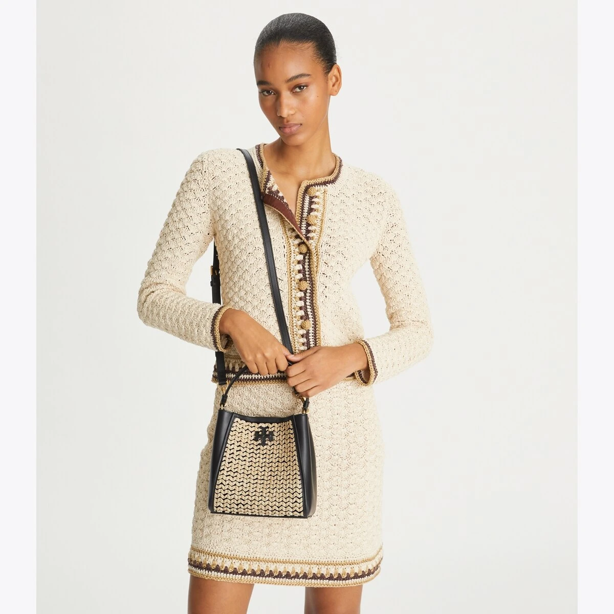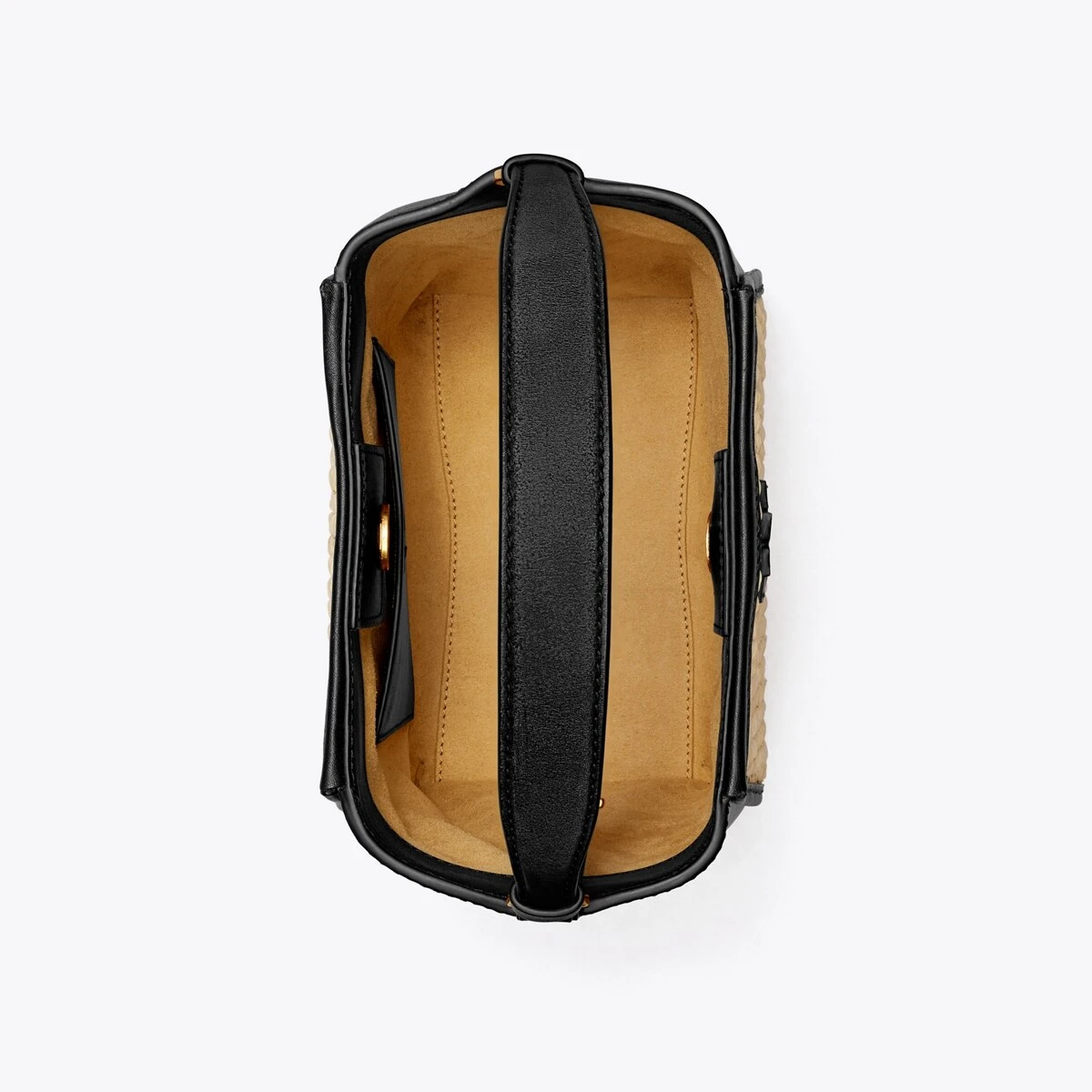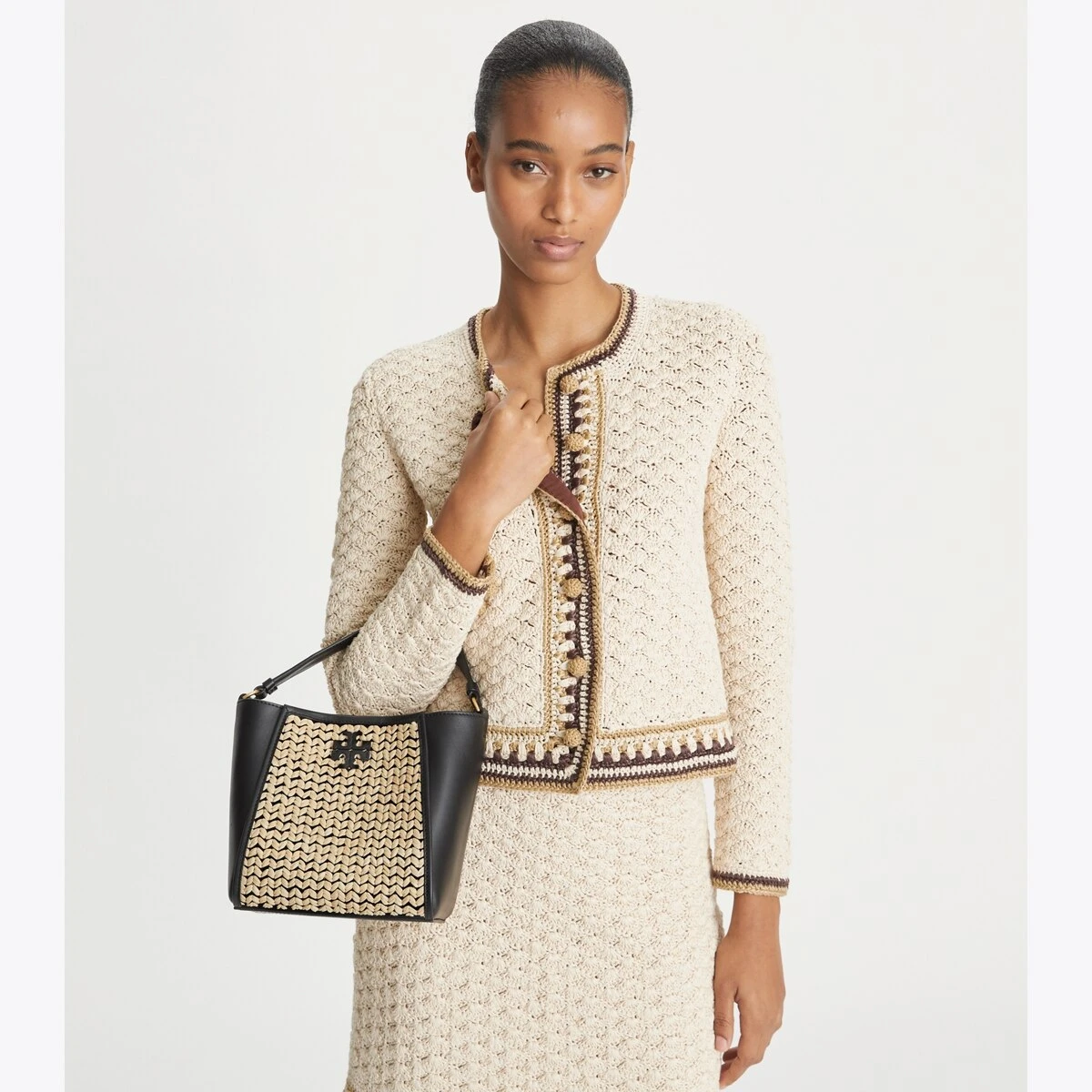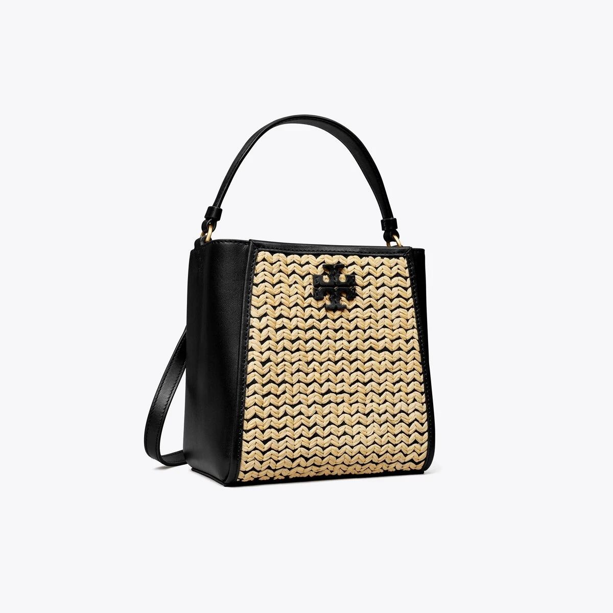 The small McGraw Bucket Bag is made of leather and woven raffia with a die-cut Double T. Carry it two ways: by the top handle or crossbody strap.